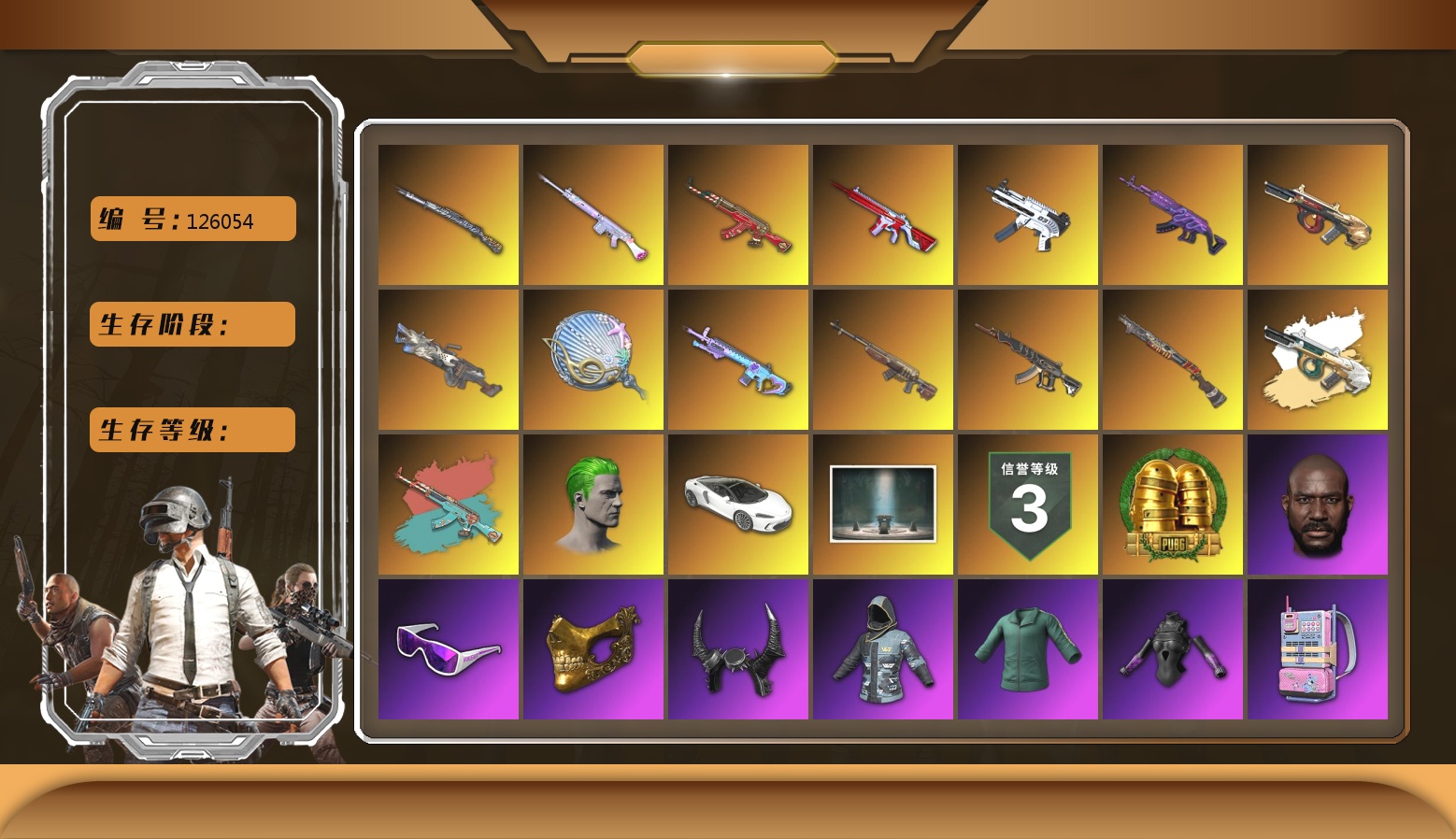 美杜莎762 满级 圣诞AK 满级 无重力MP5K 3 弥诺陶洛斯AUG 3 塞壬平底锅 2 玩偶炮 2 无信号M4 2 妖魔之触 2 时光加农 1 烈日灼烧 1 刻耳柏洛斯M249 1 猛虎98k 1 迈凯伦 捕食者金标 圣诞AK(异色) 弥诺陶洛斯AUG(异色) 魔咒之力Mk12 胜利密室 活动绿东 小兔学院 电磁背包 带改名卡 拉风龙 小马尾 黑鬼 金面 滑雪镜 小丑男 牛角 小战神 粉战神 悲喜 小兔手套 危险玩偶屋 发光手臂
