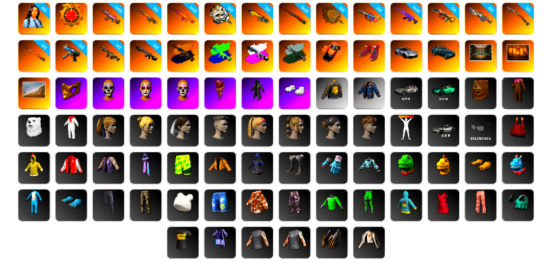 5张图纸 2168聚合物 10级火麒麟 8级南瓜M4 1级美杜莎762 1级时空使者M4 1级冰域Groza 珊瑚色烟雾弹 青色烟雾弹 黄色狂怒之雾-M79 黑绷带 小丑女 迈凯伦硅质白版 交易所接待室 黑鬼 橙色发带 白战神 粉战神 丸子头 西游记 小兔学院 悲喜
