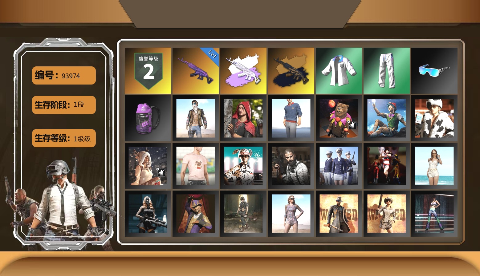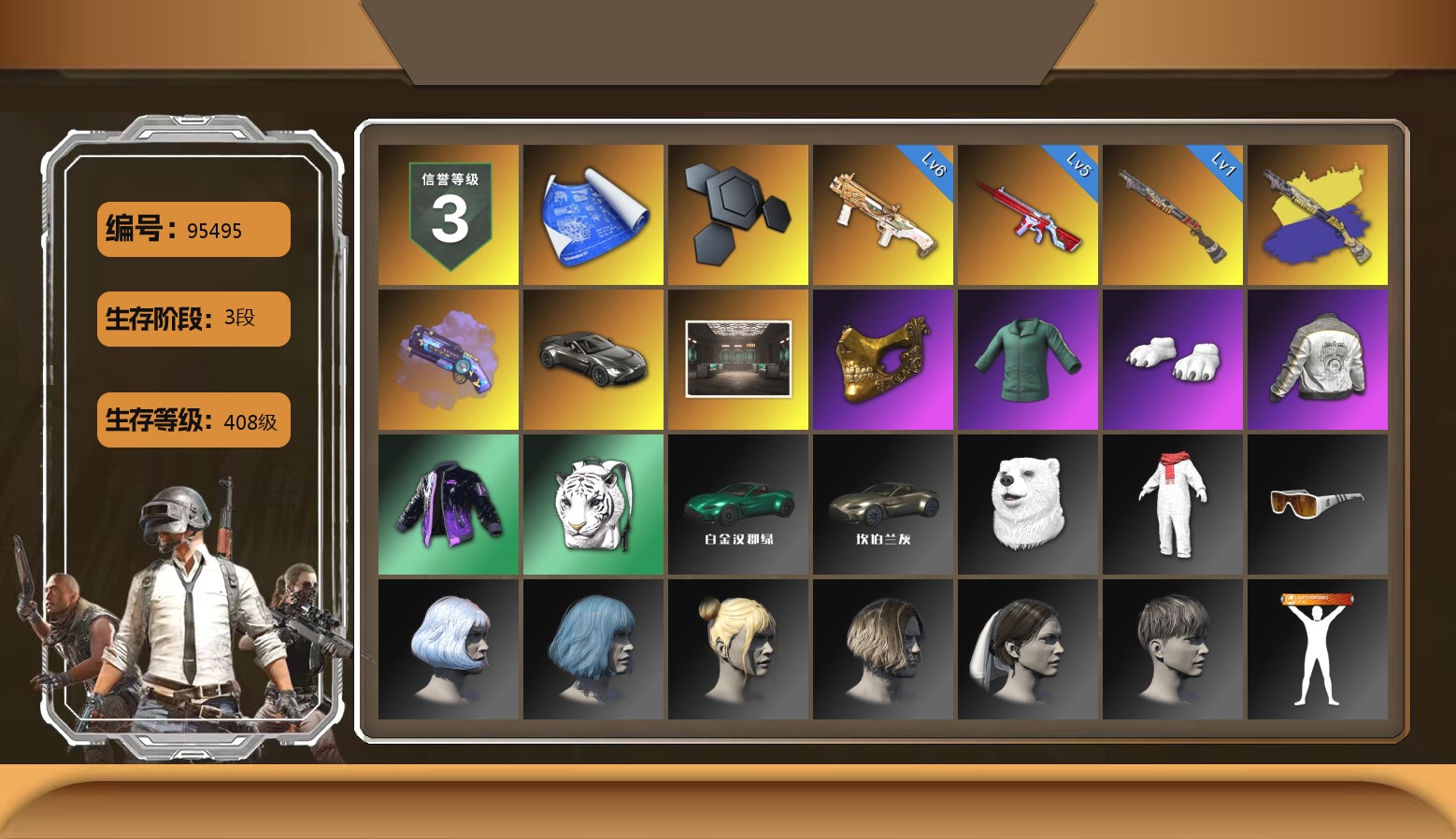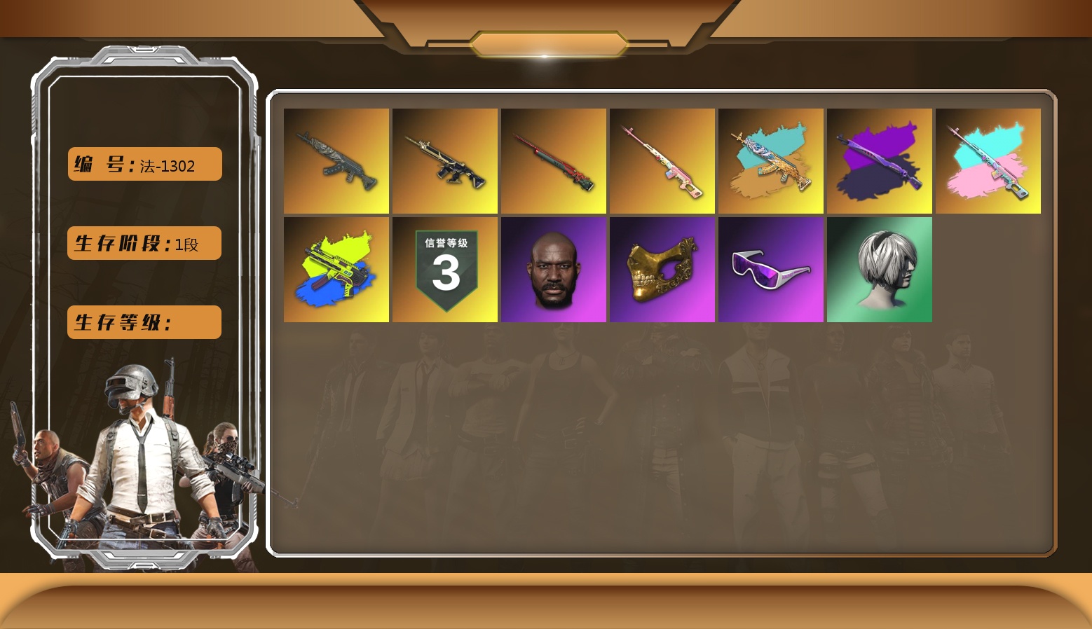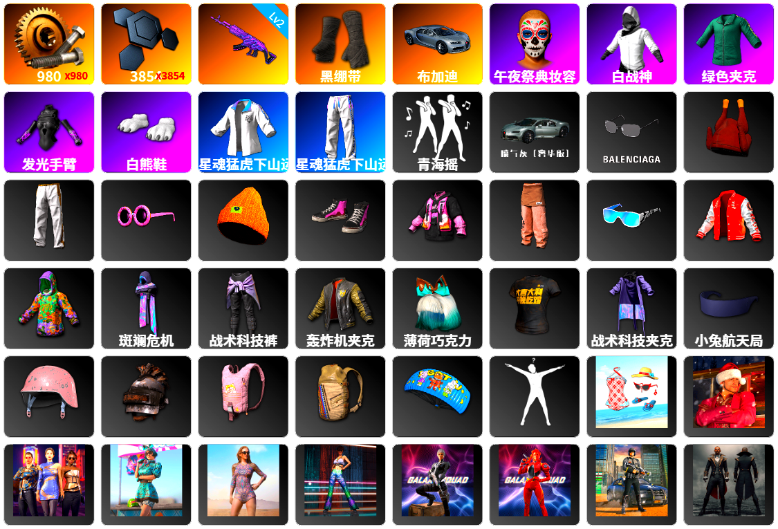 法-1302 450级 信誉等级3 猪八戒m4 10级 青龙762 10级 悟空m24 8级 德拉贡可恢复 异色青龙 异色德拉贡可恢复 无重力可恢复 午夜98k可恢复 异色午夜可恢复 烟枪橙 红鞋 黑大衣 尼尔单套 柏林锅 黑人 2021pgc黄金面具套 滑雪眼镜 白色滑雪眼镜 黑盒手套 滑雪帽子 虎牙夹克 拉风龙套 海盗套 莆田战神套