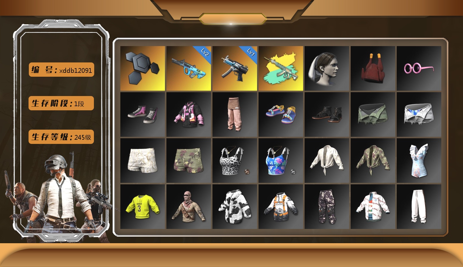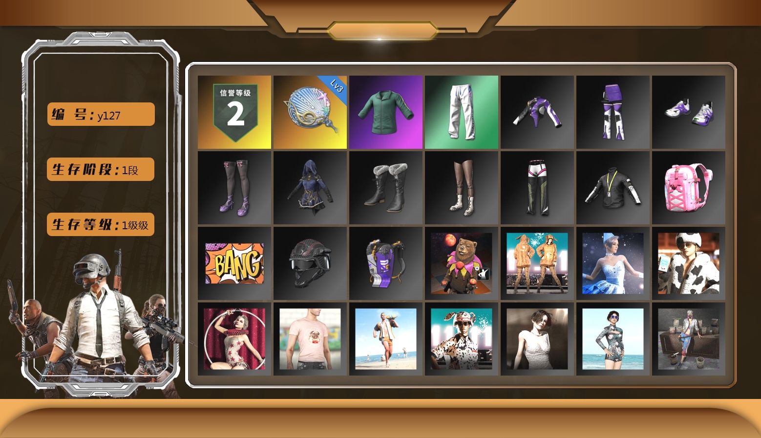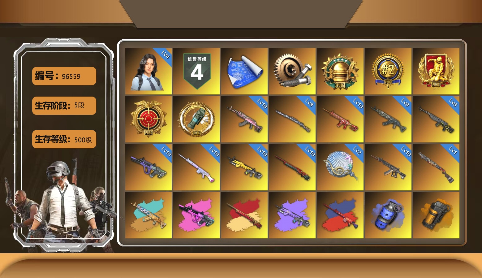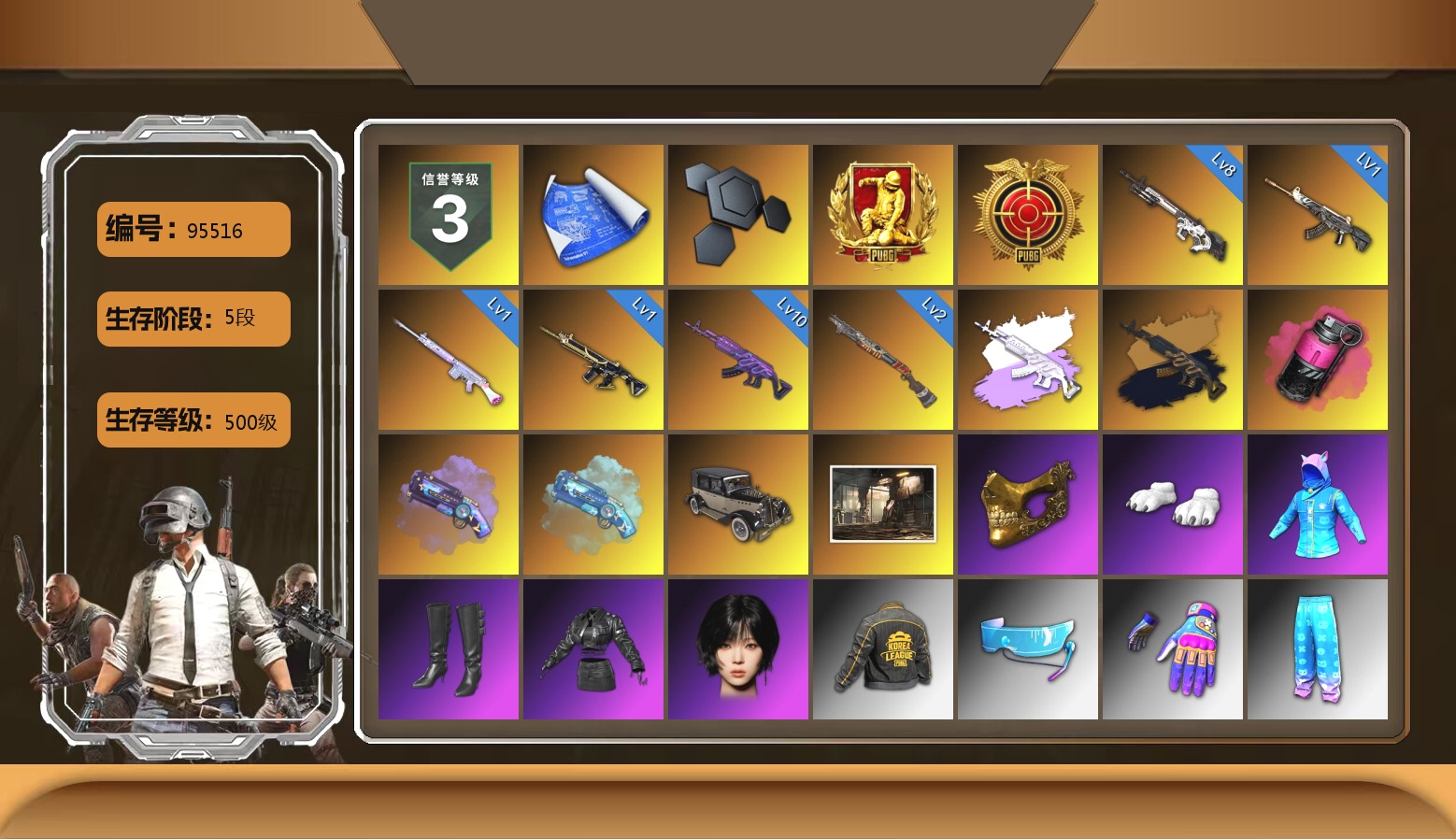 4级瀚娜 10级火麒麟 10级朱雀M4 10级霓虹AUG 10级妖魔之触ACE 10级小兔MK12 10级玩偶炮 10级孙悟空M24 9级青龙762 8级猛虎98k 6级玄武SKS 2级塞壬平底锅 1级烈日灼烧-S1897 霓虹AUG(异色) 小兔MK12(异色) 玩偶炮(异色) 孙悟空M24(异色) 青龙762(异色) 蓝色烟雾弹 橘色烟雾弹 翡翠色烟雾弹 品红色烟雾弹 粉色烟雾弹 橙色狂怒之雾-M79 深红狂怒之雾-M79 紫色魔法迷雾-M79 6张图纸 蜗牛币 柏林鞋 黑绷带 小丑女 小丑男 保时捷卡宴 布加迪奢华版跑车 兰博基尼SUV 迈凯伦玛瑙黑版 马丁敞篷跑车 马丁SUV 胜利密室 陈列室 交易所接待室 黑鬼 9s发型 滑雪镜 金面 渔夫帽 牛角 丑男妆容 内马尔 橙色发带 红面巾 黑大衣 白战神 小战神 活动绿东 发光手臂 电磁背包 萨芬裤 白熊鞋 粉战神 aespa女团 阿狸 尼尔 拉风龙 鸡斯卡夹克 车漆 小马尾 丸子头 西游记 脏辫 青海摇 小兔学院 悲喜 PGC 2021套装 胜利之舞39 枪炮洗礼