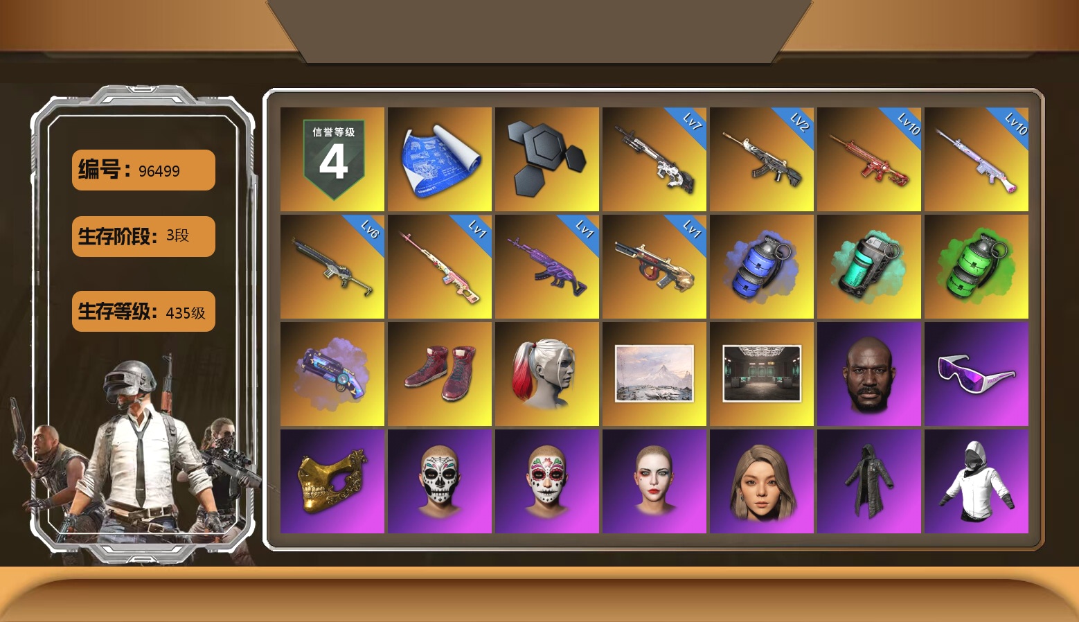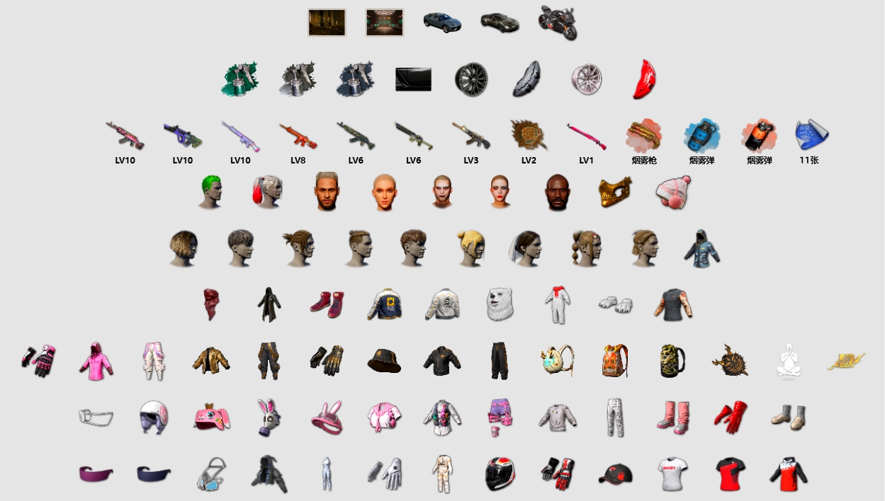10级火麒麟 10级霓虹AUG 10级玩偶炮 8级朱雀M4 6级青龙762 6级沙悟净MINI 3级恶魔ACE 2级唐三藏平底锅 1级午夜惊魂98k 11张图纸 小丑男 小丑女 SUV 跑车 杜卡迪 红面巾 黑大衣 柏林鞋 小战神 白熊鞋 内马尔 黑鬼 金面 滑雪帽