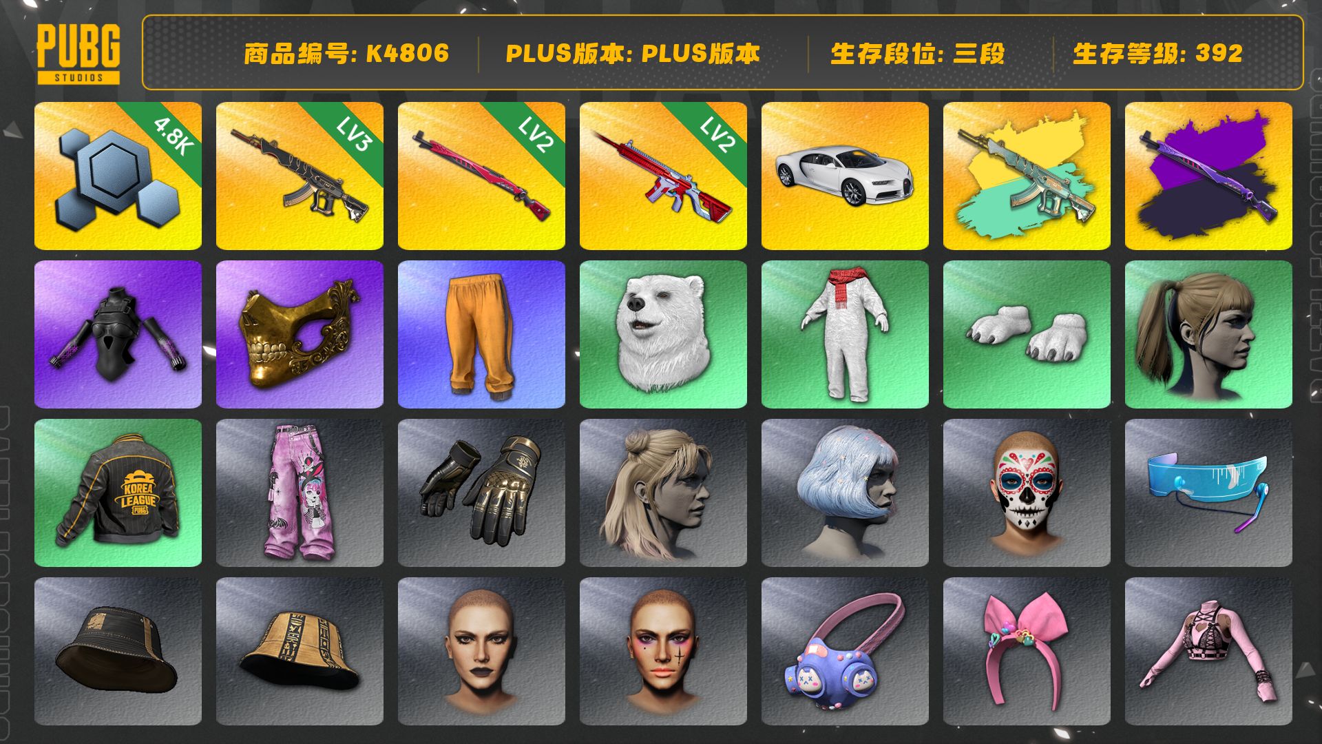 [K4806]3段392级 信誉1 布加迪 3级妖魔+异色 2级98k+异色 2级无信号 金面 发光手3段392级 信誉1 布加迪 3级妖魔+异色 2级98k+异色 2级无信号 金面 发光手