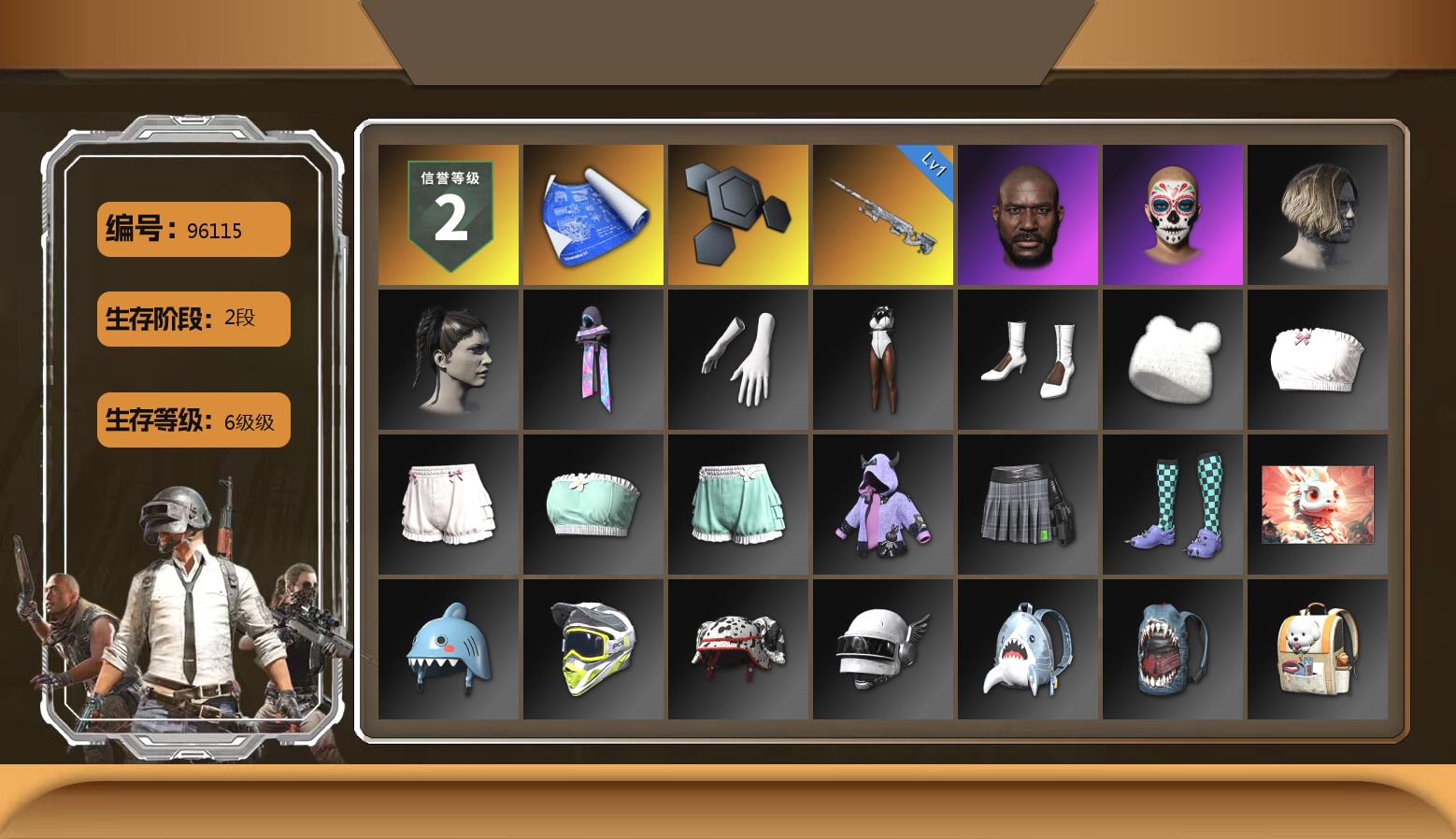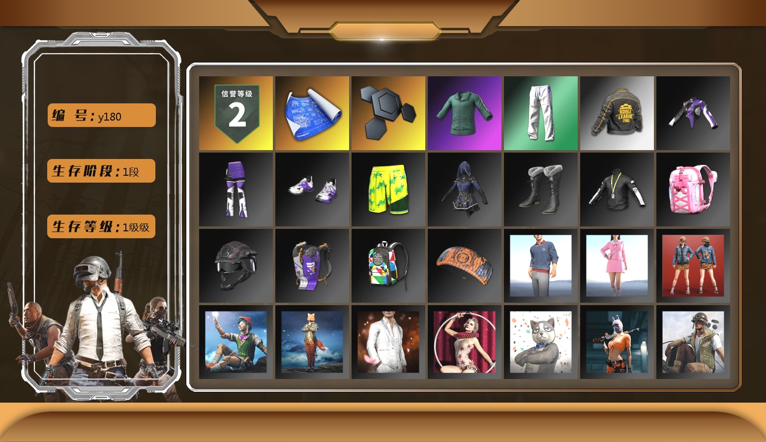 5级妖魔之触ACE 5级孙悟空M24 2级虚空使者 1级美杜莎762 1级无信号M4 1级GD-AUG 1级寒蚀MP5K 1级刻耳柏洛斯M249 1级烈日灼烧-S1897 1级暗影之主Mk12 1级玩偶炮 1级夜曲M24 妖魔之触(异色) 虚空使者(异色) 翡翠色烟雾弹 黄色烟雾弹 蜗牛币 8736聚合物 黑绷带 帕拉梅拉 保时捷911 武器神龛 黑鬼 滑雪镜 金面 渔夫帽 橙色发带 白战神 活动绿东 发光手臂 萨芬裤 白熊鞋 小马尾 青海摇 绷带AK 西游记 枪炮洗礼