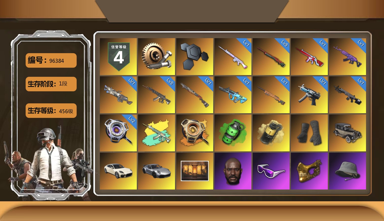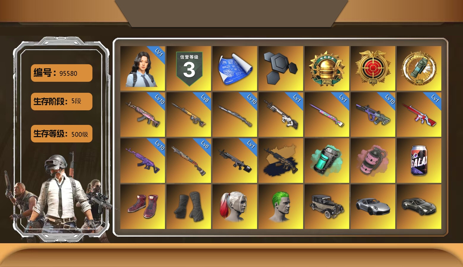 1级瀚娜 10级美杜莎762 10级火麒麟 10级霓虹AUG 10级猛虎98k 8级齿轮炮 6级烈日灼烧-S1897 1级无信号M4 1级暗影之主Mk12 1级赛博MK12 1级彩虹M24 美杜莎(异色) 青色烟雾弹 粉色烟雾弹 7张图纸 4046聚合物 柏林鞋 黑绷带 小丑女 小丑男 保时捷911 马丁跑车 马丁SUV 交易所接待室 aespa 黑鬼 9s发型 滑雪镜 金面 牛角 丑男妆容 红面巾 黑大衣 白战神 小战神 黄东 活动绿东 发光手臂 电磁背包 白熊鞋 粉战神 aespa女团 阿狸 尼尔 拉风龙 车漆 小马尾 丸子头 西游记 脏辫 青海摇 小兔学院 悲喜 绷带AK