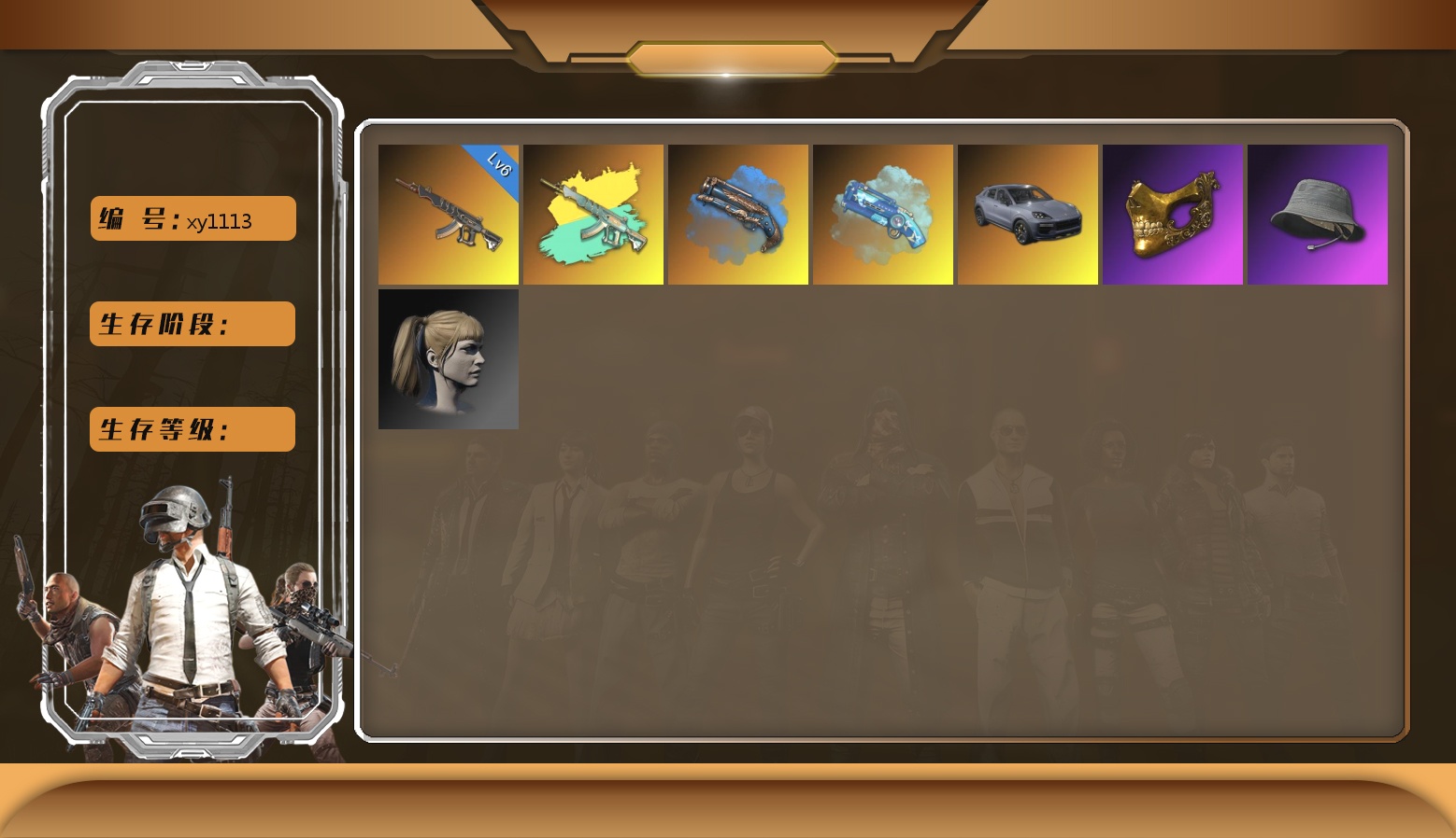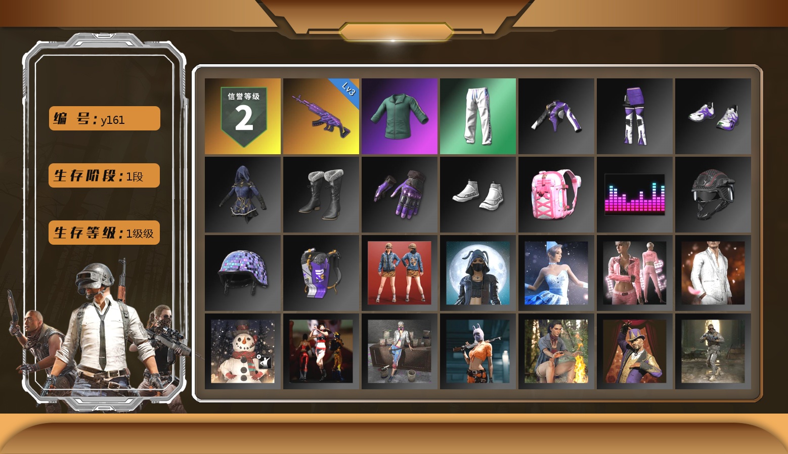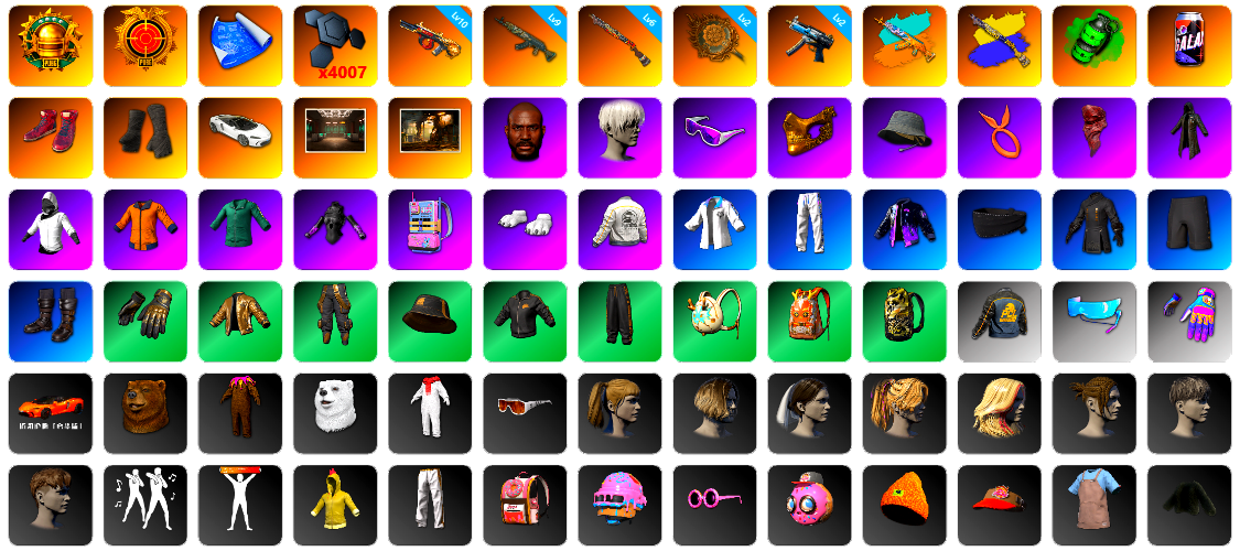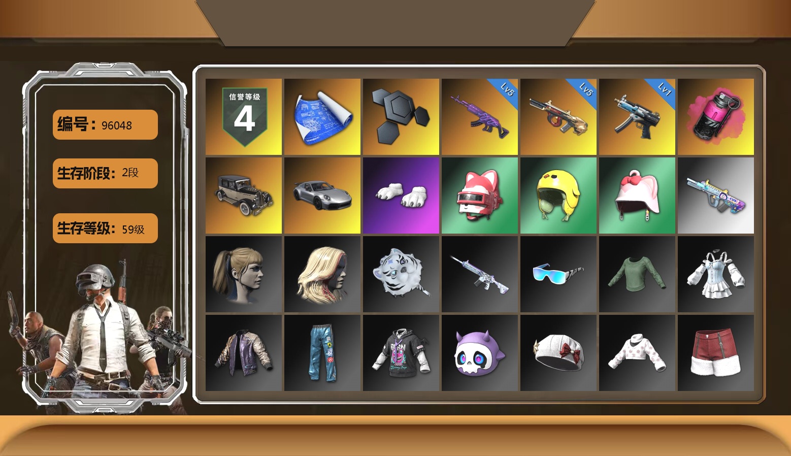 10级爆裂AUG 8级赛博MK12 7级无信号M4 2级美杜莎762 2级塞壬平底锅 1级无重力MP5K 爆裂AUG(异色) 塞壬 - 平底锅(异色) 翡翠色烟雾弹 柏林鞋 兰博基尼SUV 胜利密室 交易所接待室 15张图纸 1981聚合物 黑鬼 金面 红面巾 黑大衣 发光手臂 白熊鞋 阿狸 拉风龙 小马尾 丸子头 西游记 小兔学院 枪炮洗礼