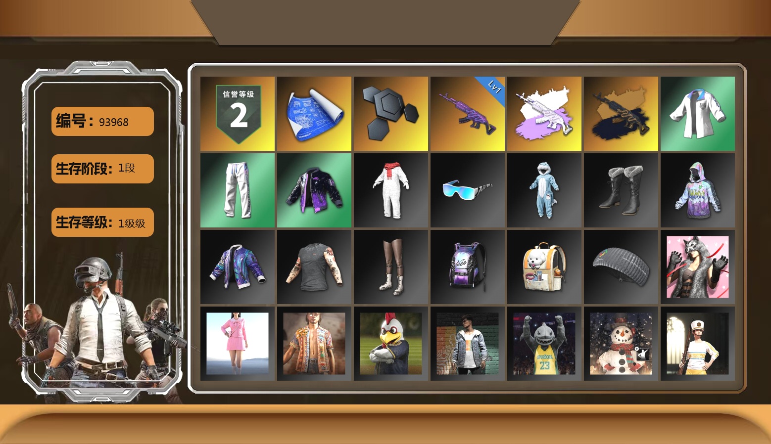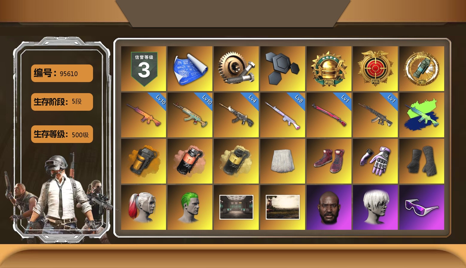2级美杜莎762 2级塞壬平底锅 1级刻耳柏洛斯M249 1级妖魔之触ACE 暗影之主Mk12(异色) 粉色烟雾弹 黑鬼 金面 活动绿东 白熊鞋 小马尾 小兔学院 绷带AK 西游记 PGC 2021套装