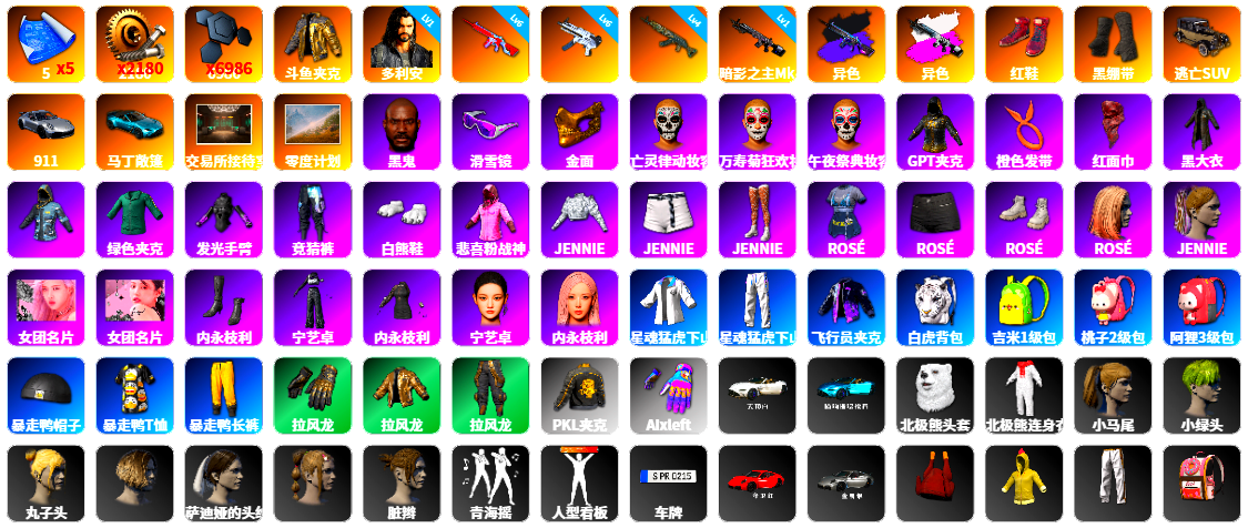 小黑盒 小白裙 10级水麒麟 10级南瓜M4 8级玩偶炮 4级恶魔ACE 1级妖魔之触ACE 1级午夜惊魂98K 南瓜M4(异色) 橘色烟雾弹 珊瑚色烟雾弹 黄色烟雾弹 8张图纸 9547聚合物 蜗牛币 柏林鞋 黑绷带 小丑女 小丑男 交易所接待室 黑鬼 9s发型 滑雪镜 金面 卡崔娜 丑男妆容 马东锡 红面巾 黑大衣 白战神 小战神 发光手臂 竞猜裤 萨芬裤 明月裤 白熊鞋 粉战神 女团 aespa女团 阿狸 尼尔 拉风龙 鸡斯卡夹克 小马尾 小绿头 粉头 丸子头 西游记 脏辫 青海摇 小兔学院 悲喜 绷带AK 滑雪帽 枪炮洗礼
