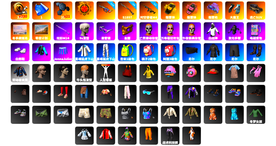 蜗牛币 1张图纸 21聚合物 10级爆裂AUG 6级烈日灼烧-S1897 1级时空使者M4 黄色烟雾弹 粉色烟雾弹 紫色魔法迷雾-M79 大魔王 冬季藏匿处 9s发型 滑雪镜 金面 白战神 发光手臂 电磁背包 白熊鞋 阿狸 尼尔 小兔学院