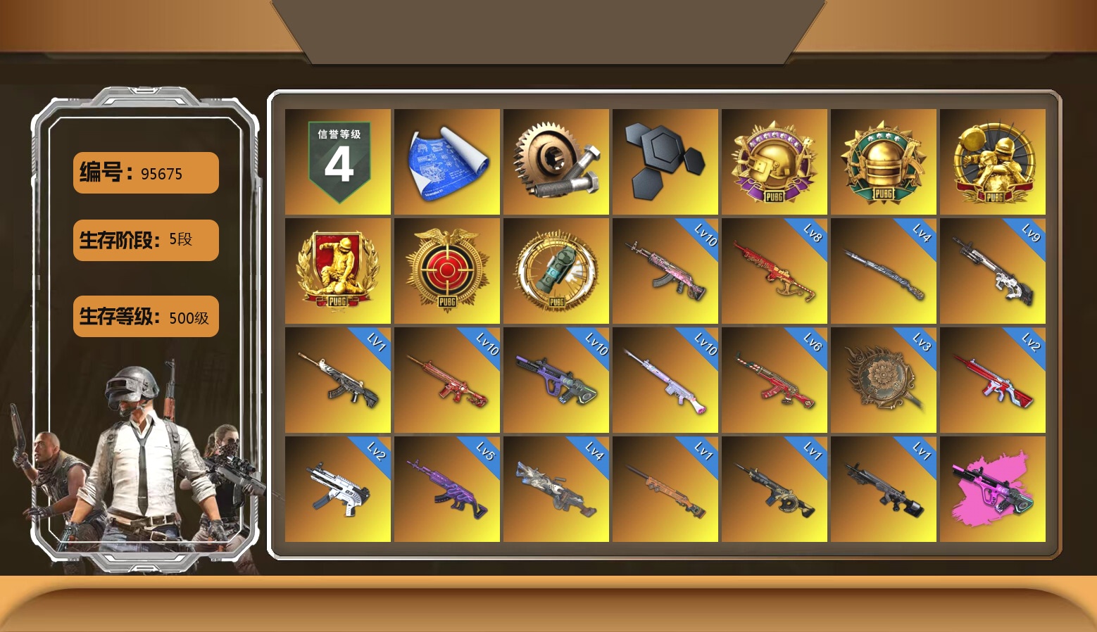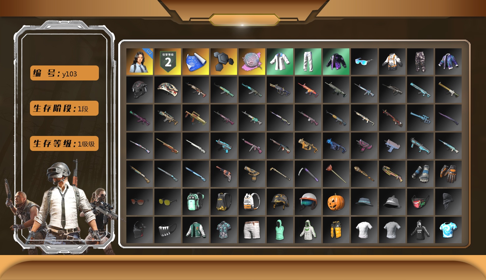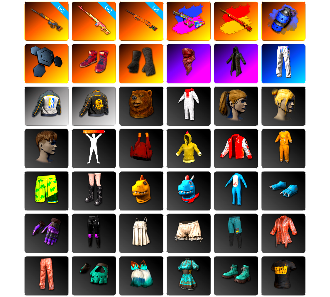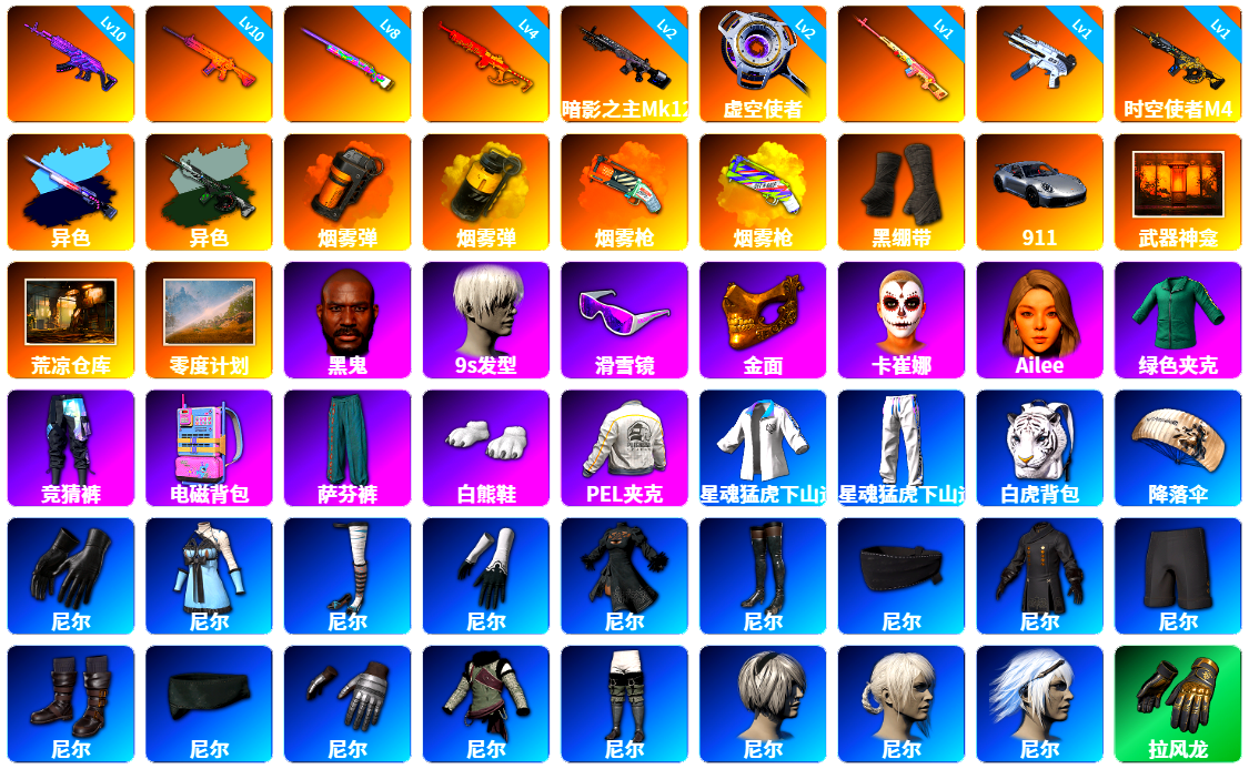 收割者金标 10级火麒麟 10级朱雀M4 10级霓虹AUG 10级玩偶炮 9级赛博MK12 8级圣诞mini 6级圣诞AK 5级美杜莎762 4级刻耳柏洛斯M249 4级猛虎98k 3级唐三藏平底锅 2级无信号M4 2级无重力MP5K 1级时空使者M4 1级恶魔ACE 1级暗影之主Mk12 1级夜曲M24 霓虹AUG(异色) 圣诞AK(异色) M249(异色) 虚空使者(异色) 橘色烟雾弹 粉色烟雾弹 黄色狂怒之雾-M79 3张图纸 9074聚合物 蜗牛币 柏林鞋 布加迪跑车 布加迪奢华版跑车 兰博基尼跑车 兰博基尼SUV 兰博基尼奢华版 迈凯伦硅质白版 马丁SUV 杜卡迪翡翠绿 女团大厅 胜利密室 兰博大厅 冬季藏匿处 交易所接待室 武器神龛 黑鬼 MINJI 滑雪镜 金面 牛角 橙色发带 红面巾 黑大衣 白战神 黄东 发光手臂 竞猜裤 白熊鞋 粉战神 2024女团 小黄鸭 车漆 小马尾 丸子头 西游记 小兔学院 悲喜 滑雪帽 PGC 2021套装 胜利之舞39