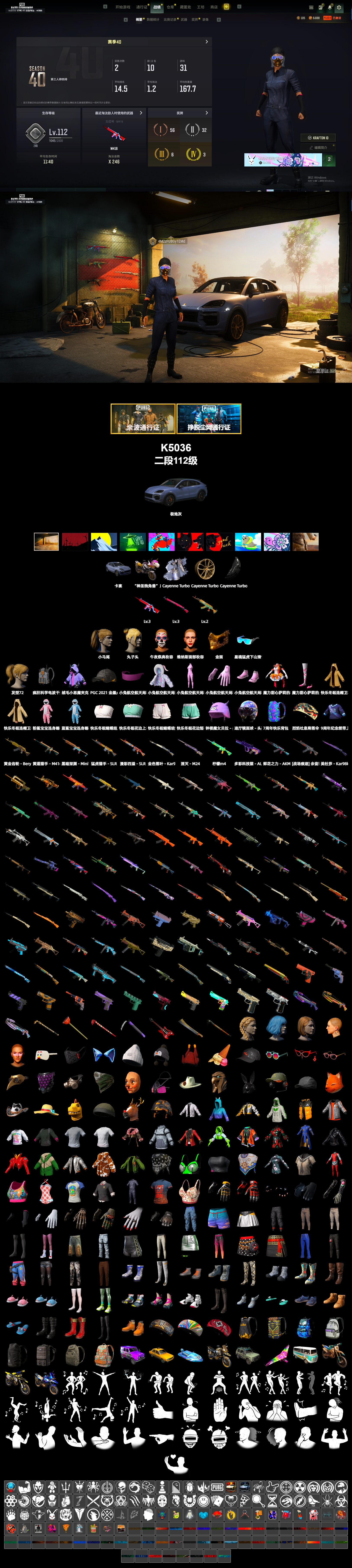 [K5036]2段112级,信誉2,2级水麒麟,无信号M416,3级午夜惊魂98K,保时捷,保时捷卡宴,金面,星魂虎虎生威大礼包,丸子头,小马尾