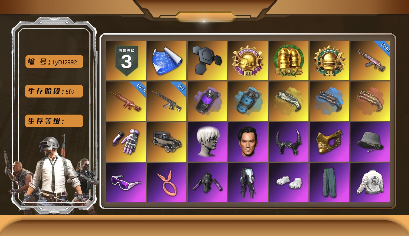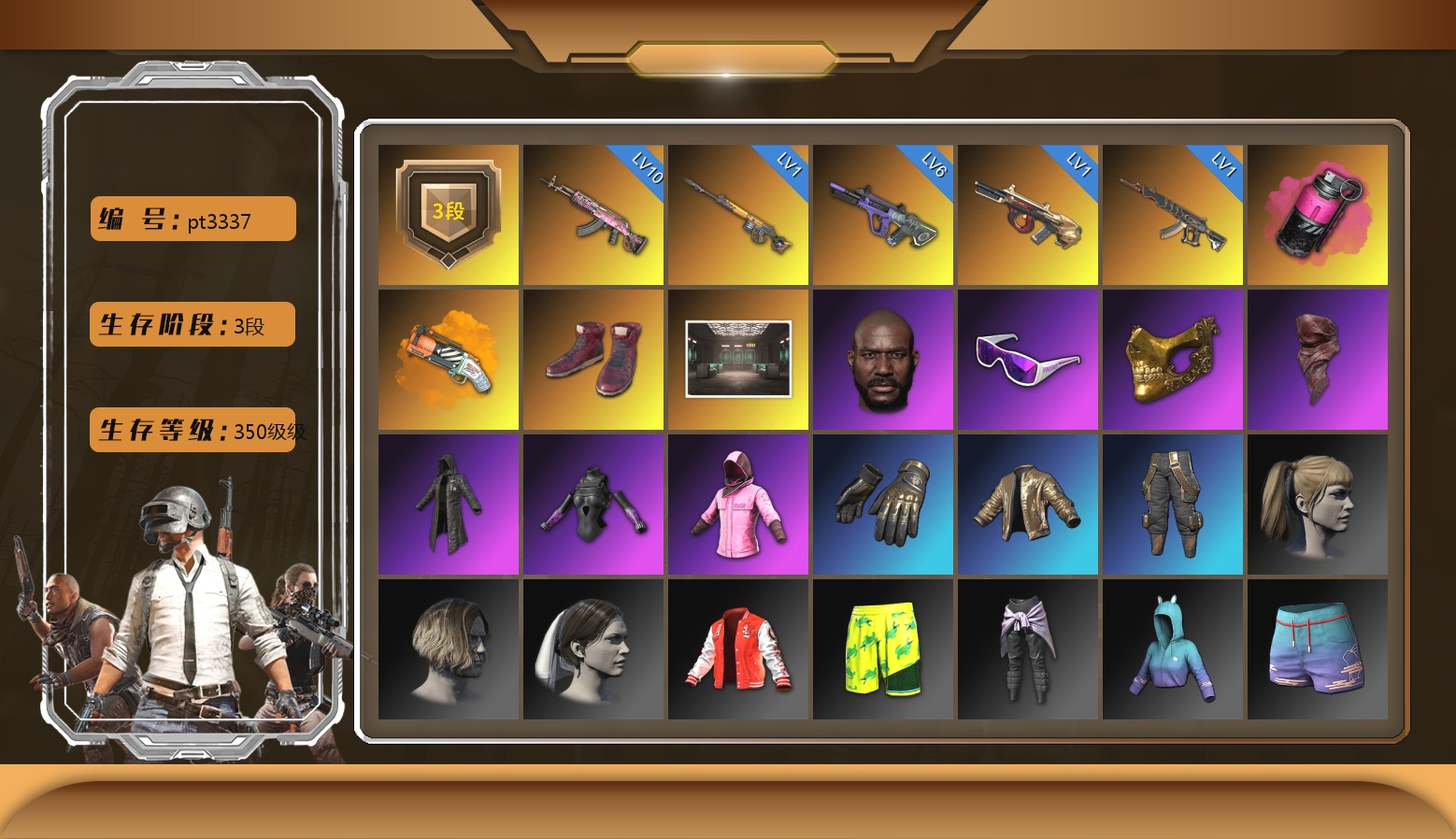 生存3阶段 10级火麒麟 6级霓虹AUG 1级齿轮炮 1级弥诺陶洛斯AUG 1级妖魔之触ACE 品红色烟雾弹 橙色狂怒之雾-M79 柏林鞋 交易所接待室 黑鬼 滑雪镜 金面 红面巾 黑大衣 发光手臂 粉战神 拉风龙 小马尾 小兔学院 悲喜 西游记 滑雪帽