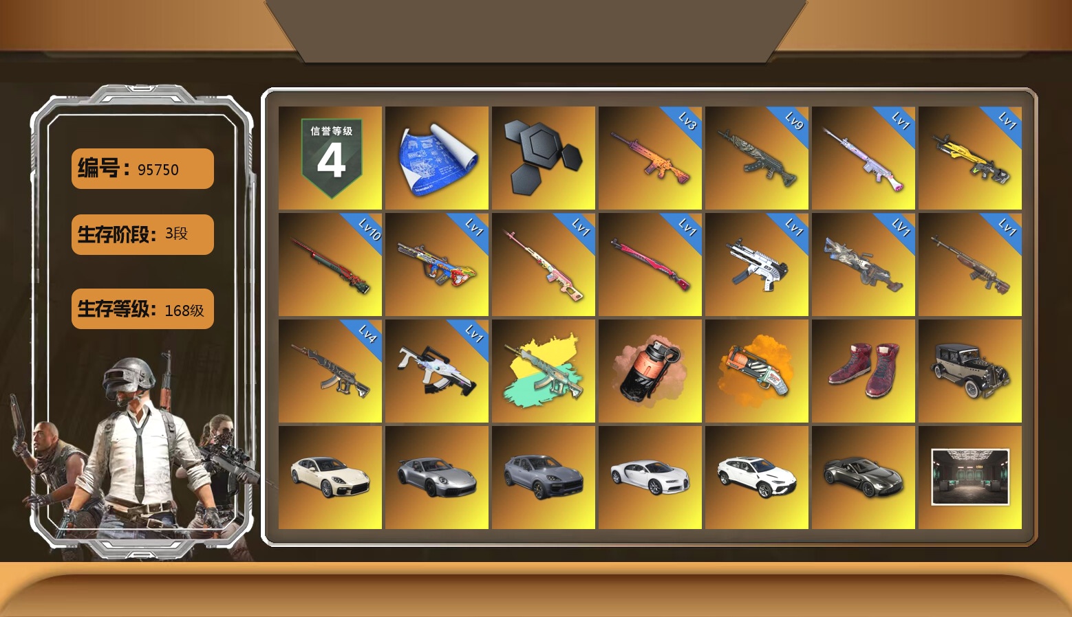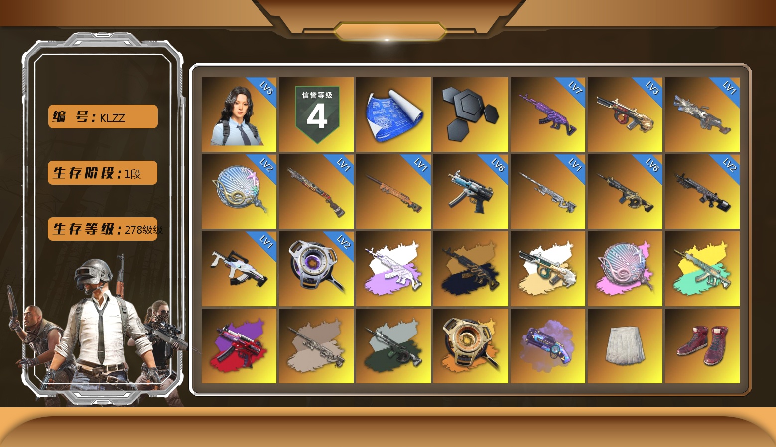 7级美杜莎762 6级寒蚀MP5K 6级时空使者M4 5级瀚娜 3级弥诺陶洛斯AUG 2级塞壬平底锅 2级暗影之主Mk12 2级虚空使者 1级刻耳柏洛斯M249 1级烈日灼烧-S1897 1级夜曲M24 1级幽影残魂AWM 1级冰域Groza 美杜莎(异色) 弥诺陶洛斯AUG(异色) 塞壬 - 平底锅(异色) 妖魔之触(异色) 寒蚀MP5K(异色) AWM(异色) 时空使者M4(异色) 虚空使者(异色) 紫色魔法迷雾-M79 小白裙 柏林鞋 黑绷带 保时捷卡宴 布加迪跑车 陈列室 武器神龛 1张图纸 42448聚合物 黑鬼 滑雪镜 金面 渔夫帽 牛角 红面巾 白战神 活动绿东 发光手臂 电磁背包 白熊鞋 粉战神 拉风龙 小马尾 丸子头 脏辫 小兔学院 悲喜 绷带AK 西游记