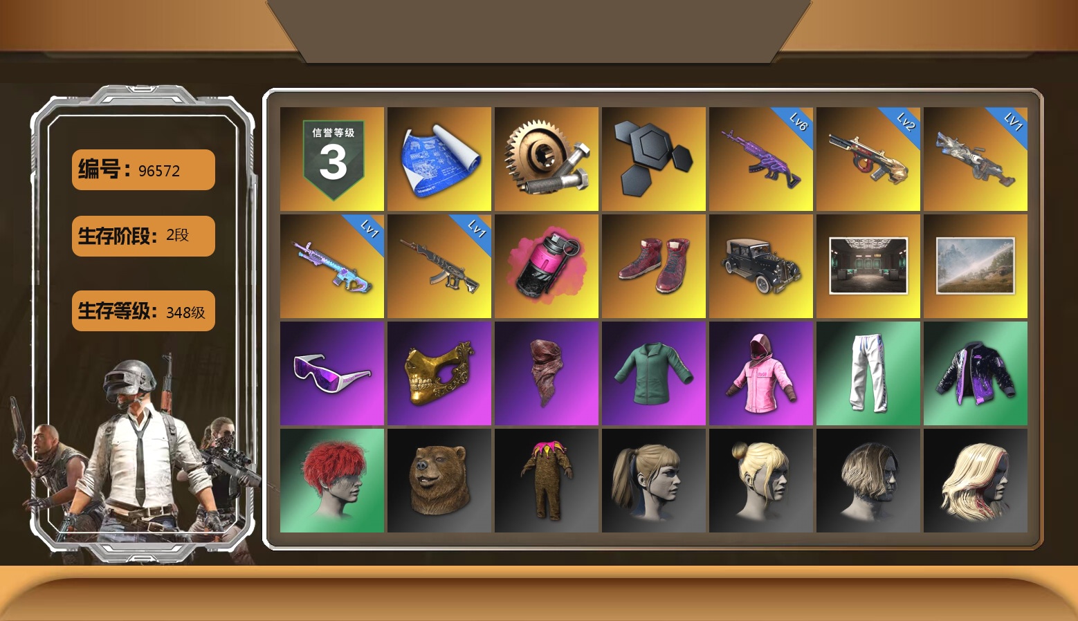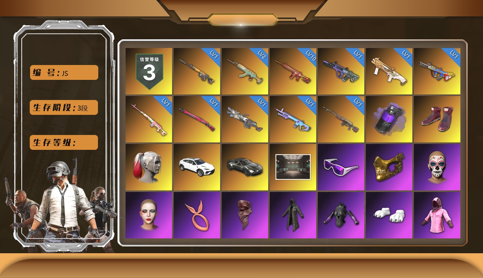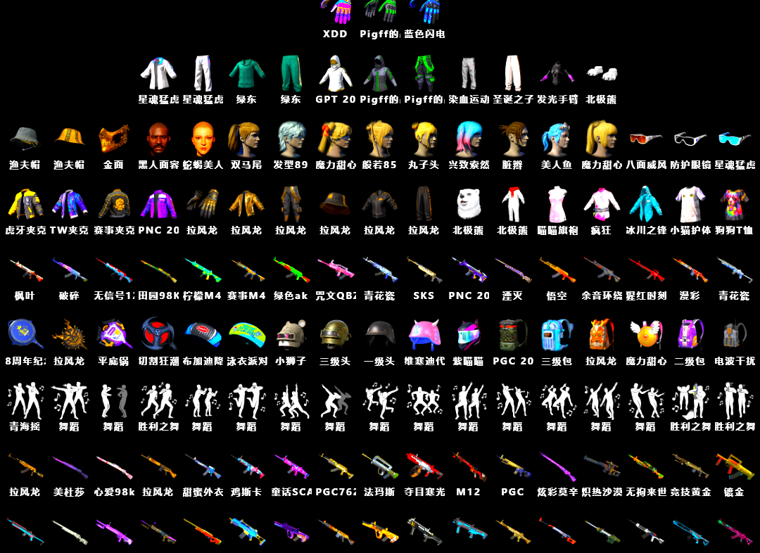 10级朱雀M4 2级水麒麟 1级齿轮炮 1级霓虹AUG 1级DBS 1级爆裂AUG 1级德拉贡 1级午夜惊魂98K 1级刻耳柏洛斯M249 1级魔咒之力Mk12 1级时光加农SKS 紫色烟雾弹 柏林鞋 小丑女 兰博基尼SUV 马丁跑车 交易所接待室 滑雪镜 金面 橙色发带 红面巾 黑大衣 发光手臂 白熊鞋 粉战神 女团 2024女团 滑雪帽 拉风龙 小马尾 丸子头 小兔学院 悲喜 绷带AK PGC 2021套装