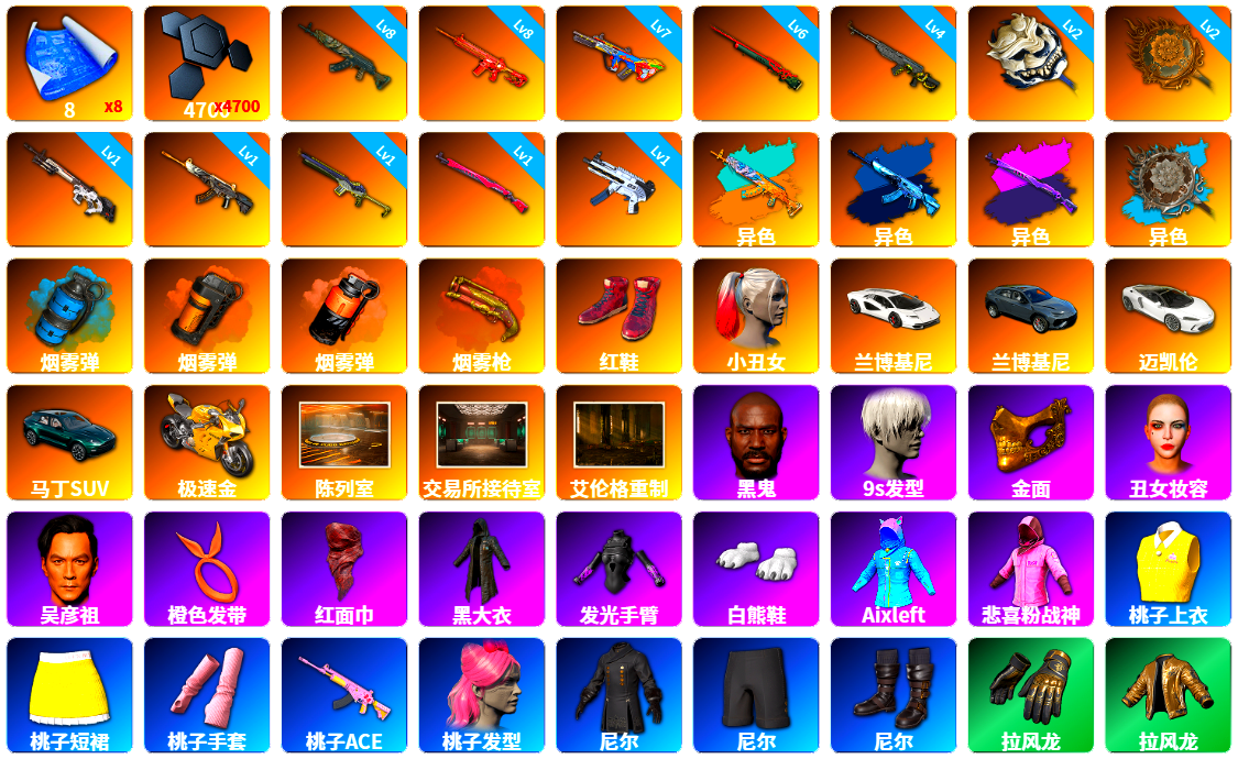 10级孙悟空M24 9级青龙762 4级妖魔之触ACE 3级南瓜M4 1级爆裂AUG 1级冰域Groza 1级无重力MP5K 1级刻耳柏洛斯M249 1级小兔MK12 1级时光加农SKS 1级玩偶炮 1级德拉贡 1级午夜惊魂98K 妖魔之触(异色) 珊瑚色烟雾弹 橙色狂怒之雾-M79 1张图纸 8380聚合物 柏林鞋 帕拉梅拉 保时捷911 保时捷卡宴 布加迪跑车 兰博基尼SUV 马丁跑车 交易所接待室 黑鬼 滑雪镜 金面 渔夫帽 红面巾 黑大衣 活动绿东 发光手臂 白熊鞋 aespa女团 阿狸 拉风龙 后街车库 车漆 小马尾 丸子头 脏辫 爱的主打歌 青海摇 小兔学院 西游记 绷带AK