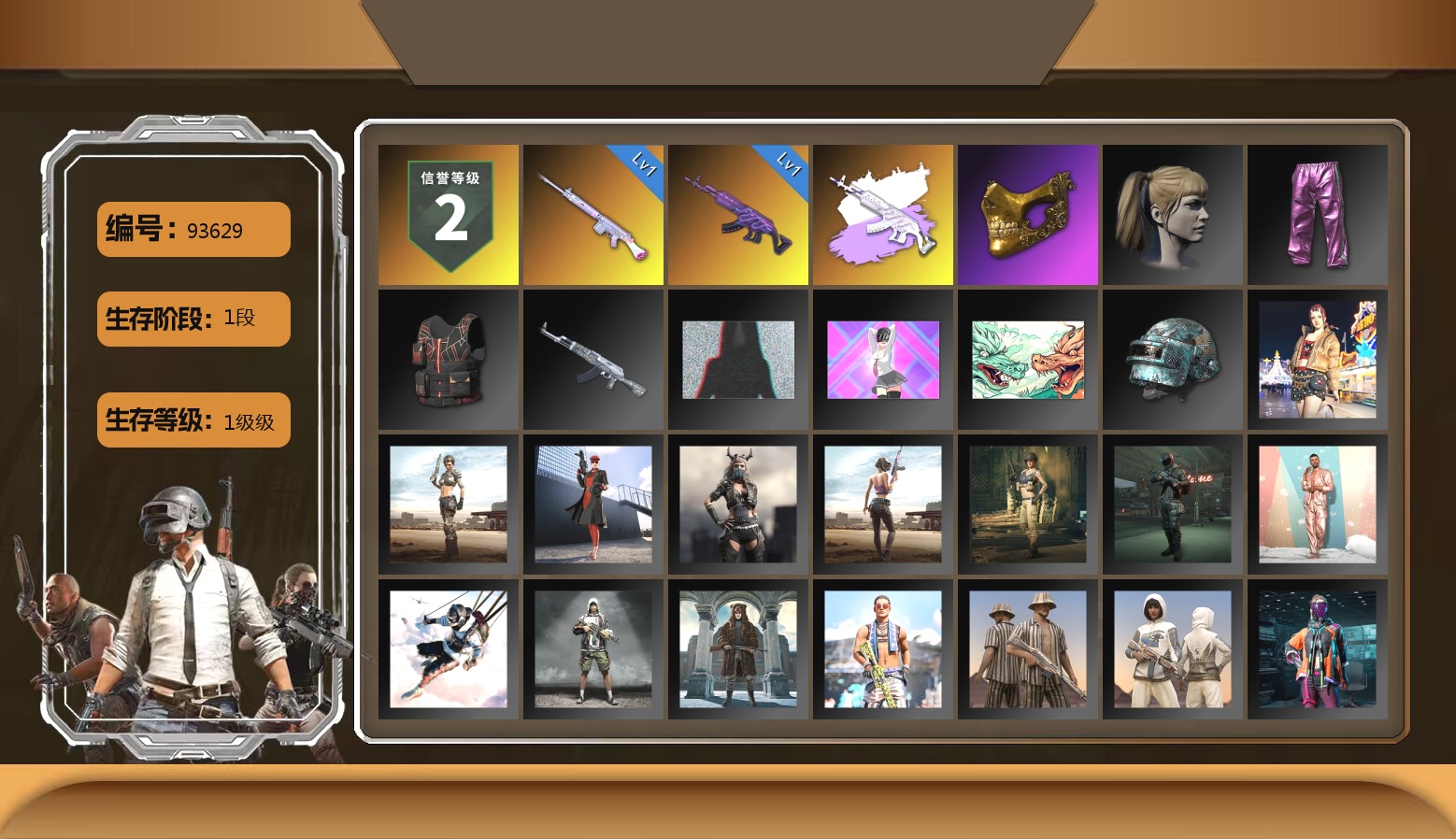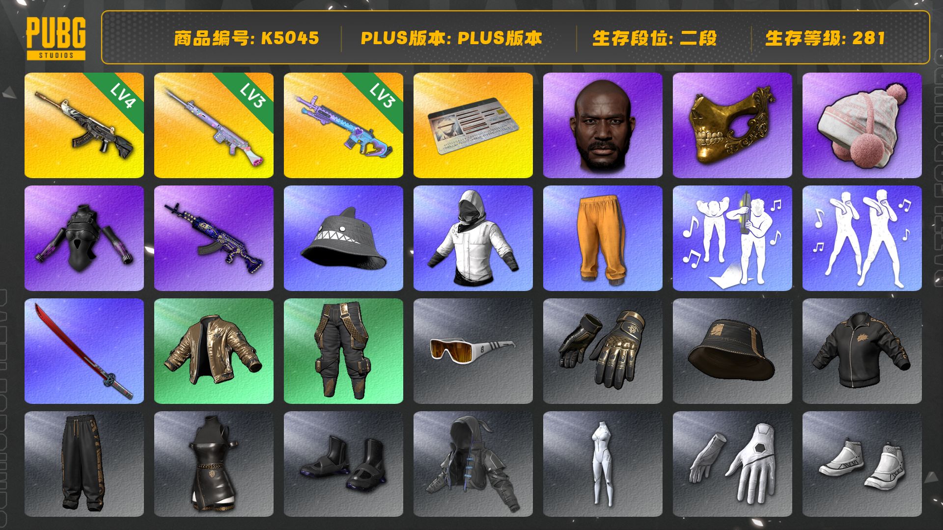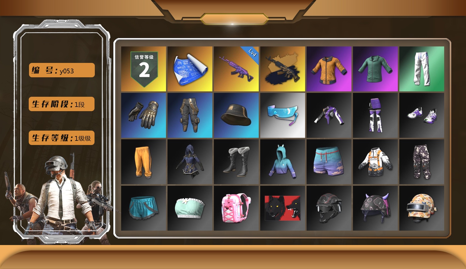 4级南瓜M4 4级猪八戒M4 3级火麒麟 2级霓虹AUG 1级齿轮炮 青色烟雾弹 柏林鞋 小丑女 交易所接待室 1张图纸 红面巾 黑大衣 发光手臂 粉战神 小马尾 小兔学院 悲喜 绷带AK
