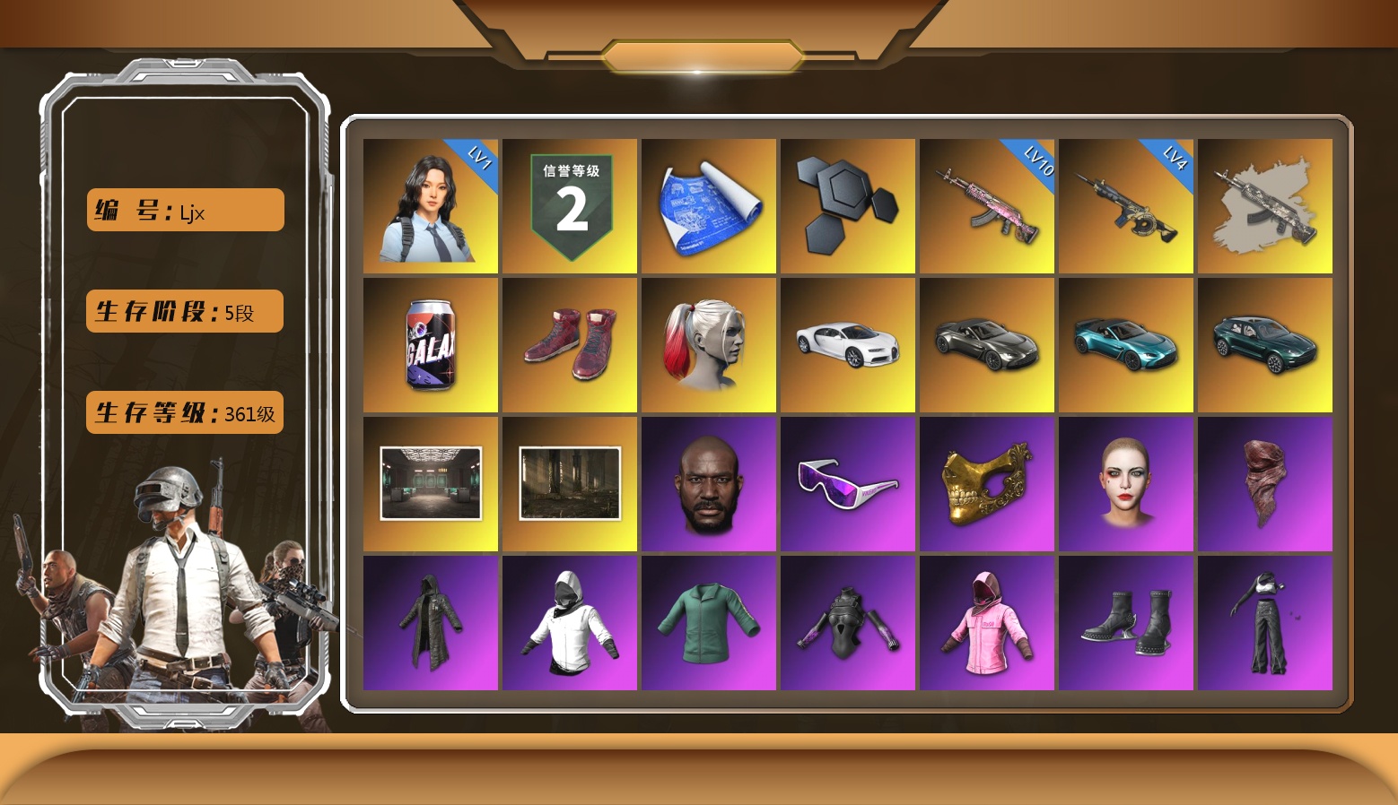 10级美杜莎762 5级玩偶炮 1级德拉贡 1级无信号M4 1级午夜惊魂98K 1级刻耳柏洛斯M249 1级妖魔之触ACE 1级夜曲M24 玩偶炮(异色) 寒蚀MP5K(异色) 蓝色烟雾弹 紫色魔法迷雾-M79 黑绷带 交易所接待室 3张图纸 5746聚合物 滑雪镜 金面 白战神 活动绿东 发光手臂 萨芬裤 白熊鞋 aespa女团 西游记 青海摇 小兔学院