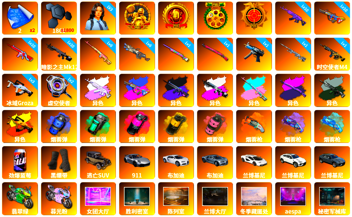 2张图纸 1800聚合物 3级瀚娜 10级美杜莎762 10级爆裂AUG 10级无信号M4 10级暗影之主Mk12 6级德拉贡 6级刻耳柏洛斯M249 1级彩虹M24 1级午夜惊魂98K 1级寒蚀MP5K 1级幽影残魂AWM 1级时空使者M4 3级冰域Groza 2级虚空使者 美杜莎(异色) 爆裂AUG(异色) 无信号M4(异色) 暗影之主Mk12(异色) 德拉贡(异色) 午夜惊魂98K(异色) 时空使者M4(异色) 冰域Groza(异色) 蓝色烟雾弹 青色烟雾弹 品红色烟雾弹 黄色烟雾弹 粉色烟雾弹 橙色狂怒之雾-M79 紫色魔法迷雾-M79 蓝色魔法迷雾-M79 黑绷带 保时捷911 布加迪跑车 布加迪奢华版跑车 兰博基尼跑车 兰博基尼SUV 兰博基尼奢华版 杜卡迪翡翠绿 杜卡迪暮光粉 女团大厅 胜利密室 陈列室 兰博大厅 冬季藏匿处 aespa 尼尔 黑鬼 MINJI 9s发型 金面 渔夫帽 牛角 卡崔娜 橙色发带 白战神 活动绿东 发光手臂 电磁背包 白熊鞋 小叮当 粉战神 2024女团 aespa女团 阿狸 小黄鸭 拉风龙 车漆 小马尾 丸子头 脏辫 爱的主打歌 青海摇 小兔学院 悲喜 绷带AK 滑雪帽 胜利之舞39