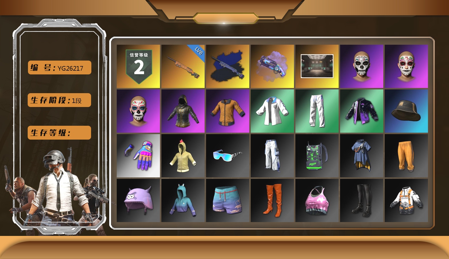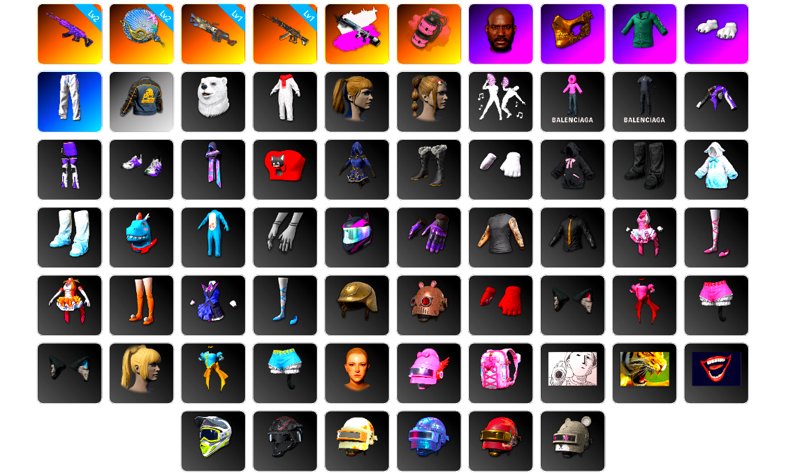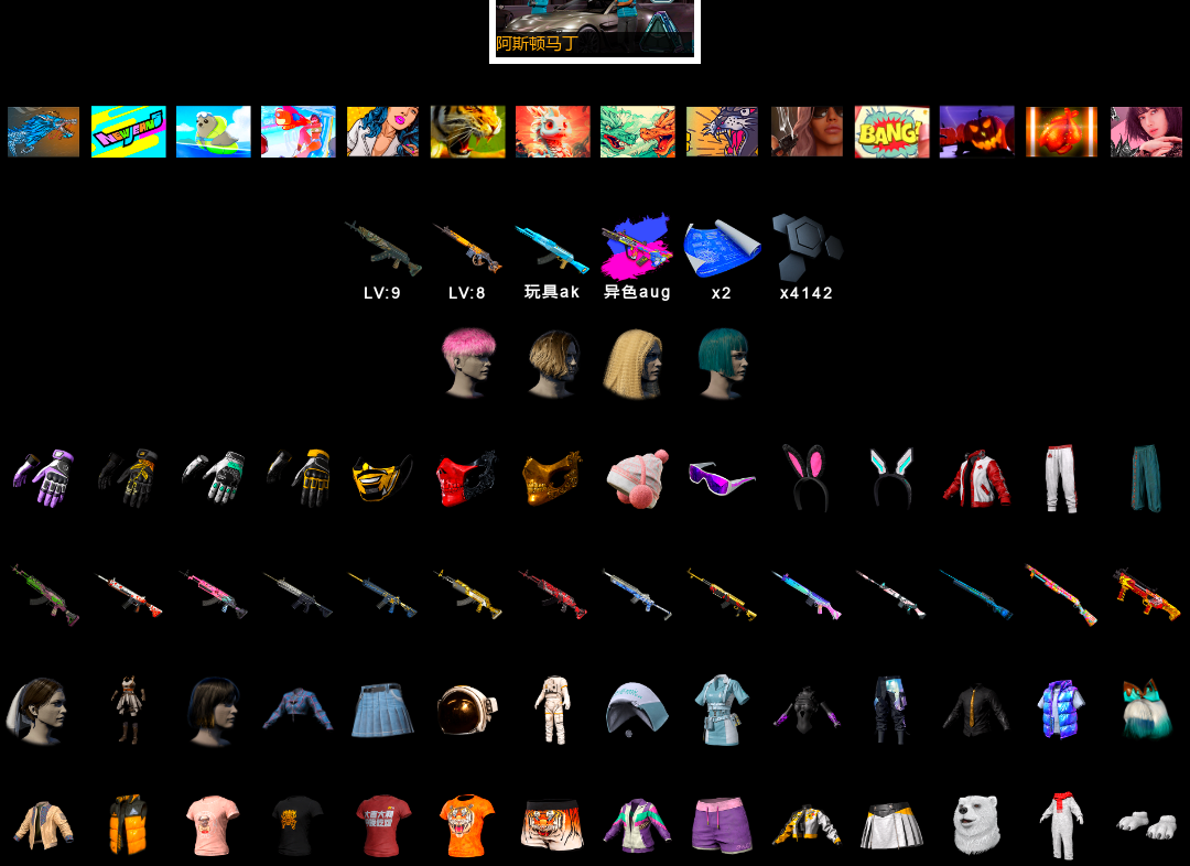 2级美杜莎762 2级塞壬平底锅 1级刻耳柏洛斯M249 1级妖魔之触ACE 暗影之主Mk12(异色) 粉色烟雾弹 黑鬼 金面 活动绿东 白熊鞋 小马尾 小兔学院 绷带AK 西游记 PGC 2021套装
