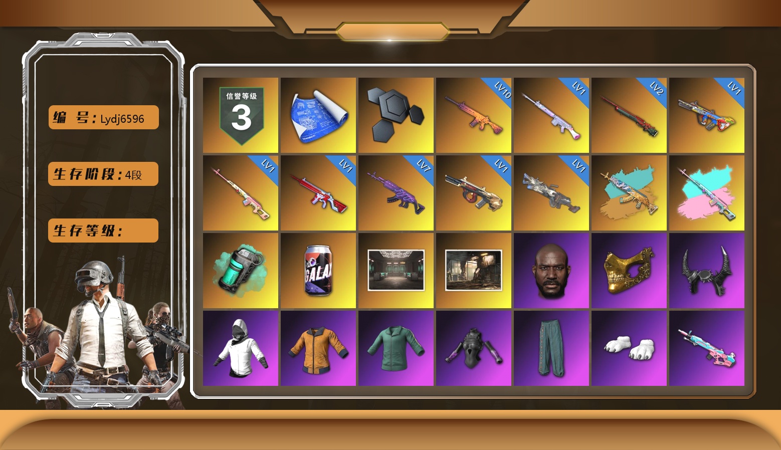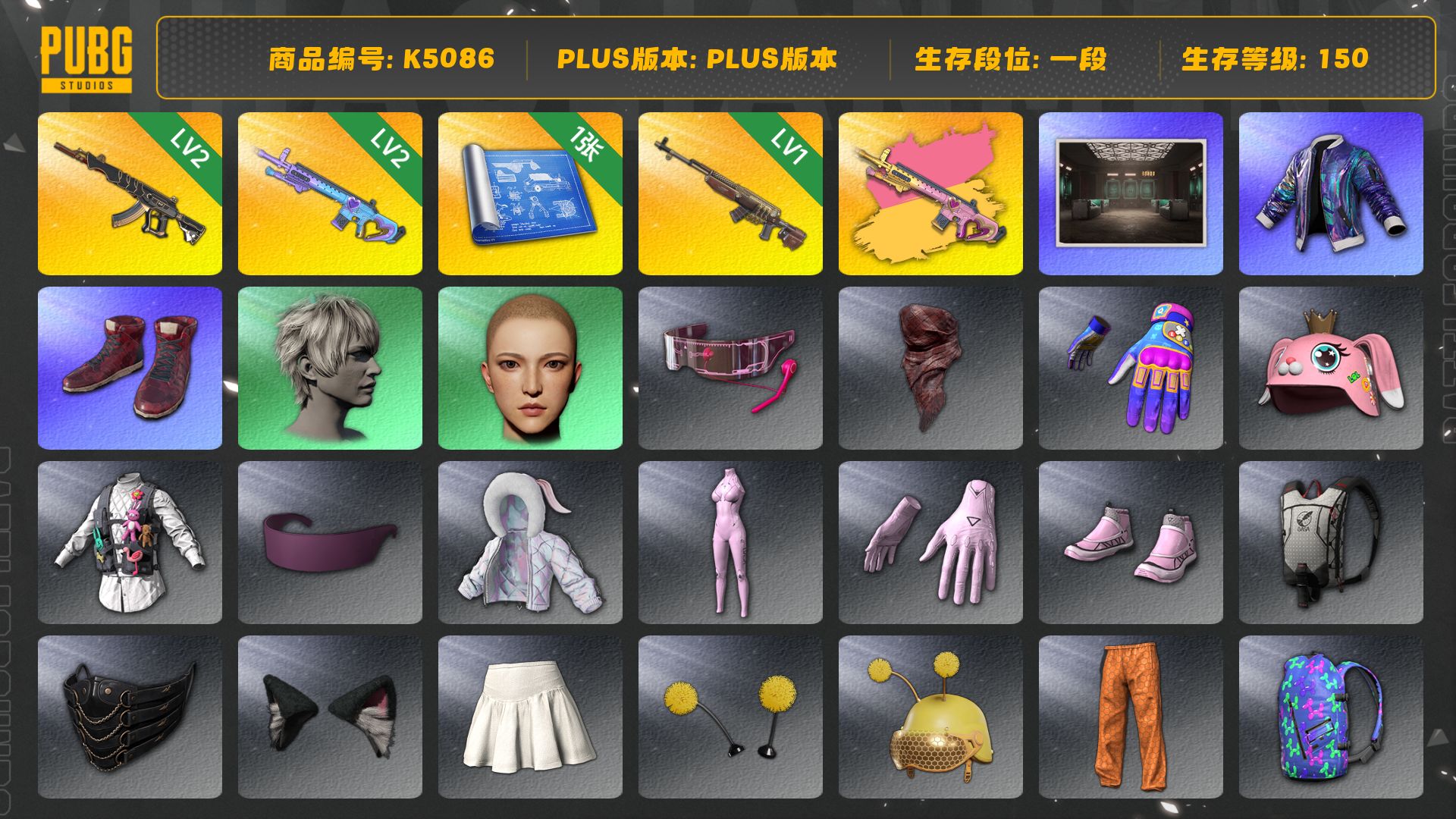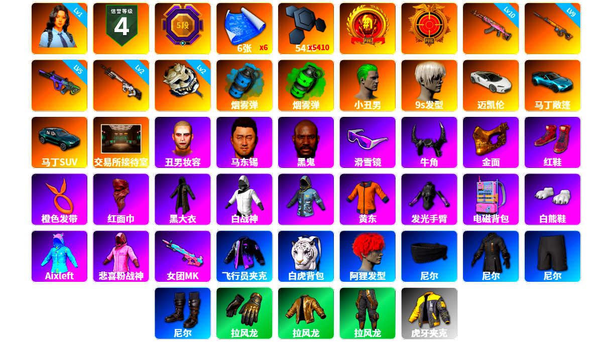 1级瀚娜 信誉等级四 生存5阶段 6张图纸 5410聚合物 今晚吃鸡金 神枪手金 10级火麒麟 9级齿轮炮 5级霓虹AUG 2级赛博MK12 2级白虎锅 天蓝色烟雾弹 翡翠色烟雾弹 小丑男 9s发型 迈凯伦硅质白版 马丁敞篷跑车 马丁SUV 交易所接待室 丑男妆容 马东锡 黑鬼 滑雪镜 牛角 金面 柏林鞋 橙色发带 红面巾 黑大衣 白战神 小战神 黄东 发光手臂 电磁背包 白熊鞋 小叮当 粉战神 阿狸 尼尔 拉风龙 鸡斯卡夹克 车漆 小马尾 丸子头 西游记 脏辫 青海摇 小兔学院 悲喜 绷带AK 滑雪帽 PGC 2021套装