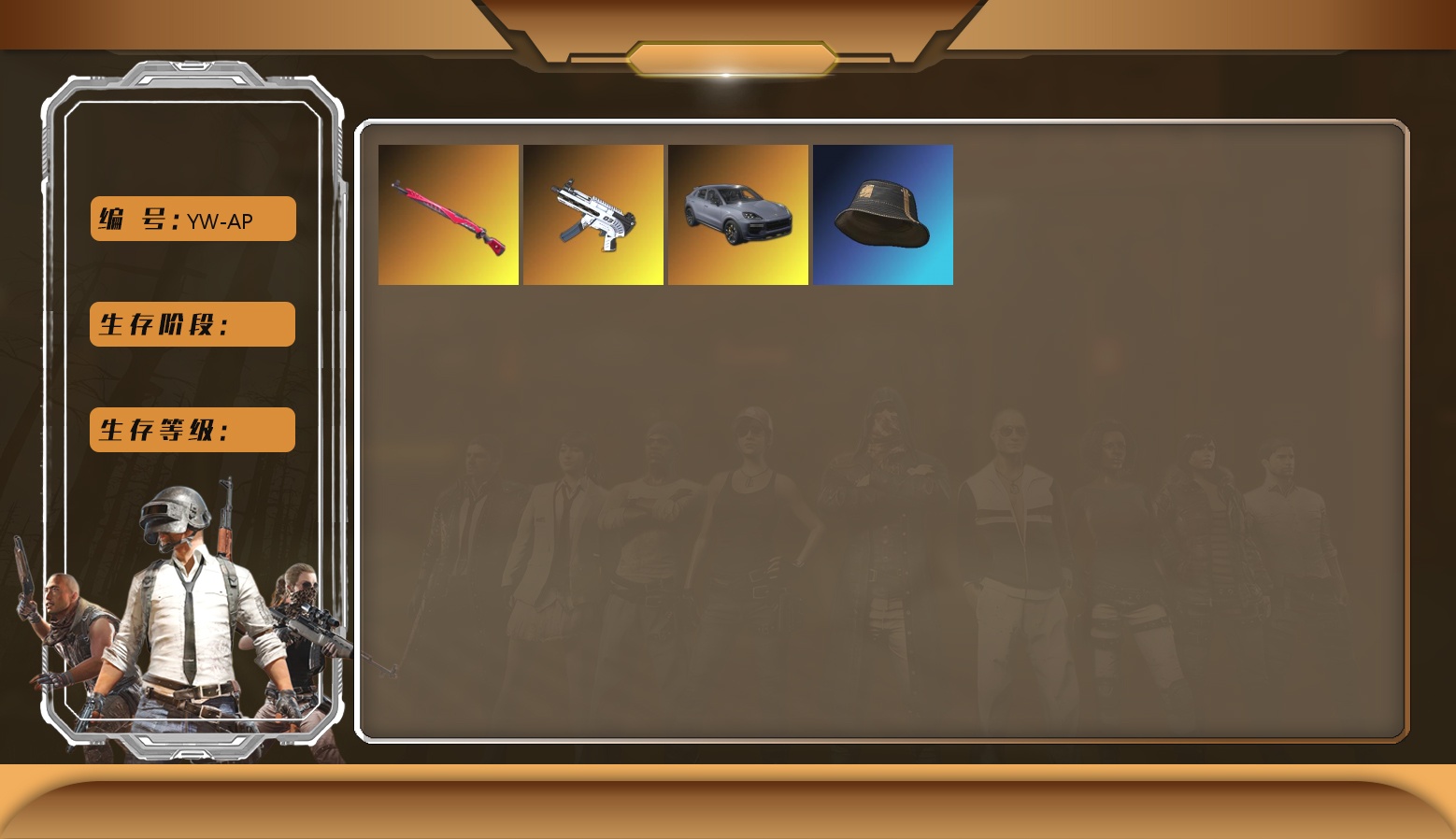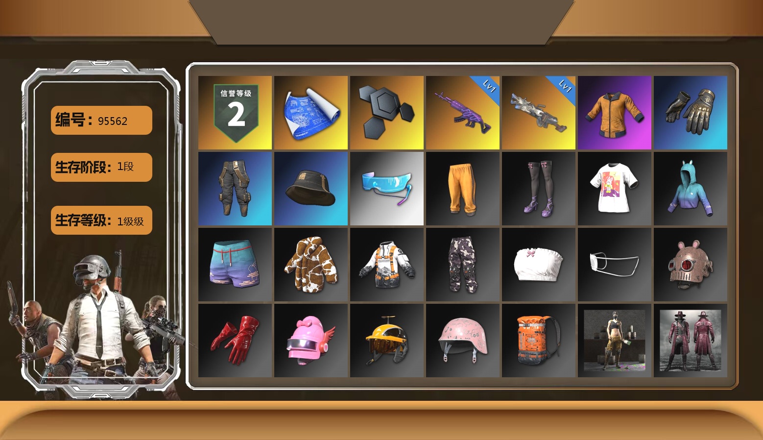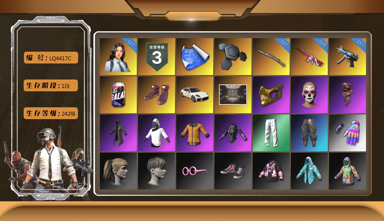 1级瀚娜 信誉等级四 生存5阶段 6张图纸 5410聚合物 今晚吃鸡金 神枪手金 10级火麒麟 9级齿轮炮 5级霓虹AUG 2级赛博MK12 2级白虎锅 天蓝色烟雾弹 翡翠色烟雾弹 小丑男 9s发型 迈凯伦硅质白版 马丁敞篷跑车 马丁SUV 交易所接待室 丑男妆容 马东锡 黑鬼 滑雪镜 牛角 金面 柏林鞋 橙色发带 红面巾 黑大衣 白战神 小战神 黄东 发光手臂 电磁背包 白熊鞋 小叮当 粉战神 阿狸 尼尔 拉风龙 鸡斯卡夹克 车漆 小马尾 丸子头 西游记 脏辫 青海摇 小兔学院 悲喜 绷带AK 滑雪帽 PGC 2021套装