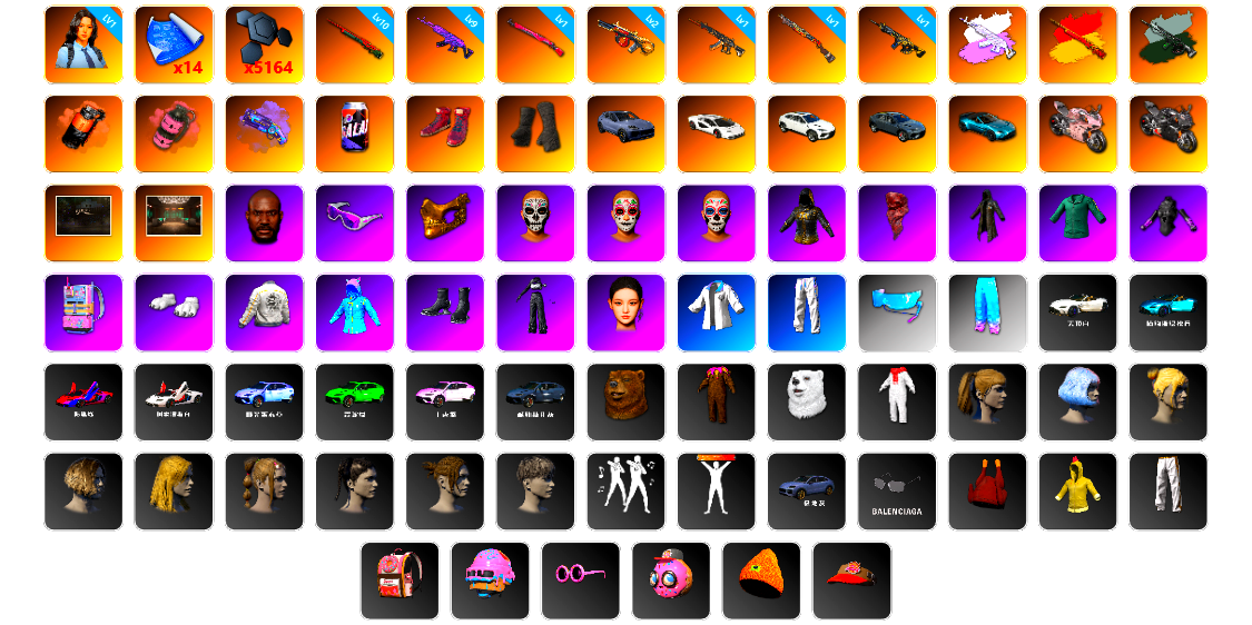 1级瀚娜 14张图纸 5164聚合物 10级孙悟空M24 9级美杜莎762 1级午夜惊魂98K 2级弥诺陶洛斯AUG 1级妖魔之触ACE 1级烈日灼烧-S1897 1级时空使者M4 美杜莎(异色) 孙悟空M24(异色) 时空使者M4(异色) 珊瑚色烟雾弹 粉色烟雾弹 紫色魔法迷雾-M79 柏林鞋 黑绷带 保时捷卡宴 兰博基尼跑车 兰博基尼SUV 兰博基尼奢华版 马丁敞篷跑车 杜卡迪叛逆玫瑰 杜卡迪纯净黑 兰博大厅 交易所接待室 黑鬼 滑雪镜 金面 红面巾 黑大衣 活动绿东 发光手臂 电磁背包 白熊鞋 小叮当 aespa女团 车漆 小马尾 丸子头 西游记 脏辫 青海摇 小兔学院 绷带AK 胜利之舞39