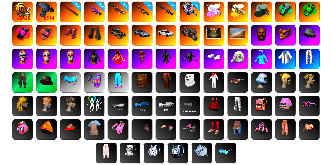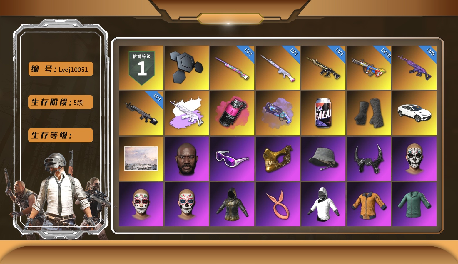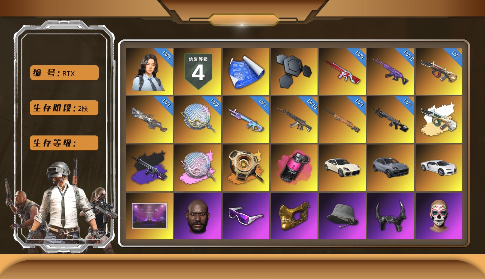 2500级 信誉等级4 齿轮762 8级 霓虹aug 6级 玩偶slr 6级 兔兔mk12 6级 恶魔ace 6级 朱雀m4 5级 猛虎98k 3级 烈日1897 2级 异色猛虎 异色恶魔 异色aug 汉娜 4级 迈凯伦 兰博基尼suv 阿斯顿马丁跑车 丑男丑女双头 2021pgc黄金面具 滑雪眼镜 黑人 渔夫帽 黑盒手套 虎牙夹克 pigff套 电包 惊魂玩偶套