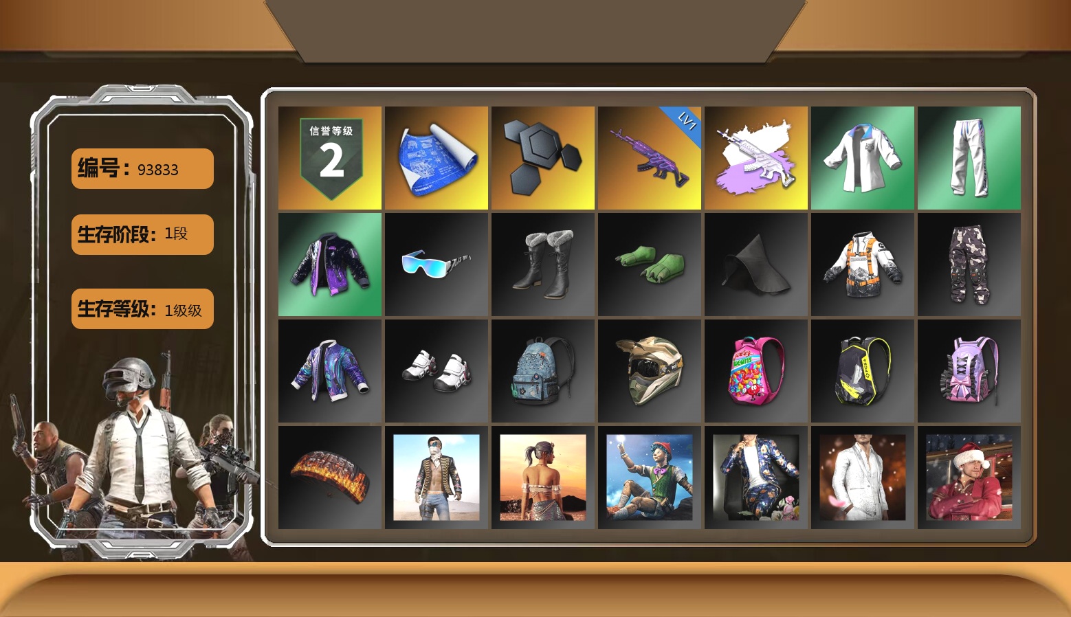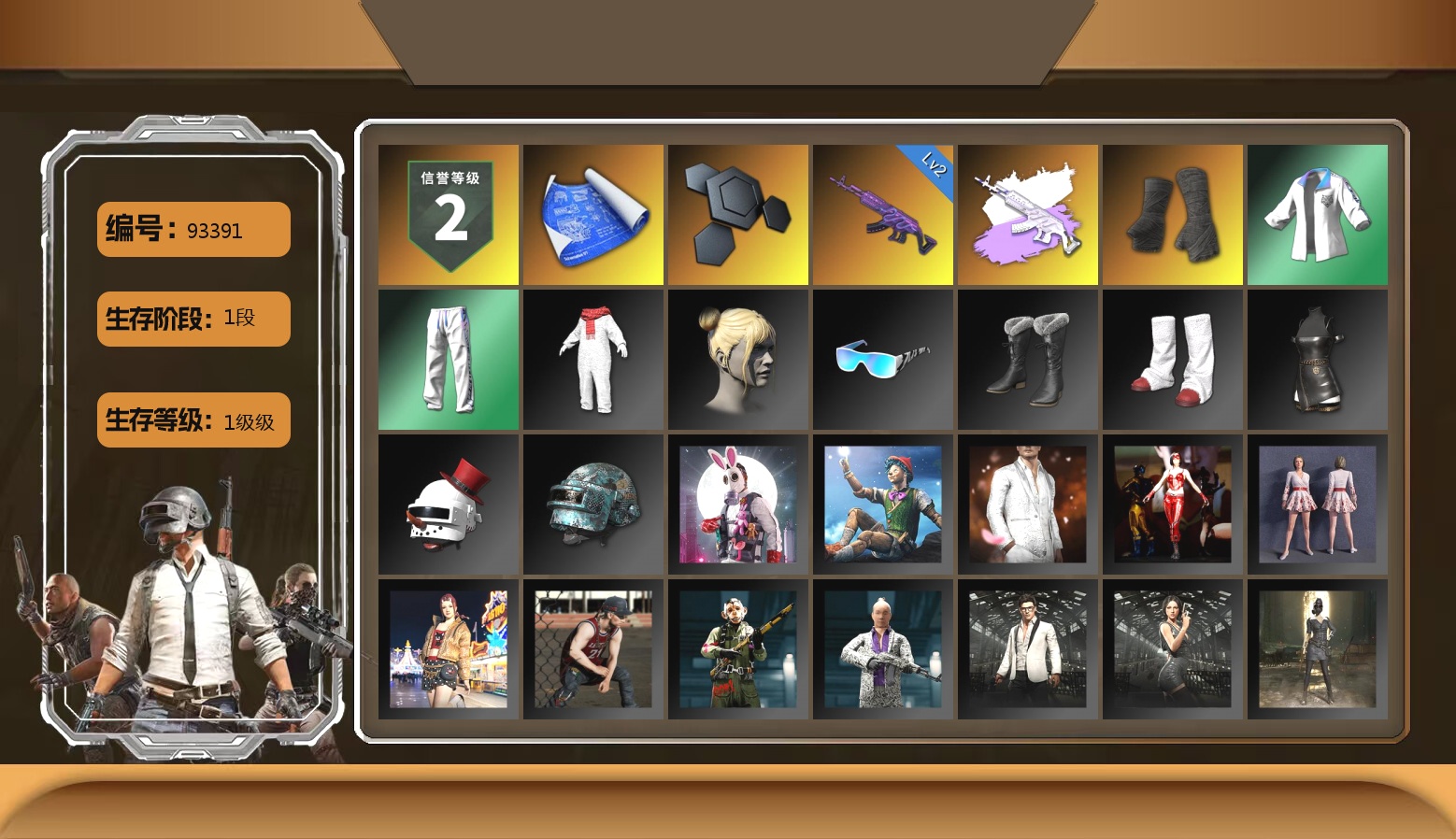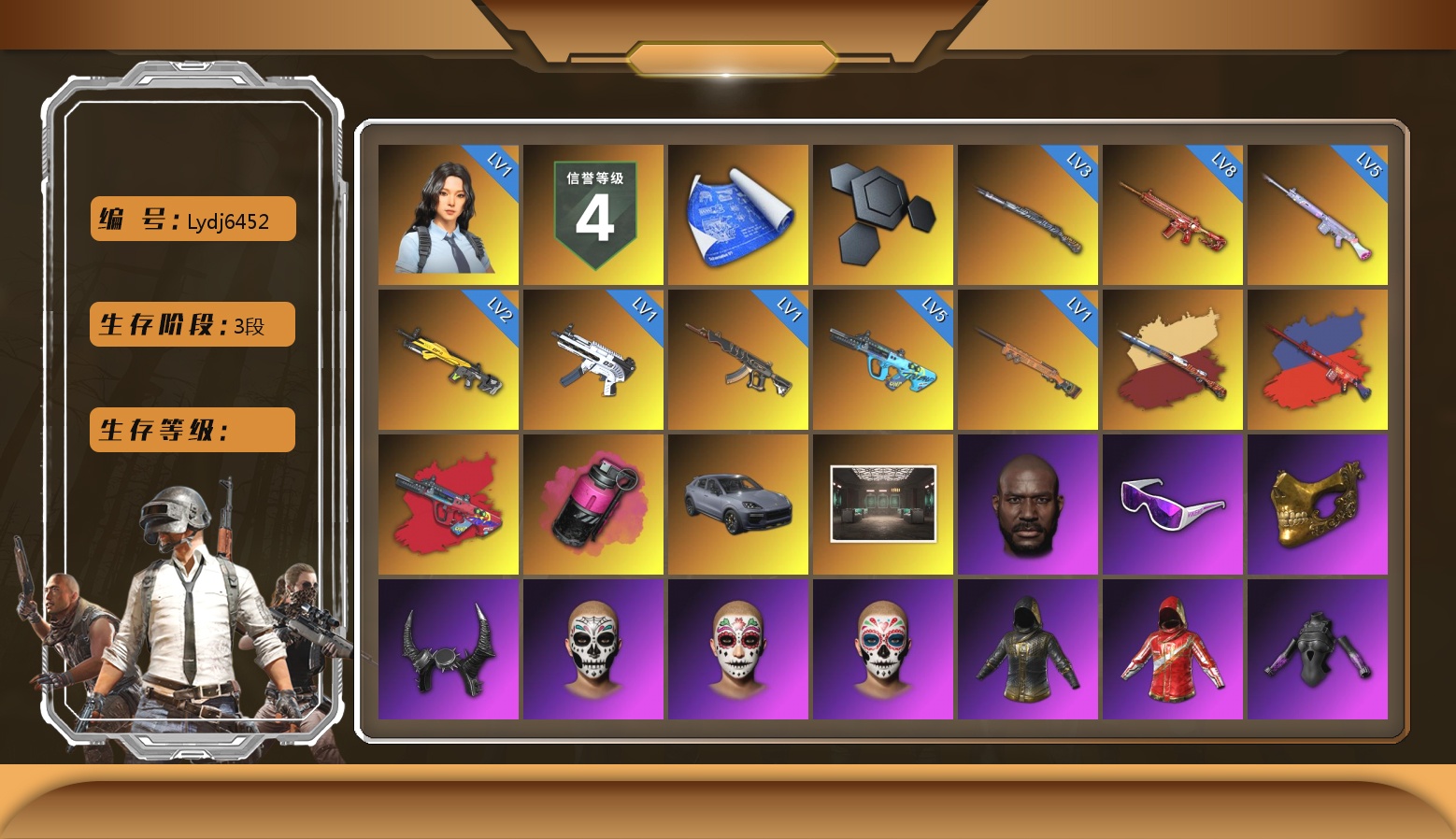 8级朱雀M4 5级玩偶炮 5级GD-AUG 3级猛虎98k 2级小兔MK12 1级瀚娜 1级无重力MP5K 1级妖魔之触ACE 1级夜曲M24 猛虎98K(异色) 玩偶炮(异色) GD-AUG(异色) 品红色烟雾弹 保时捷卡宴 交易所接待室 2张图纸 4257聚合物 黑鬼 滑雪镜 金面 牛角 发光手臂 萨芬裤 白熊鞋 拉风龙 小马尾 丸子头 脏辫 青海摇 小兔学院 绷带AK 胜利之舞39 枪炮洗礼