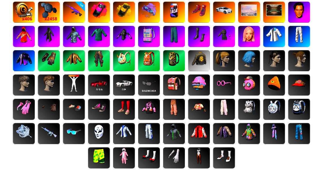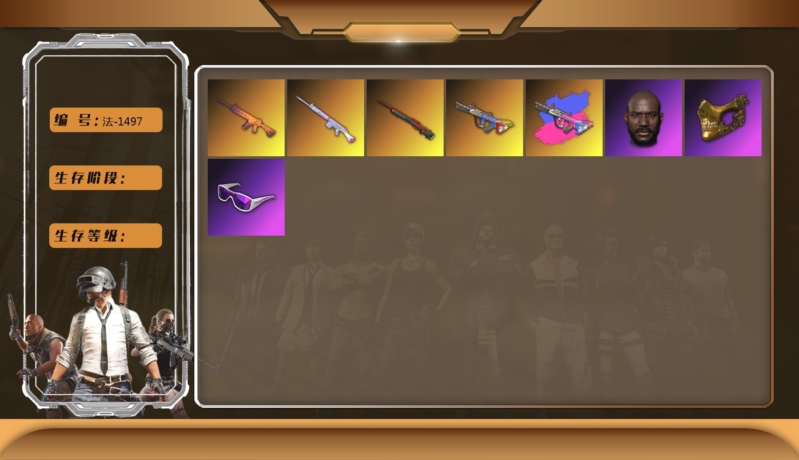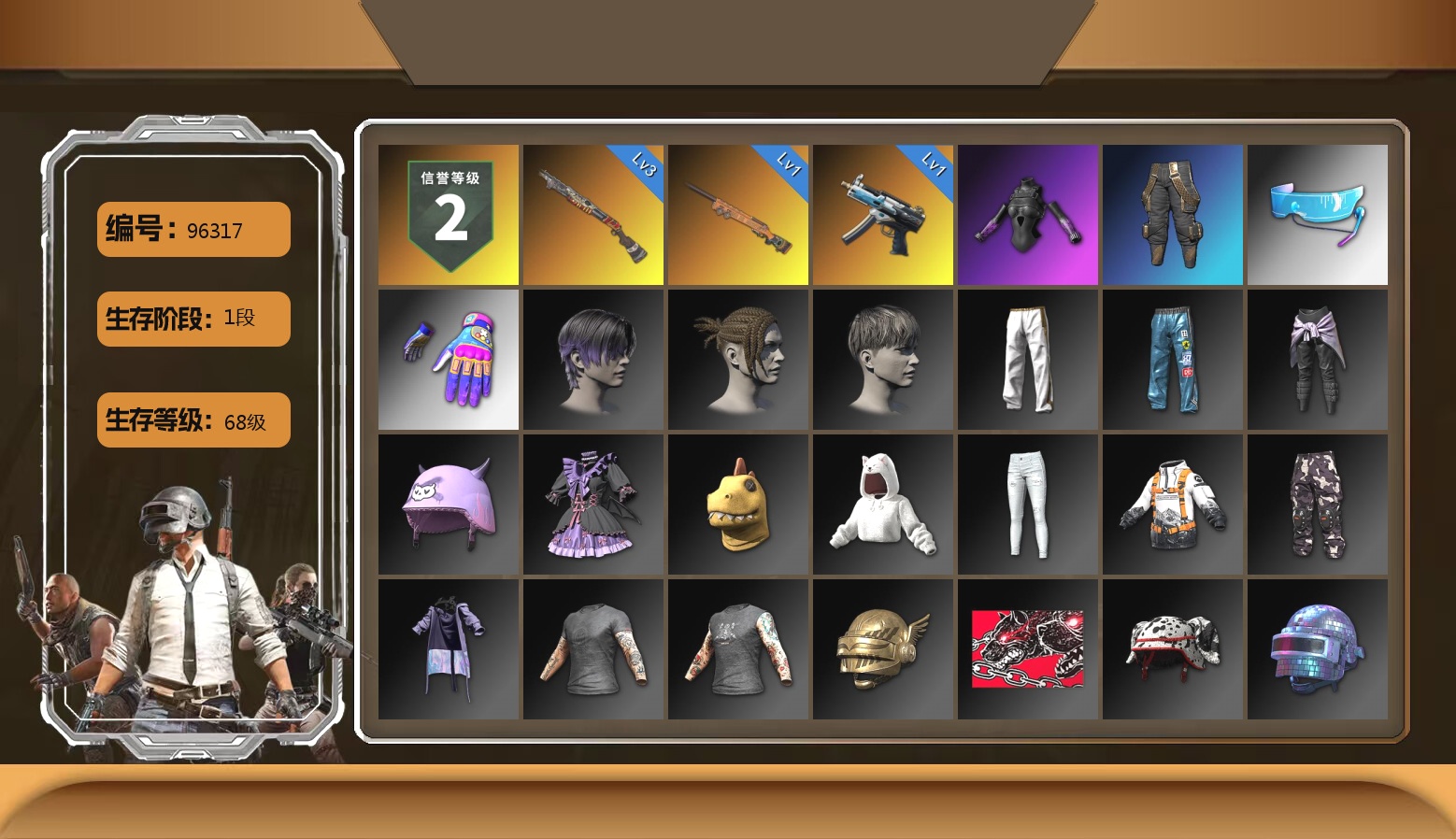 8级朱雀M4 5级玩偶炮 5级GD-AUG 3级猛虎98k 2级小兔MK12 1级瀚娜 1级无重力MP5K 1级妖魔之触ACE 1级夜曲M24 猛虎98K(异色) 玩偶炮(异色) GD-AUG(异色) 品红色烟雾弹 保时捷卡宴 交易所接待室 2张图纸 4257聚合物 黑鬼 滑雪镜 金面 牛角 发光手臂 萨芬裤 白熊鞋 拉风龙 小马尾 丸子头 脏辫 青海摇 小兔学院 绷带AK 胜利之舞39 枪炮洗礼
