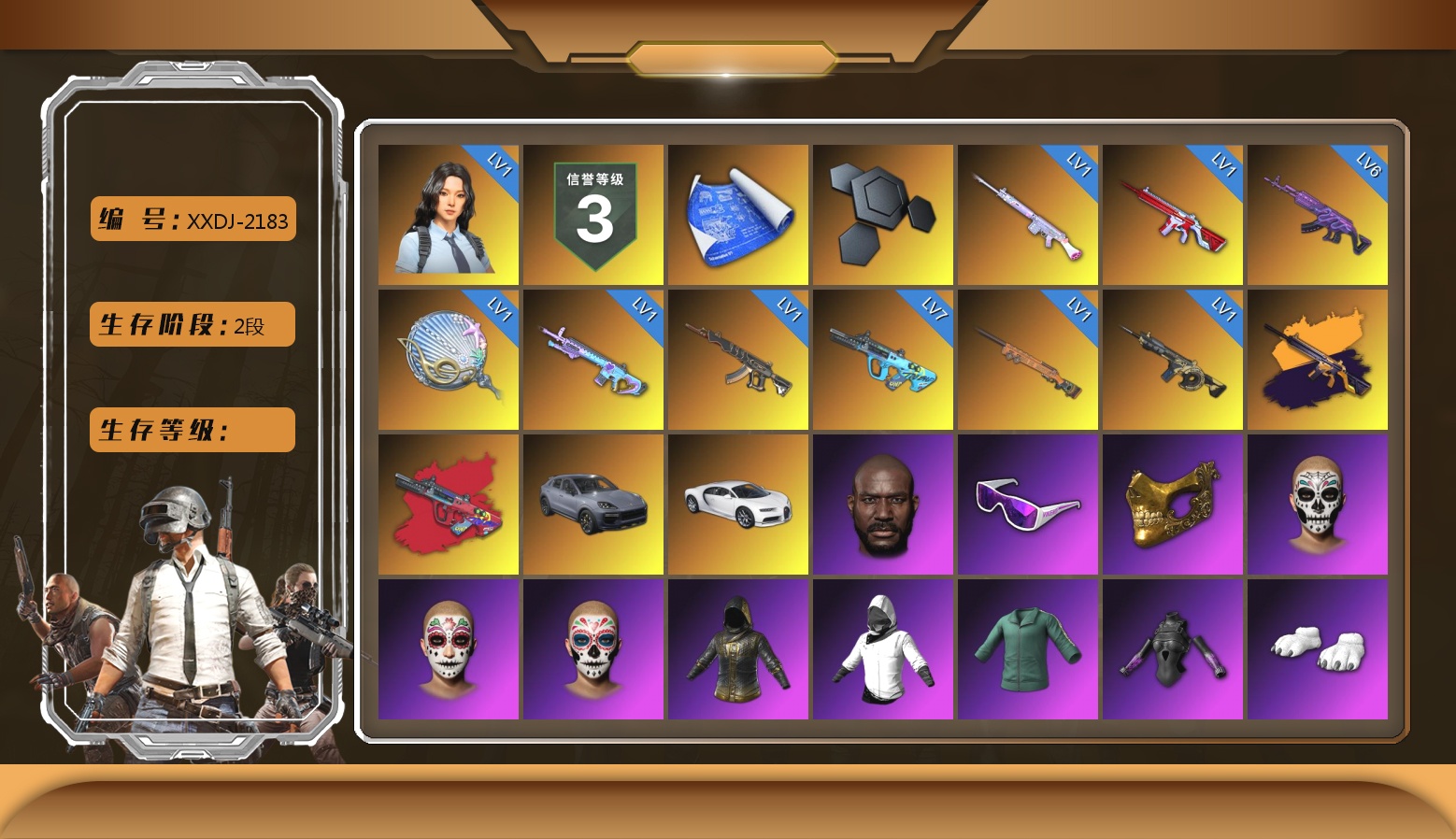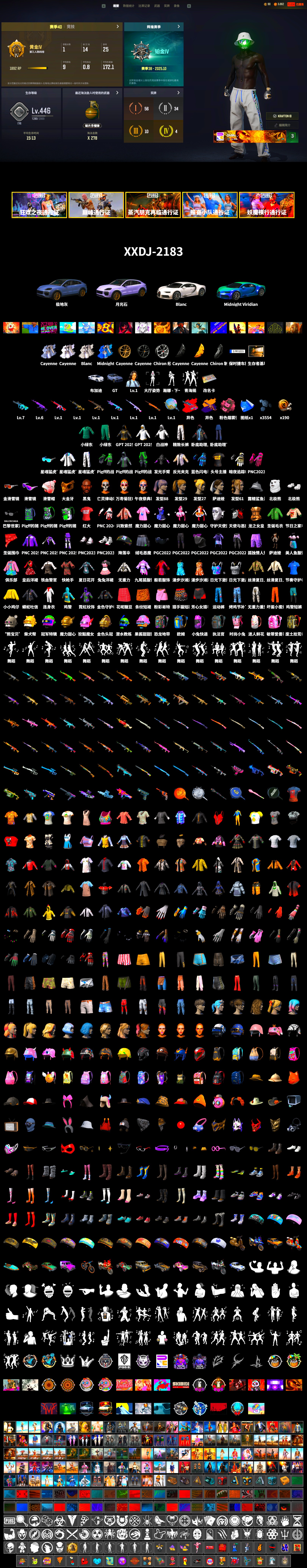 ❤找回包赔❤皮肤:7级GD-AUG 6级美杜莎762 1级瀚娜 1级玩偶炮 1级无信号M4 1级塞壬平底锅 1级魔咒之力Mk12 1级妖魔之触ACE 1级夜曲M24 1级时空使者M4 无信号(异色) GD-AUG(异色) 保时捷卡宴 布加迪跑车 信誉等级三 1张图纸 3554聚合物 黑鬼 滑雪镜 金面 亡灵律动妆容 万寿菊狂欢妆容 午夜祭典妆容 GPT夹克 白战神 活动绿东 发光手臂 白熊鞋 滑雪帽 星魂猛虎下山运动夹克 星魂猛虎下山运动裤 北极熊头套 北极熊连身衣 Number 小马尾 发型43 丸子头 萨迪娅的头纱 发型56 发型61 发型24 青海摇 火鸡帽子 非鸡连帽卫衣 精致长裤 唯一甜甜圈背包(3级) 果酱甜甜圈 - 头盔(3级) 暴躁花生墨镜 釉彩甜甜圈面具 暴躁花生针织帽 甜甜圈遮阳帽 釉彩甜甜圈衬衫 釉彩甜甜圈手套 甜甜圈运动鞋 甜甜圈短裤 暴躁花生连帽卫衣 暴躁花生长裤 釉彩甜甜圈运动裤 星魂猛虎下山滑雪镜 朱芳芳手套 朱芳芳夹克 朱芳芳长裤 1级包 3级包 电波干扰背包 PNC 2025 战术科技上衣 PNC 2025 战术科技长裤 PNC 2025 战术科技运动鞋 日光下澈凉鞋 漫步沙滩凉鞋 日光下澈热带短裤 丝滑夏日短裤(白色) 丝滑夏日短裤(橄榄绿) 日光下澈丛林上衣 日光下澈热带上衣 丝滑夏日上衣(白色) 丝滑夏日上衣(橄榄绿) 漫步沙滩连衣裙(棕色) 漫步沙滩连衣裙(蓝色) 闪亮运动裤 战术科技裤 猎手猫夹克 猎手猫上衣 猎手猫短裙 猎手猫皮鞋 特工小兔长袖上衣 特工小兔长裤 小队队长 小队队长 小队队长 银河系女孩 银河系女孩 棉花糖手套 怨恨小姐 怨恨小姐 先驱战队 先驱战队 先驱战队 鸡警 鸡警短裤 头号主播 大吉大利T恤(红色) 战术科技夹克 2025夹克 太阳之子电波干扰背包 绿色训练裤 金墨点染 金墨点染 金墨点染 群雄逐鹿 金墨点染 2级包 开拓者手套 强袭者短鞋 开拓者短鞋 萨莉的T恤 魔力甜心萨莉的礼服(粉红色) 萨莉的皮鞋 萨莉的礼服 萨莉的长靴 萨莉的礼服 萨莉的皮鞋 萨莉2级头 萨莉3级头 萨莉2级包 小兔学院 兔兔也朋克面罩 绒毛小恶魔短裙 兔兔也朋克发箍 兔兔也朋克洋裙 兔兔也朋克腿套 哥特短裙 发型60 发型59 Magic Magic 曼迪2级包 曼迪3级包 aespa - 平底锅 晚秋-M416 无慈悲 - M416 守护兽的凝视 PGC 2022 王牌登场 - Beryl M762 PGC 2021 群雄逐鹿 - Beryl M762 游戏结束 无畏小蜜蜂 - Beryl M762 毒性 - Beryl M762 魔女之力 - Beryl M762 PCS2 金色成就 - Beryl M762 魔力甜心萨莉的挚友 - AKM 精巧机械 - AKM 暗影斑驳 - AKM 灵魂枷锁 - AKM 渗透与破坏 - AKM 金色落叶 - AKM 西游记 月之尘 - AUG 嗜血者 - AUG 分形碎片 - ACE32 G-DRAGON - SCAR-L 银河卫士 - SCAR-L 魔力宝贝 - M16A4 甜蜜外衣 - M16A4 灵魂枷锁 - Mk47 Mutant 金色落叶 - Mk47 Mutant Blue Magic Blaster - G36C 水手 - G36C 山花烂漫 - Groza 水手 - K2 圆点猎手 - K2 无慈悲 - K2 淬火真金 - K2 加纳多印花 - SLR 唐三藏 - SLR 赛季35竞技黄金 - Lynx AMR 糖霜乐园 - SKS 金色落叶 - SKS 银河武装 - SKS 精巧机械 - Mini14 夏日冲浪 - Mini14 甜蜜外衣 - Mini14 红桃同花 - Mk12 雪国风光 - Mk14 分形碎片 - VSS 海洋哑光(蓝色) - VSS 标准猎手 - VSS 璀璨星光 - QBU 魔力甜心萨莉的永恒挚友 - 德拉贡诺夫 炽热沙漠 - Mk47 Mutant 热浪 - Kar98k 悠扬情歌 - Kar98k 无慈悲 - Kar98k 鲜花之力 - AWM G-DRAGON - M24 幽灵之握 - M24 彩糖蛋糕 - 莫辛纳甘步枪 双色 - MP5K 竞速之道 - P90 Poof! - PP-19 Bizon 彩虹之上 - UMP 熔岩灯 - JS9 水手 - 汤姆逊冲锋枪 心跳掠夺者 - MP9 嗜血者 - Vector 翡翠之刃 - Vector 抽象派 - Vector 灵魂枷锁 - Vector 水手 - Micro UZI 圣诞猎手 - M249 无拘来世 - DP-28 双色 - DBS 夺目寒光 - O12 一击撕裂者 - S1897 水手 - S1897 海洋哑光(蓝色) - S686 礼品店 - S686 波涛荡漾 - S686 水手 - R1895 圣诞之力 - P18C PUBG信条钢管 紫色雨滴 - 十字弩 甜蜜外衣 - 十字弩 碎瓜者 - 平底锅 8th Anniversary - Pan 维纳斯俱乐部手部装饰 兔兔也朋克手套 沙滩宝贝美甲配手环 工人手套(黑色) 月之狂蜥的手套 准备就绪手套 欧姆的手套 铁血警官的手套 秉烛罪人手套 雪色美人手套 霓虹纹饰手套 PGC 2022 战术科技手套 时光探员手套 般若手套 蓝色闪电手套 无重力重型手套 都市耀光戒指 豹子精手饰 狂野姿态手镯套组 漫步沙滩手环 宇宙灵狐手套 PNC 2024 手套(红色) 无重力轻型手套 百叶窗太阳镜(银色) 乔纳森的猎人墨镜 优雅夏日眼镜 技工墨镜(白色) 沙滩宝贝智能眼镜 PGC 2022 斑斓危机墨镜 老式太阳镜 PNC 2025 战术科技护目镜 卧底助理眼镜 美人鱼妆容 维纳斯面部妆容 匕首纹饰加红晕妆容 发型44 发型65 美人鱼发型 发型30 发型45 发型93 发型88 发型87 Hairstyle 81 执法官背包(3级) 恐龙地带背包(3级) Vikendi Varsity Backpack (Level 2) 勇往直前背包(1级) 沙滩风情背包(1级) 金色头冠 - 头盔(3级) PUBG信条 - 头盔(2级) PCS7 - 头盔(2级) 狐狸侯爵面具 驯鹿的红鼻子 快枪手牛仔帽 夏日渔夫帽(蓝绿色) 渔夫帽 小兔快递制服鸭舌帽 人类猎手探险帽 革面悍匪帽 时光探员帽 Winter Cheerleader Fur Hat 豹子精渔夫帽 露鳍鲨鱼渔夫帽 特工小兔发带 垂钓大师渔夫帽 PCS2 隐形生存者面巾 车手面具(黑色) PGC 2023 帝皇的荆棘面具 深红女郎的面具 守护天使面具 PGC 2022 战术科技面罩 圣诞快乐围巾 般若面具 豹子精面具 九尾狐面具 狂野姿态上衣 月光游牧者上衣 炫酷反光夹克 奶牛印花夹克(黑色) 绗缝夹克 蟒蛇吐信夹克 霓虹纹饰连帽卫衣 PCS5 清场能手夹克 蟒蛇吐信T恤 咆哮之力街头风背心 花衬衫(蓝绿色) 夏日短裤(灰色) 欧姆的夹