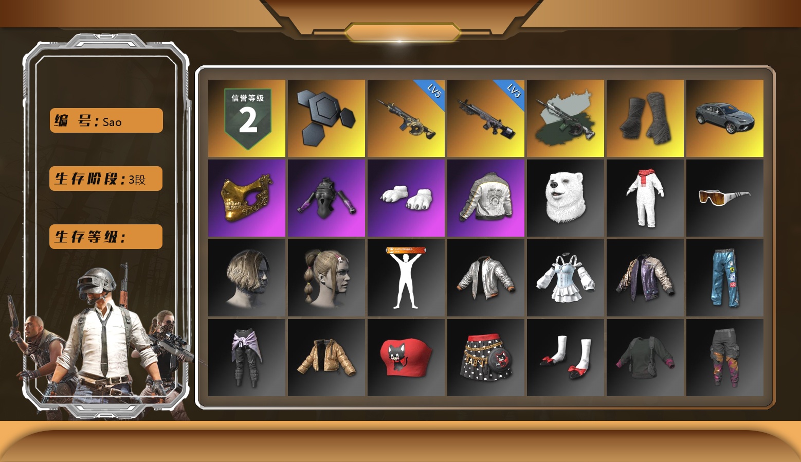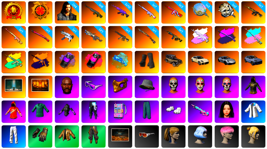 4级多利安 6级玄武SKS 10级美杜莎762 7级玩偶炮 3级无信号M4 2级塞壬平底锅 2级白虎锅 1级猪八戒M4 1级德拉贡 1级午夜惊魂98K 1级无重力MP5K 1级刻耳柏洛斯M249 1级妖魔之触ACE 1级烈日灼烧-S1897 1级时空使者M4 美杜莎(异色) 午夜惊魂98K(异色) 德拉贡(异色) 妖魔之触(异色) 无信号(异色) 紫色烟雾弹 品红色烟雾弹 蓝色魔法迷雾-M79 黑绷带 帕拉梅拉 保时捷911 保时捷卡宴 胜利密室 武器神龛 黑鬼 滑雪镜 金面 渔夫帽 活动绿东 发光手臂 竞猜裤 电磁背包 萨芬裤 白熊鞋 aespa女团 拉风龙 后街车库 小马尾 粉头 丸子头 脏辫 青海摇 小兔学院 绷带AK