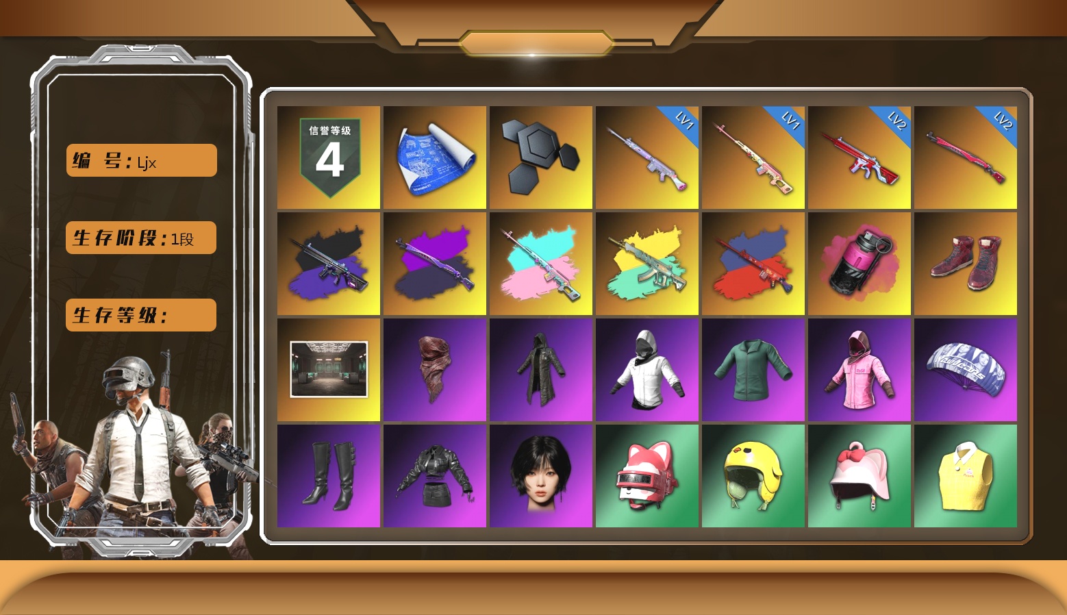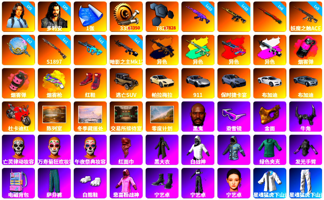 2级无信号M4 2级午夜惊魂98K 1级玩偶炮 1级德拉贡 无信号M4(异色) 午夜惊魂98K(异色) 德拉贡(异色) 妖魔之触(异色) 玩偶炮(异色) 品红色烟雾弹 柏林鞋 交易所接待室 5张图纸 18832聚合物 红面巾 黑大衣 白战神 活动绿东 粉战神 aespa女团 阿狸 拉风龙 小兔学院 悲喜