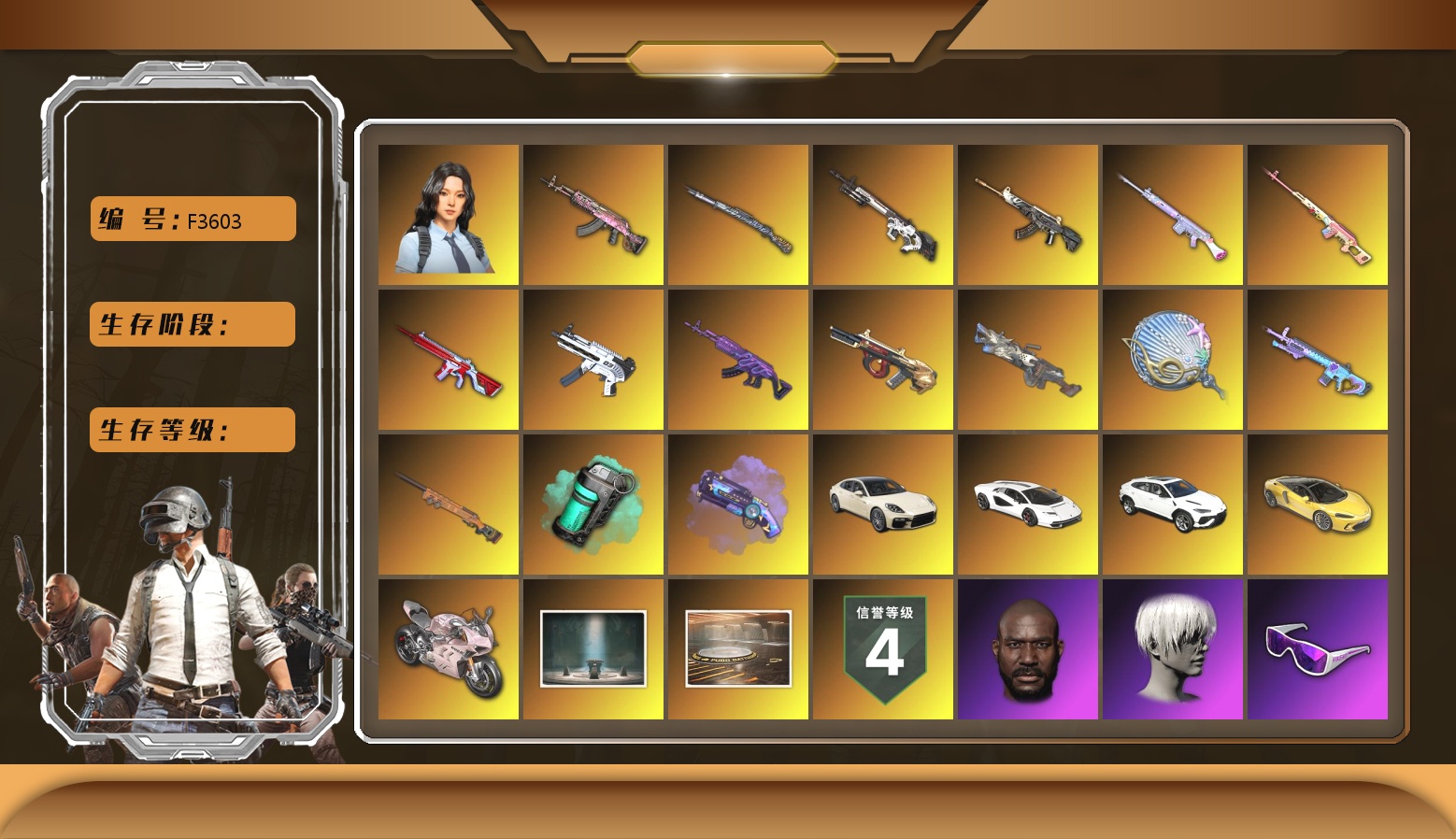 火麒麟 满级 塞壬平底锅 满级 猛虎98k 7 德拉贡 2 无重力MP5K 1 玩偶炮 1 赛博MK12 1 小夜曲 1 无信号M4 1 恶魔ACE 1 刻耳柏洛斯M249 1 美杜莎762 1 弥诺陶洛斯AUG 1 兰博基尼 保时捷跑车 阿斯顿马丁DBX 杜卡迪 瀚娜 魔咒之力Mk12 阿狸 烟雾弹 粉战神 悲喜 拉风龙 白战神 黄东 活动绿东 小叮当 小马尾 黑鬼 金面 滑雪镜 9s发型 牛角 危险玩偶屋 2024女团 陈列室 胜利密室