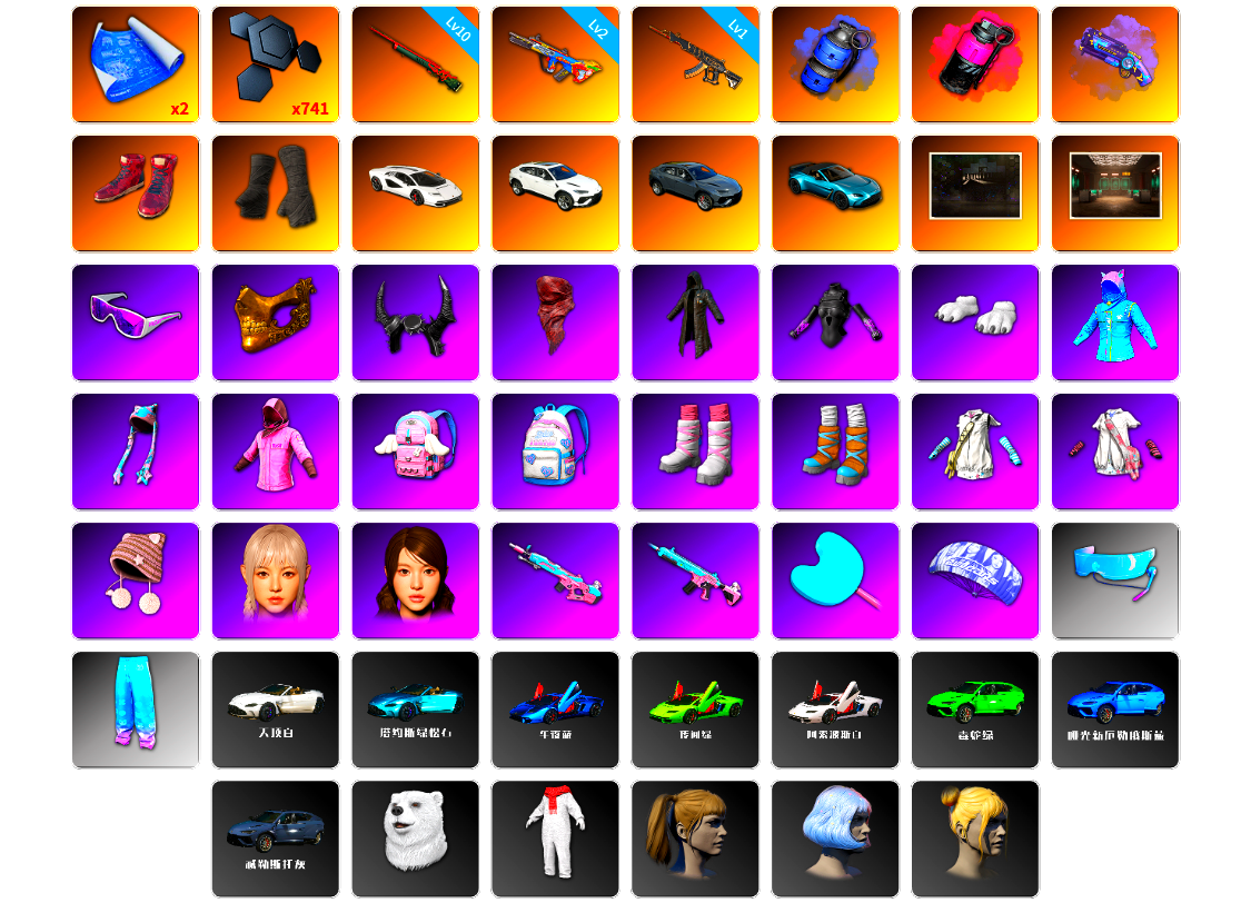 黑战神 柏林面具 柏林裤 橄榄锅 菠萝T 网鱼 10级南瓜M4 10级彩虹M24 10级恶魔ACE 10级霓虹AUG 10级玩偶炮 10级美杜莎762 10级暗影之主Mk12 6级圣诞AK 6级沙悟净MINI 6级无重力MP5K 6级烈日灼烧-S1897 2级虚空使者 1级多利安 霓虹AUG(异色) 南瓜M4(异色) 恶魔ACE(异色) 彩虹M24(异色) 圣诞AK(异色) 无重力(红异色) 暗影之主Mk12(异色) 紫色烟雾弹 天蓝色烟雾弹 珊瑚色烟雾弹 青色烟雾弹 翡翠色烟雾弹 乳白狂怒之雾-M79 湛蓝狂怒之雾-M79 柏林鞋 金叶手套 小黑盒 黑绷带 白绷带 小丑女 小丑男 兰博基尼SUV 迈凯伦硅质白版 马丁跑车 马丁敞篷跑车 马丁SUV 杜卡迪极速金 胜利密室 陈列室 冬季藏匿处 交易所接待室 武器神龛 6张图纸 1431聚合物 黑鬼 9s发型 滑雪镜 金面 渔夫帽 牛角 康萨斯 卡崔娜 丑男妆容 马东锡 橙色发带 红面巾 黑大衣 白战神 小战神 黄东 活动绿东 发光手臂 电磁背包 萨芬裤 白熊鞋 小叮当 2024女团 aespa女团 阿狸 小黄鸭 尼尔 布朗熊 拉风龙 小马尾 小绿头 丸子头 西游记 脏辫 爱的主打歌 青海摇 小兔学院 街头霸王 悲喜 PGC 2021套装 胜利之舞39 嘉米-加农钉 隆-升龙拳 哎呀!抱歉 枪炮洗礼 春丽凤翼扇