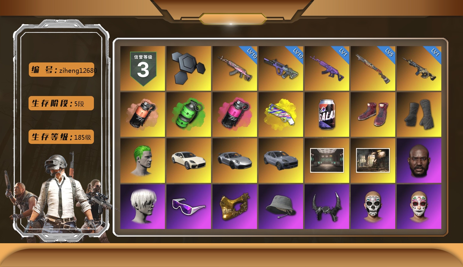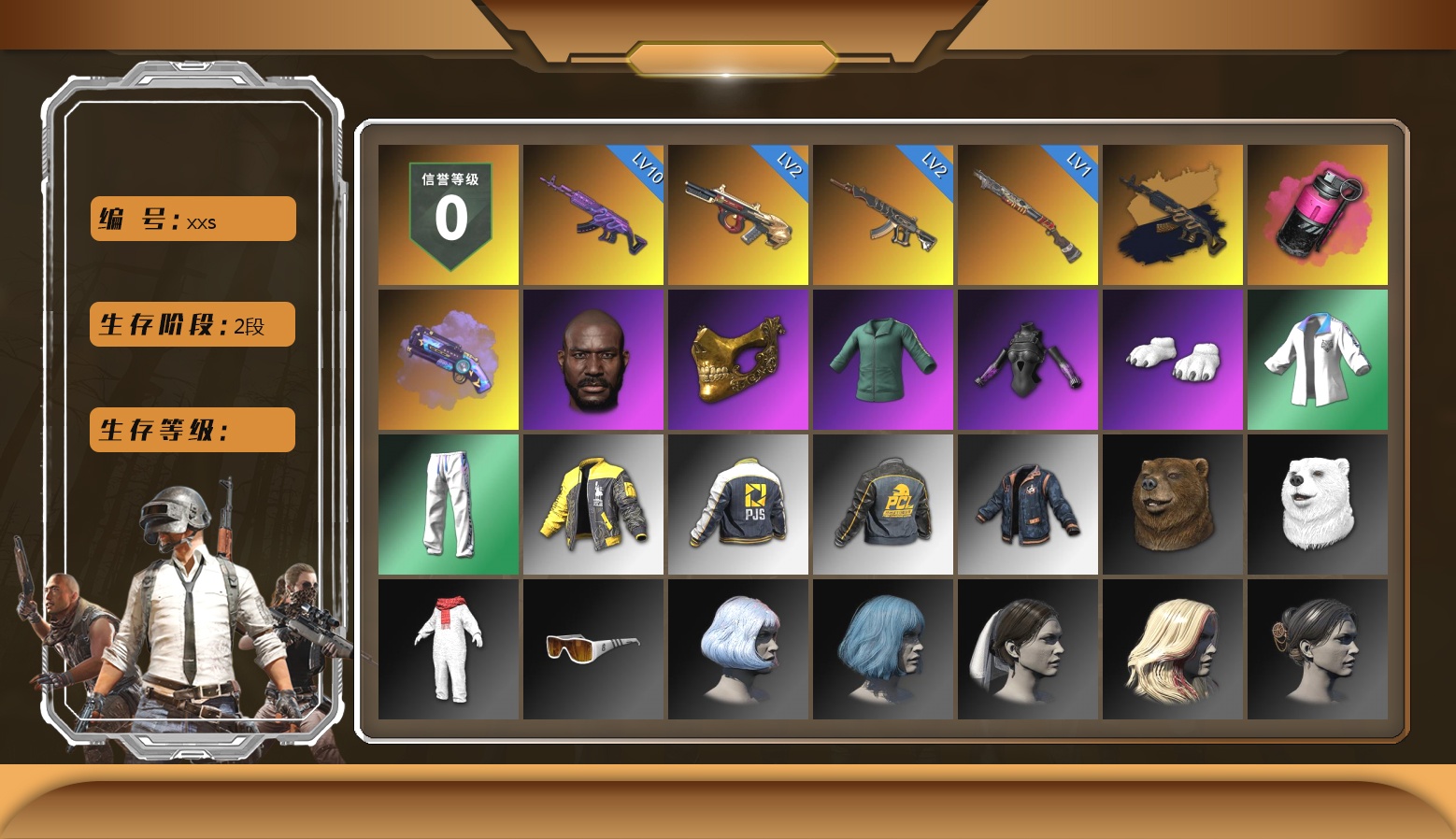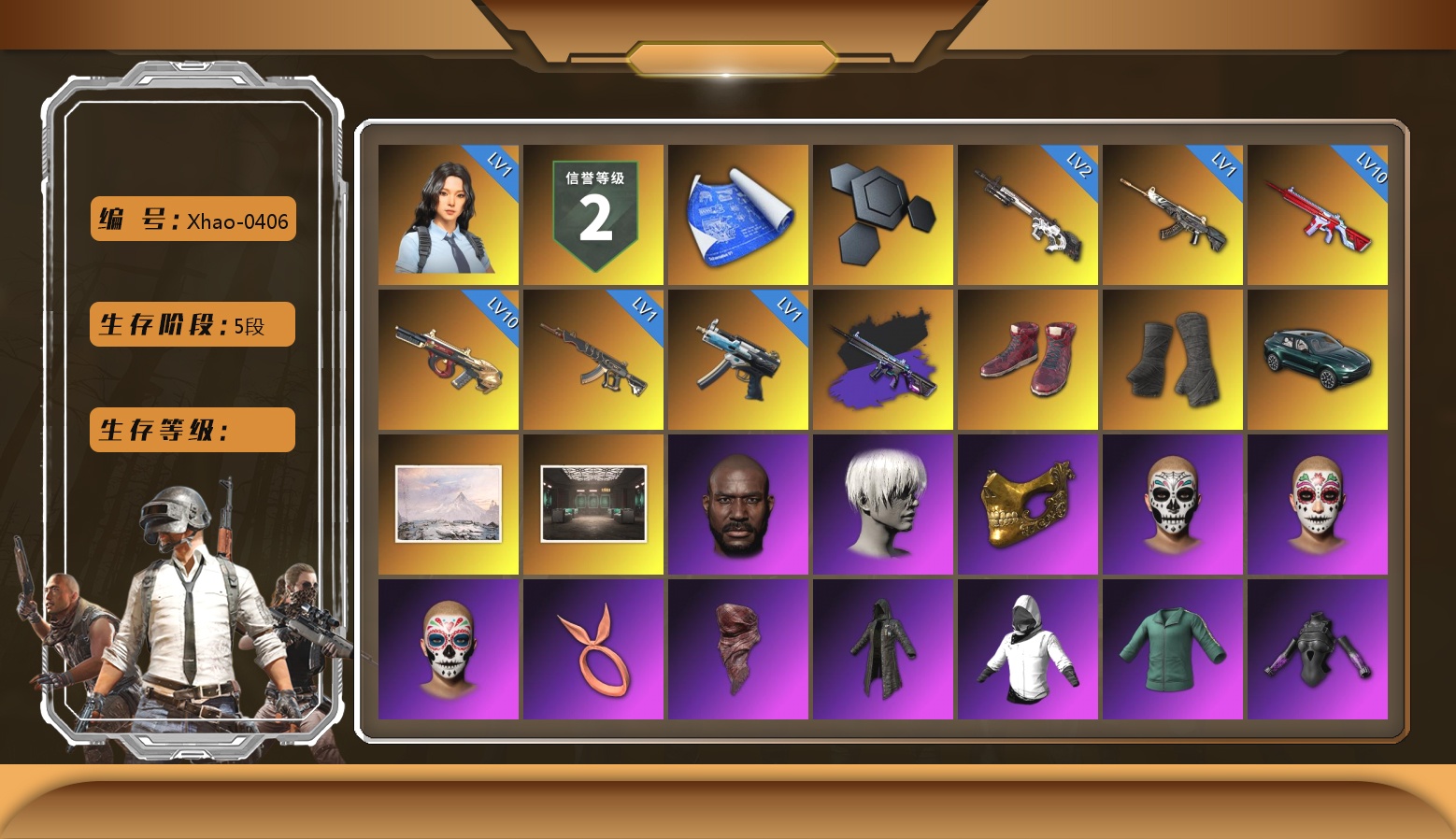 10级无信号M4 10级弥诺陶洛斯AUG 2级赛博MK12 1级瀚娜 1级恶魔ACE 1级妖魔之触ACE 1级寒蚀MP5K 无信号(紫异色) 柏林鞋 黑绷带 马丁SUV 冬季藏匿处 交易所接待室 6张图纸 6166聚合物 黑鬼 9s发型 金面 橙色发带 红面巾 黑大衣 白战神 活动绿东 发光手臂 萨芬裤 白熊鞋 小黄鸭 尼尔 拉风龙 小马尾 脏辫 青海摇 小兔学院 绷带AK