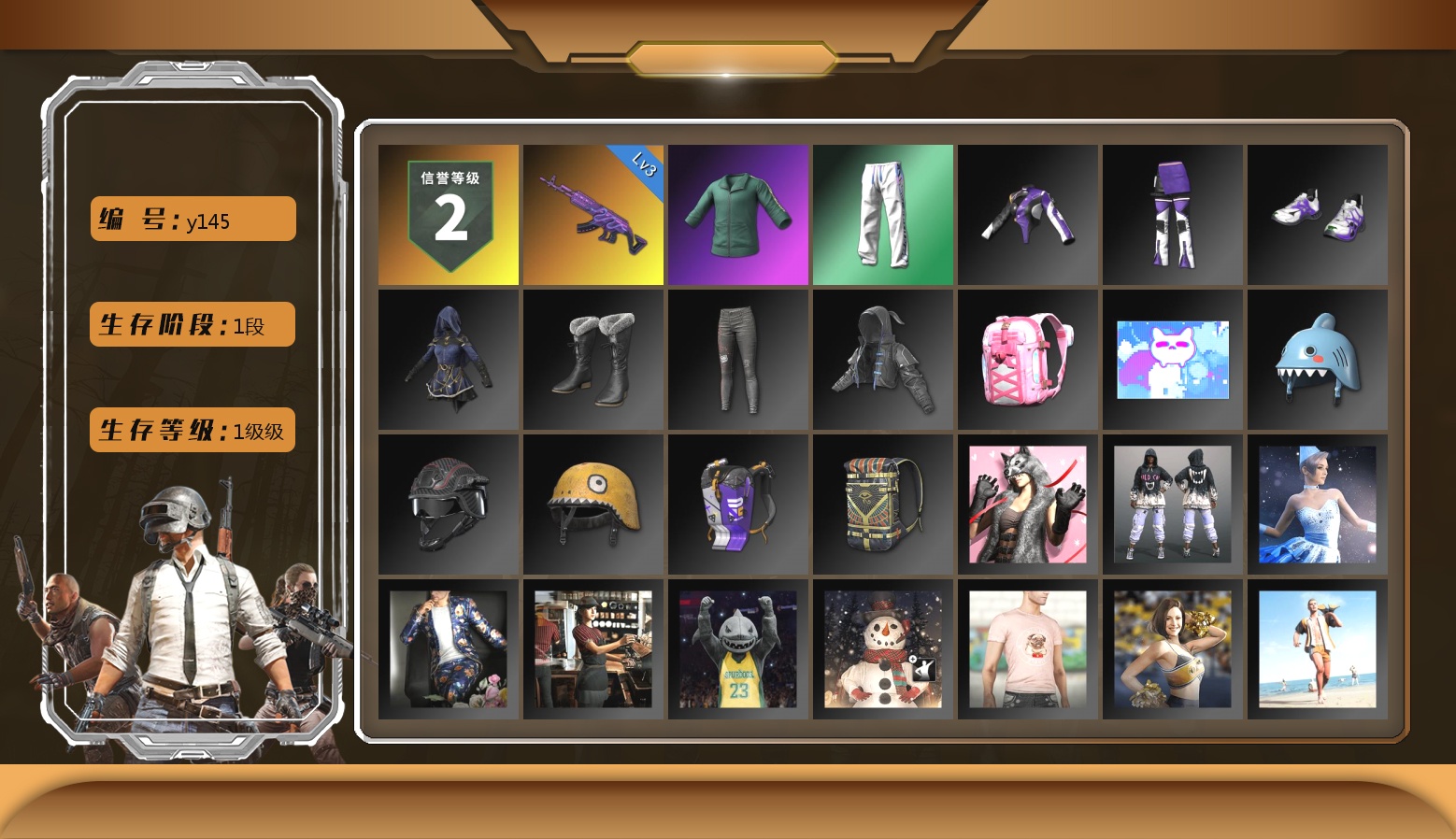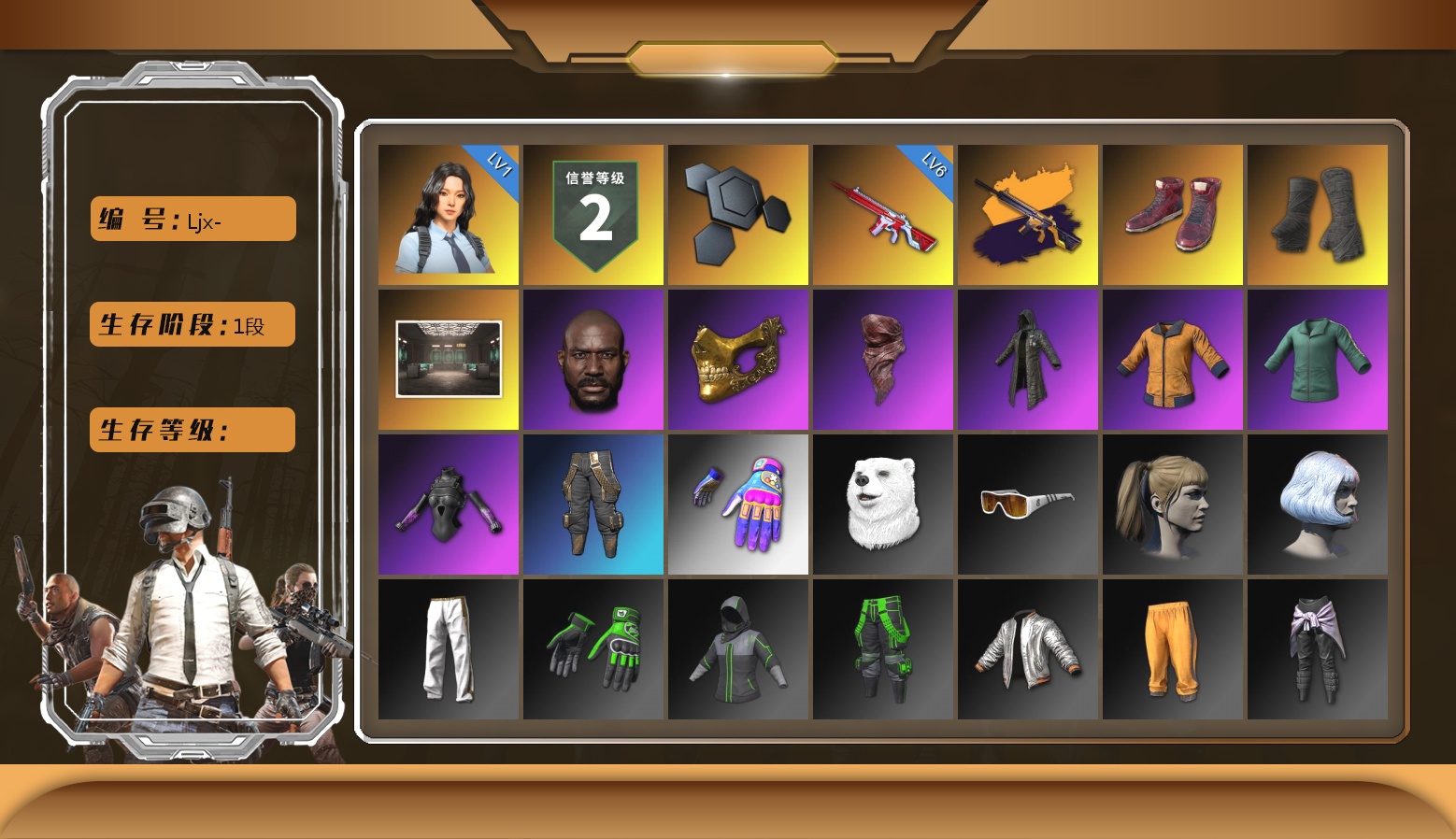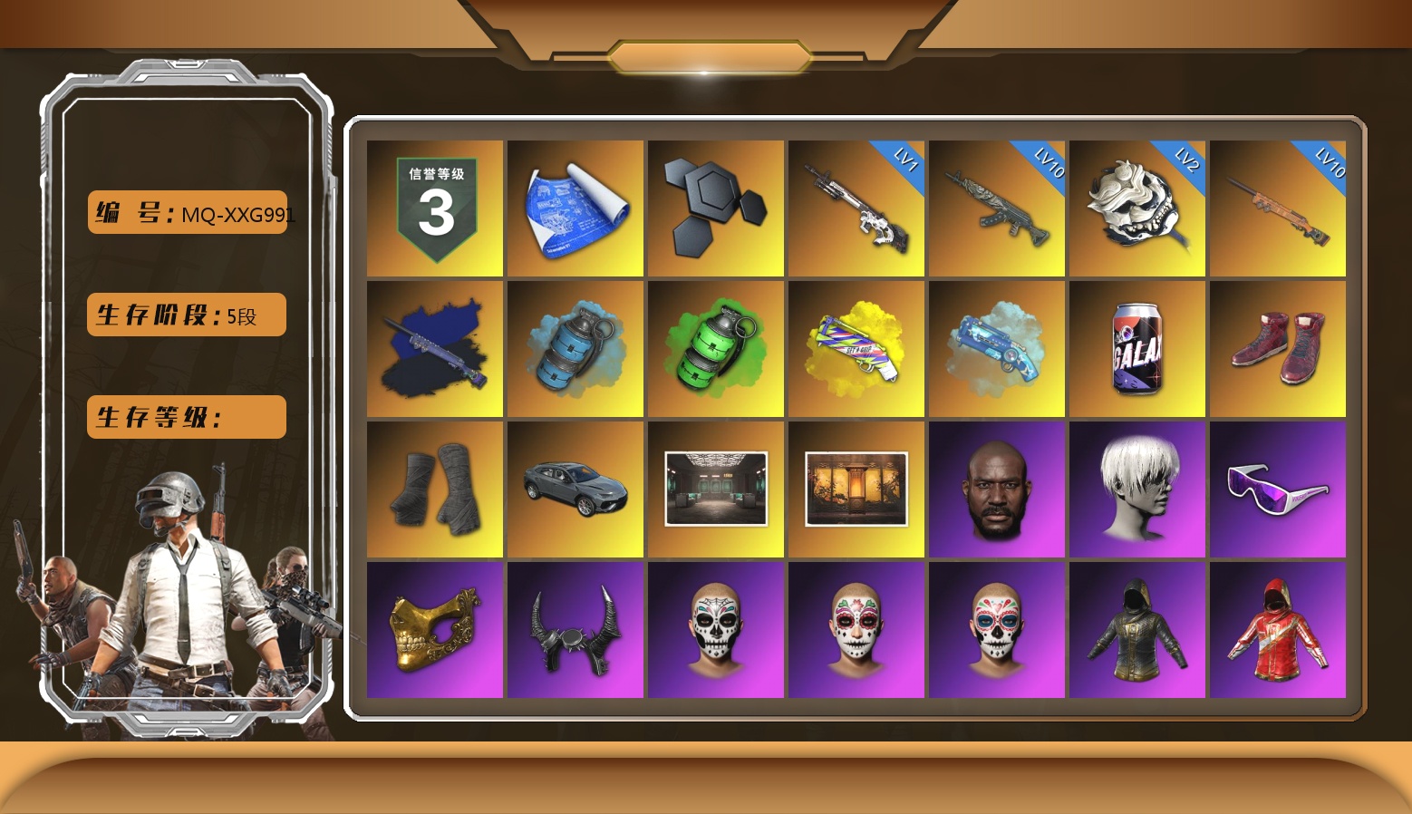 10级无信号M4 10级弥诺陶洛斯AUG 2级赛博MK12 1级瀚娜 1级恶魔ACE 1级妖魔之触ACE 1级寒蚀MP5K 无信号(紫异色) 柏林鞋 黑绷带 马丁SUV 冬季藏匿处 交易所接待室 6张图纸 6166聚合物 黑鬼 9s发型 金面 橙色发带 红面巾 黑大衣 白战神 活动绿东 发光手臂 萨芬裤 白熊鞋 小黄鸭 尼尔 拉风龙 小马尾 脏辫 青海摇 小兔学院 绷带AK