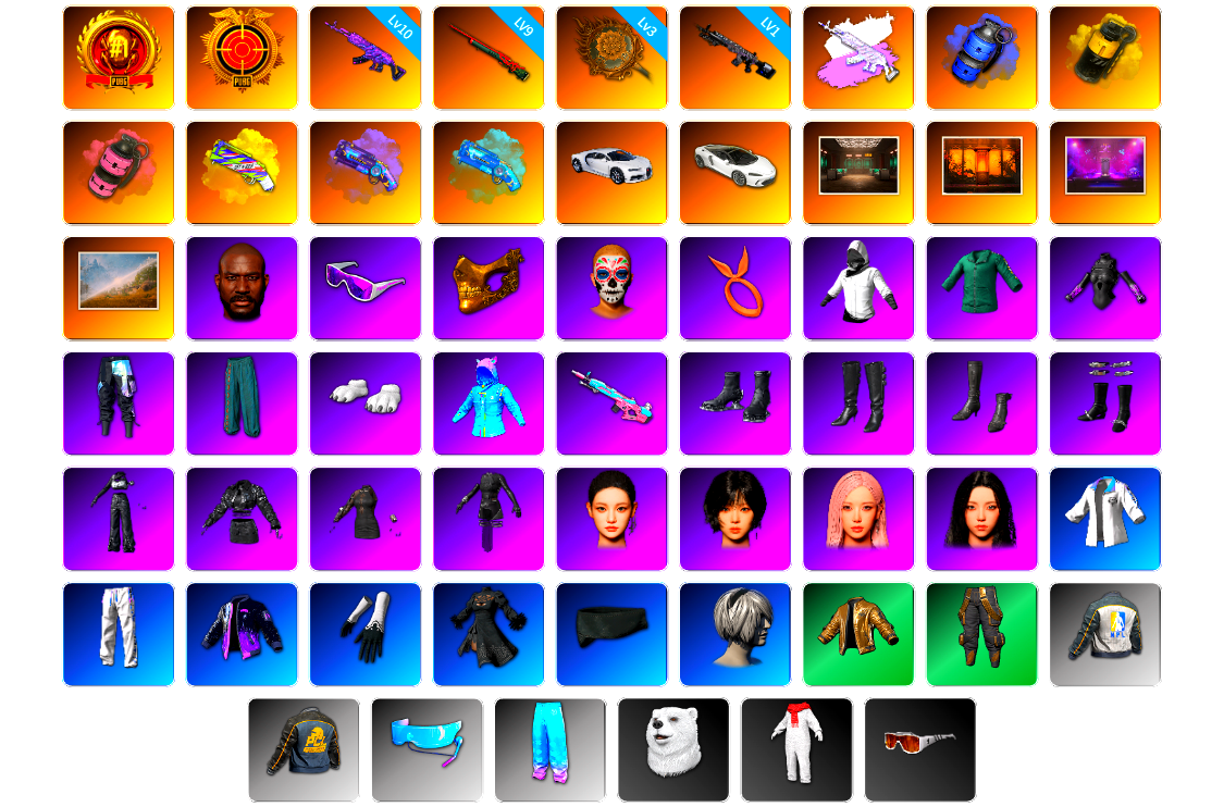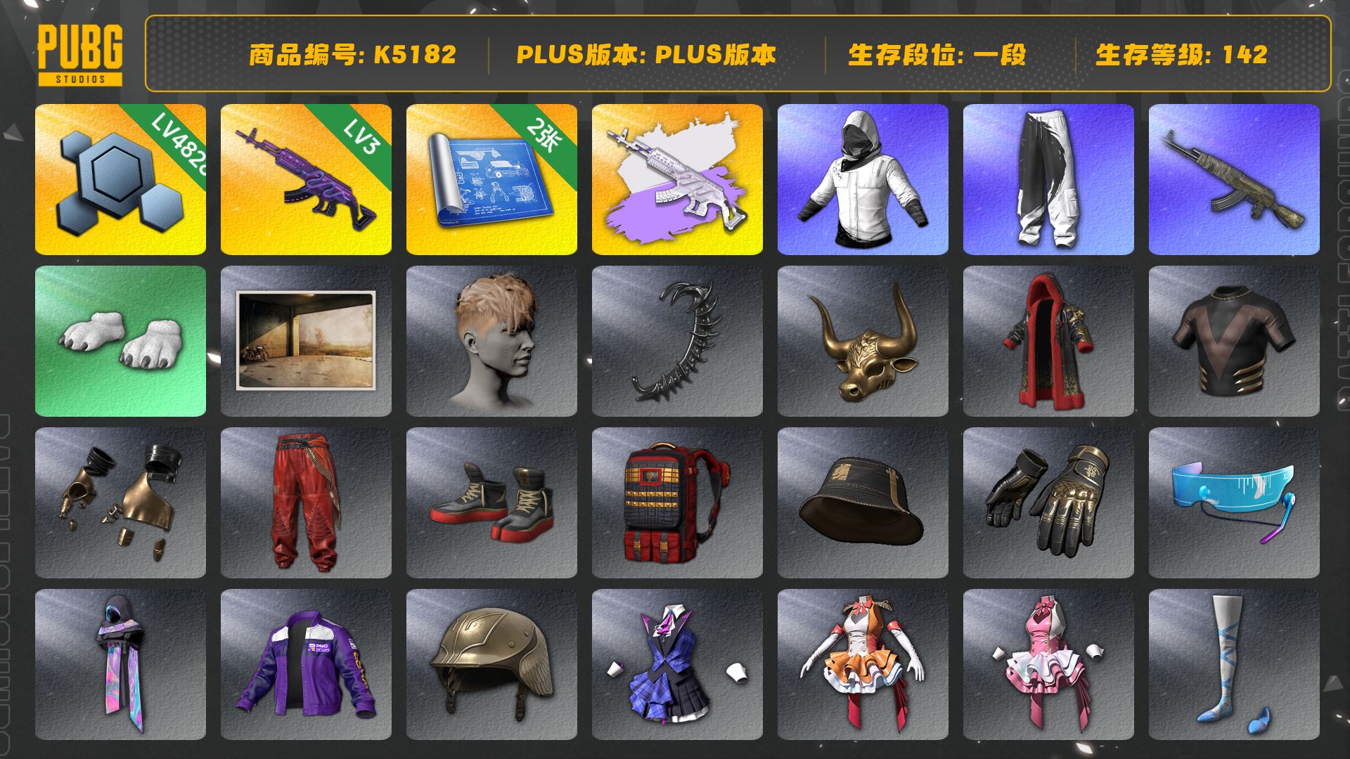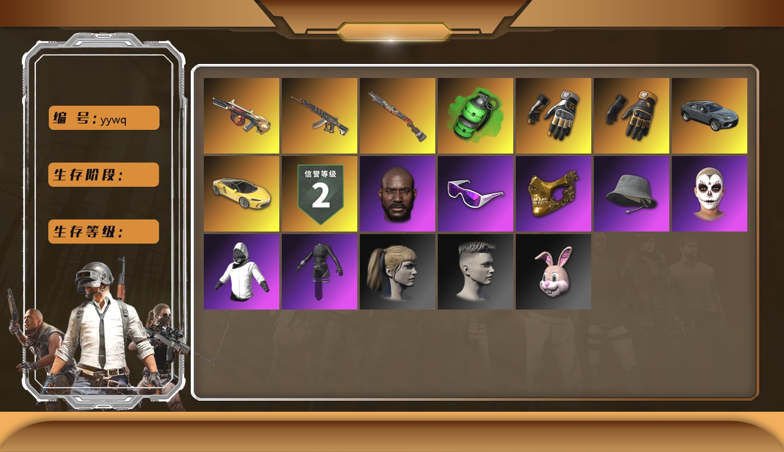 烈日灼烧 满级 弥诺陶洛斯AUG 5 妖魔之触 1 阿斯顿马丁DBX 烟雾弹 小兔学院 金手指 白战神 滑雪镜 金面 西游记 渔夫帽 卡崔娜 黑鬼 小马尾