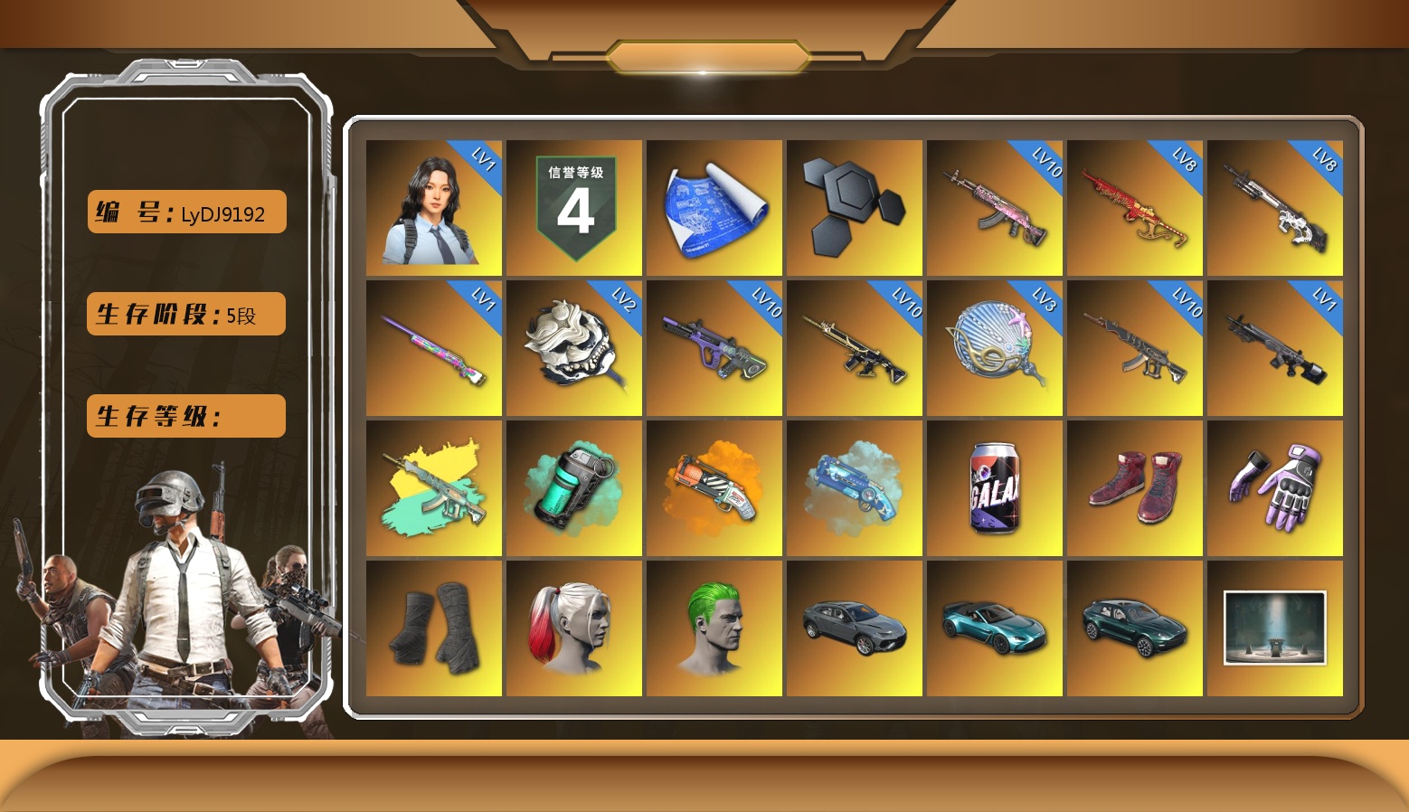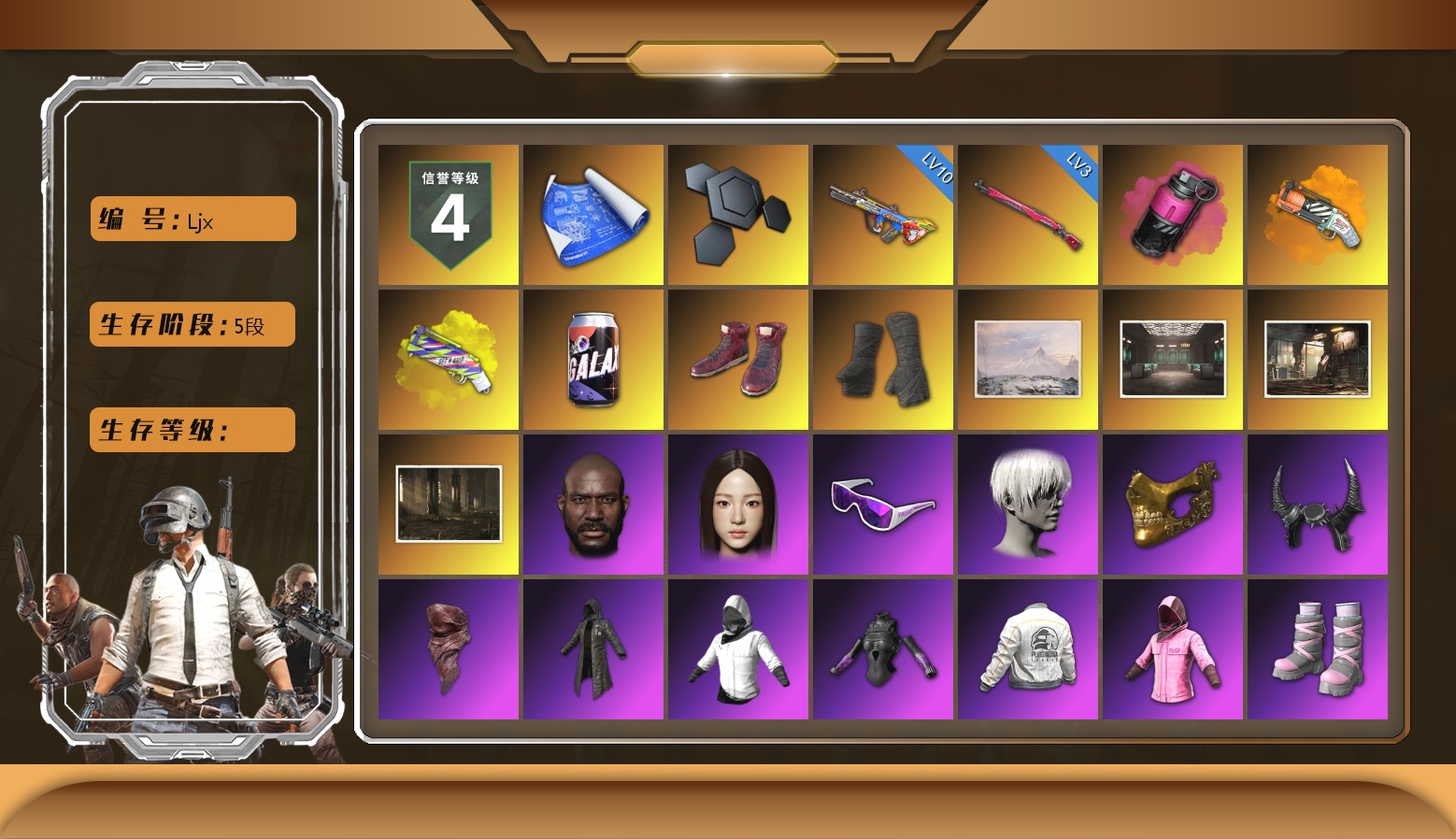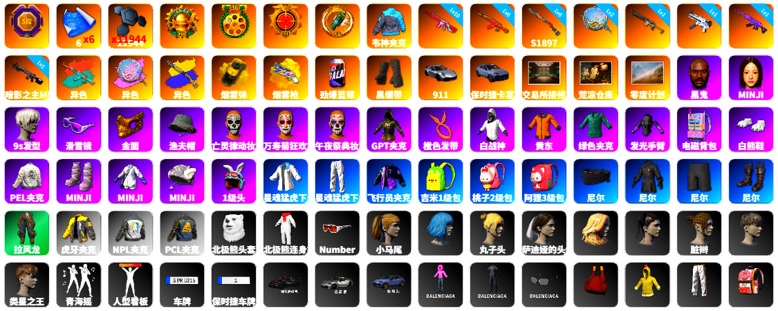 10级火麒麟 10级霓虹AUG 10级猪八戒M4 10级妖魔之触ACE 8级圣诞mini 8级赛博MK12 3级塞壬平底锅 2级白虎锅 1级瀚娜 1级彩虹M24 1级暗影之主Mk12 妖魔之触(异色) 青色烟雾弹 橙色狂怒之雾-M79 蓝色魔法迷雾-M79 柏林鞋 小黑盒 黑绷带 小丑女 小丑男 兰博基尼奢华版 马丁敞篷跑车 马丁SUV 胜利密室 交易所接待室 4张图纸 3392聚合物 9s发型 滑雪镜 金面 康萨斯 卡崔娜 丑男妆容 马东锡 橙色发带 红面巾 黑大衣 白战神 小战神 活动绿东 发光手臂 竞猜裤 白熊鞋 英特尔夹克 粉战神 aespa女团 滑雪帽 阿狸 小黄鸭 尼尔 拉风龙 小马尾 小绿头 粉头 西游记 脏辫 青海摇 小兔学院 悲喜 胜利之舞39