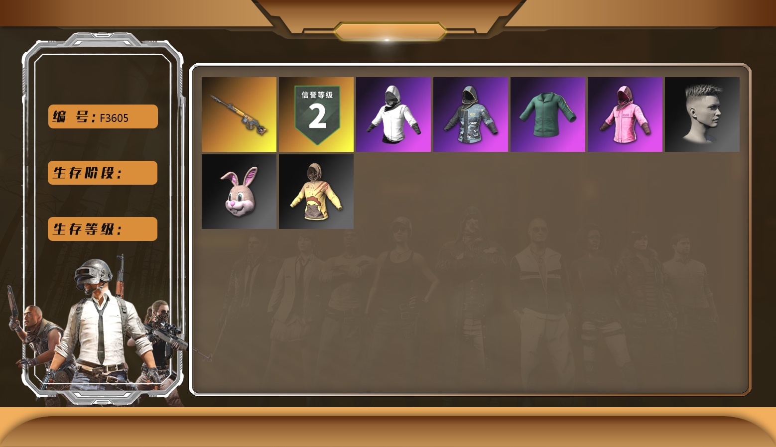 信誉等级三 10级彩虹M24 10级朱雀M4 10级青龙762 3级白虎锅 1级恶魔ACE 1级玄武SKS 1级玩偶炮 1级猪八戒M4 1级无重力MP5K 青龙762(异色) 无重力MP5K(异色) 紫色烟雾弹 天蓝色烟雾弹 橘色烟雾弹 翡翠色烟雾弹 黄色狂怒之雾-M79 小丑女 小丑男 小黑盒 迈凯伦玛瑙黑版 交易所接待室 9张图纸 7192聚合物 丑男妆容 内马尔 渔夫帽 滑雪镜 康萨斯 牛角 金面 黑绷带 柏林鞋 橙色发带 红面巾 黑大衣 活动绿东 发光手臂 电磁背包 白熊鞋 小叮当 小黄鸭 布朗熊 车漆 小马尾 小绿头 丸子头 脏辫 小兔学院 悲喜 绷带AK