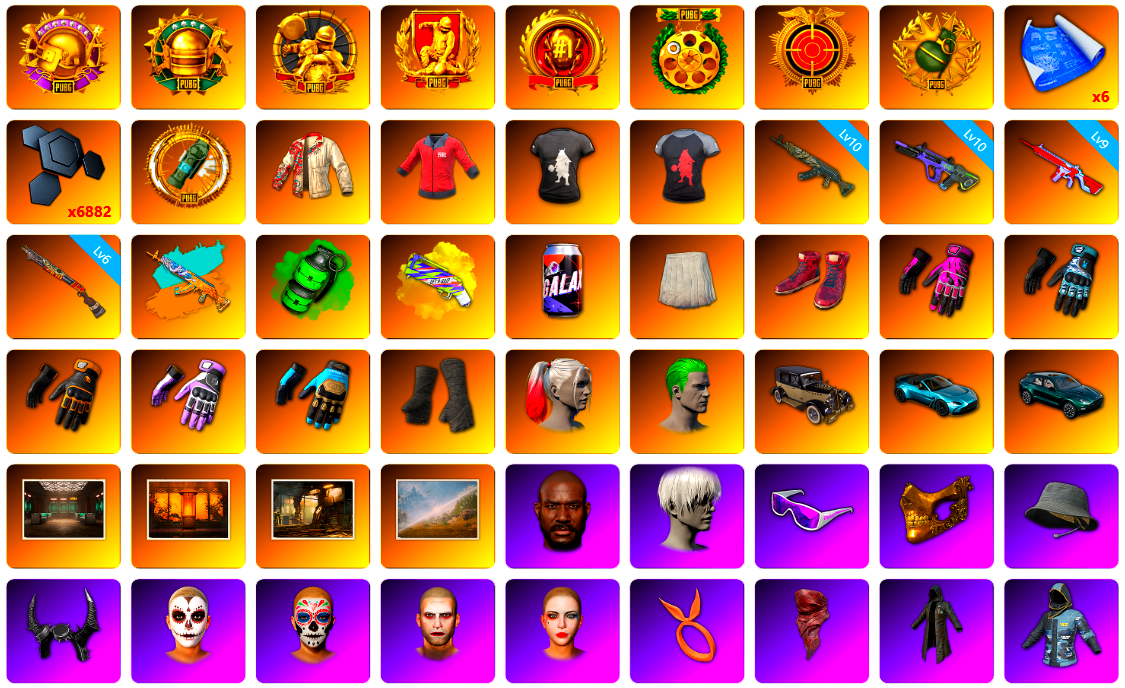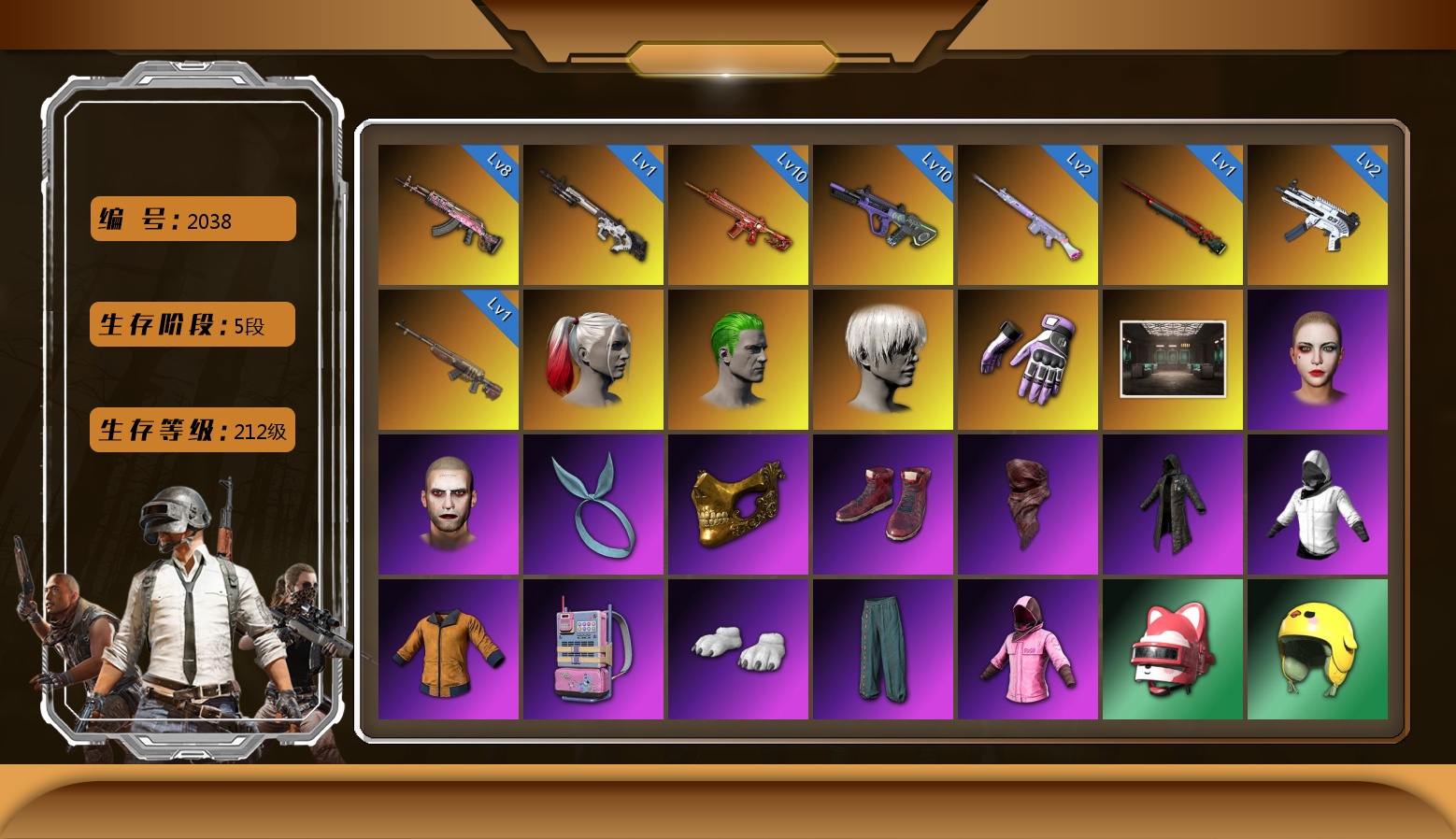 生存5阶段 收割者金标 捕食者金标 10级火麒麟 10级南瓜M4 5级圣诞mini 珊瑚色烟雾弹 青色烟雾弹 小丑男 9s发型 玩具手套 马丁敞篷跑车 交易所接待室 青蛙大炮 甜饼762 少女98k 丑男妆容 马东锡 卡崔娜 黑鬼 渔夫帽 滑雪镜 牛角 金面 黑绷带 柏林鞋 橙色发带 红面巾 黑大衣 青蛙套 粉战神 女团 白熊鞋 发光手臂 拉风龙 鸡斯卡夹克 车漆 小马尾 丸子头 西游记 脏辫 小兔学院 悲喜 绷带AK 滑雪帽 PGC 2021套装