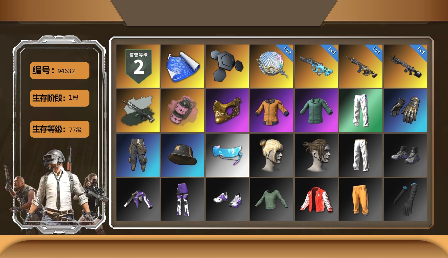 信誉等级四 猎手金 神枪手金 小黑盒 10级朱雀M4 10级霓虹AUG 8级火麒麟 2级无重力MP5K 2级玩偶炮 1级赛博MK12 1级孙悟空M24 9张图纸 7818聚合物 蜗牛币 小丑女 小丑男 交易所接待室 丑男妆容 康萨斯 金面 柏林鞋 红面巾 黑大衣 白战神 黄东 萨芬裤 粉战神 白熊鞋 电磁背包 阿狸 尼尔 9s发型 拉风龙 小马尾 脏辫