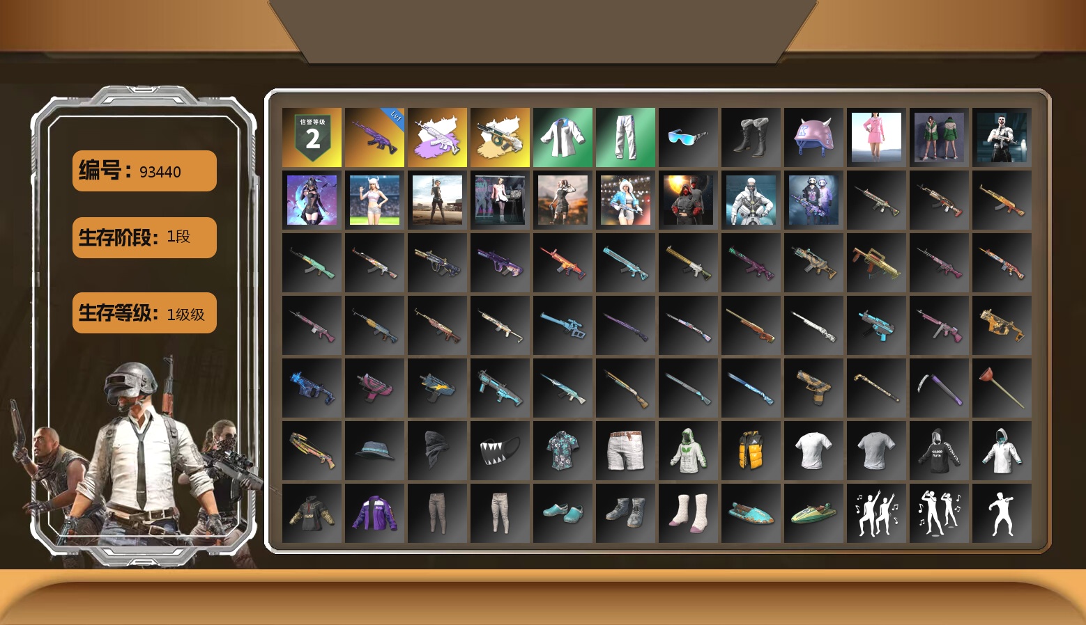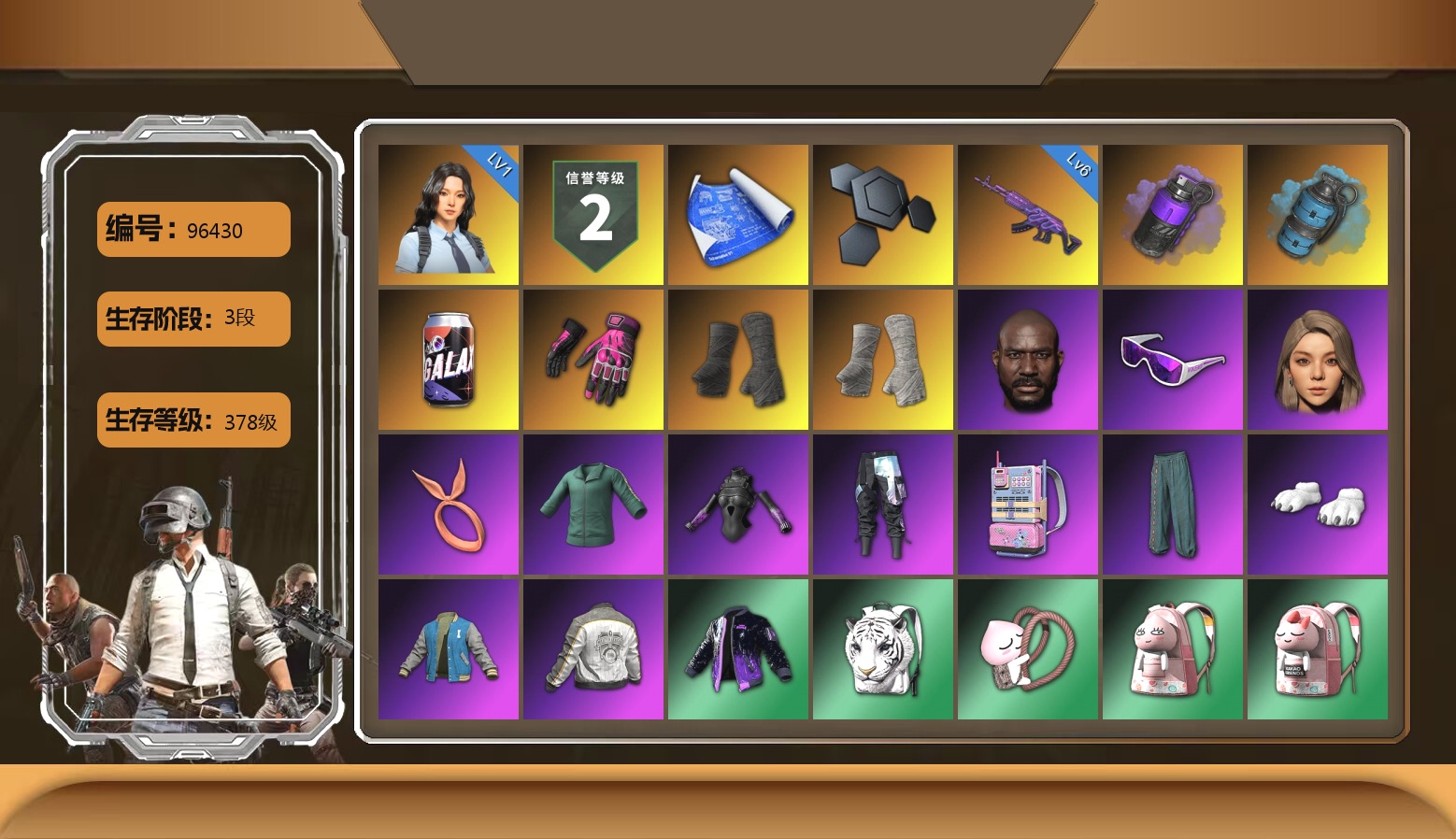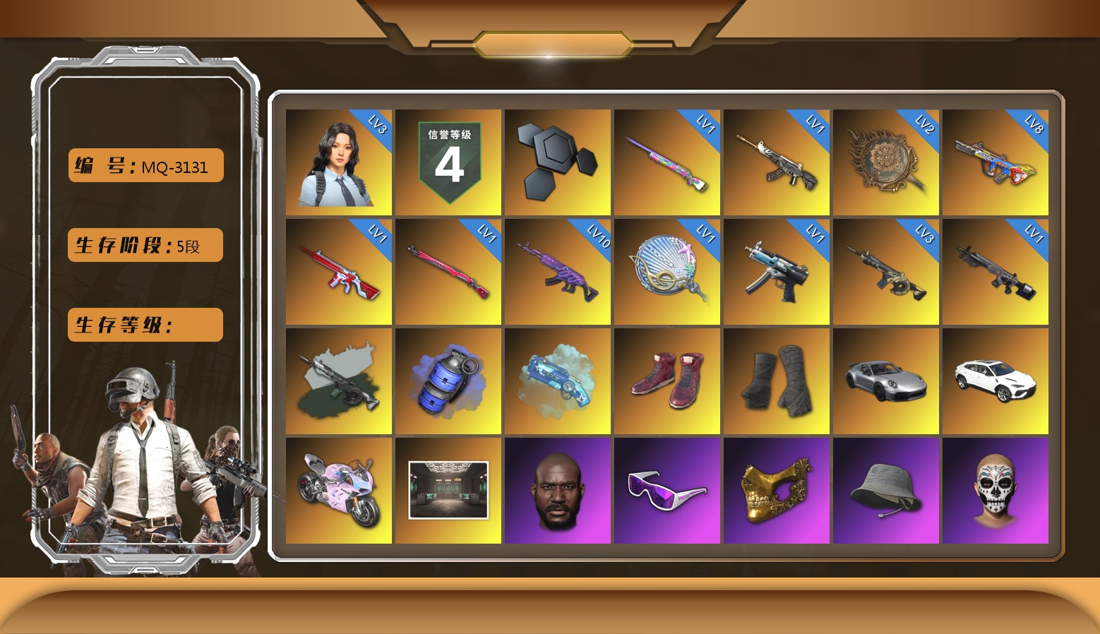 10级美杜莎762 8级爆裂AUG 3级瀚娜 3级时空使者M4 2级唐三藏平底锅 1级彩虹M24 1级恶魔ACE 1级无信号M4 1级午夜惊魂98K 1级塞壬平底锅 1级寒蚀MP5K 1级暗影之主Mk12 时空使者M4(异色) 蓝色烟雾弹 蓝色魔法迷雾-M79 柏林鞋 黑绷带 保时捷911 兰博基尼SUV 杜卡迪暮光粉 交易所接待室 4814聚合物 黑鬼 滑雪镜 金面 渔夫帽 橙色发带 红面巾 黑大衣 白战神 黄东 活动绿东 发光手臂 萨芬裤 白熊鞋 小叮当 粉战神 滑雪帽 拉风龙 小马尾 丸子头 青海摇 小兔学院 悲喜 绷带AK