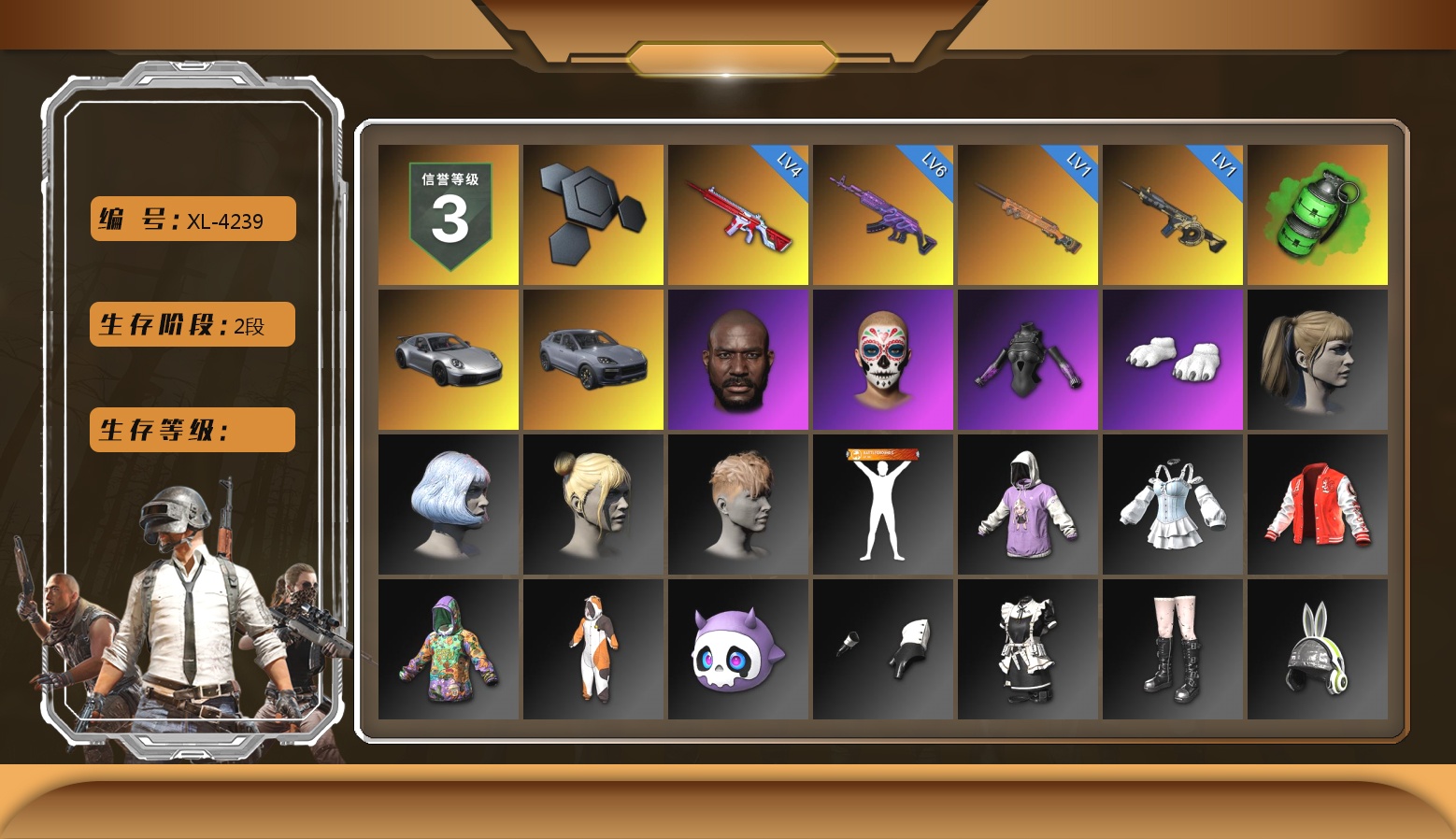 6级美杜莎762 4级无信号M4 1级夜曲M24 1级时空使者M4 翡翠色烟雾弹 保时捷911 保时捷卡宴 12948聚合物 黑鬼 发光手臂 白熊鞋 滑雪帽 小马尾 丸子头 悲喜 西游记 胜利之舞39