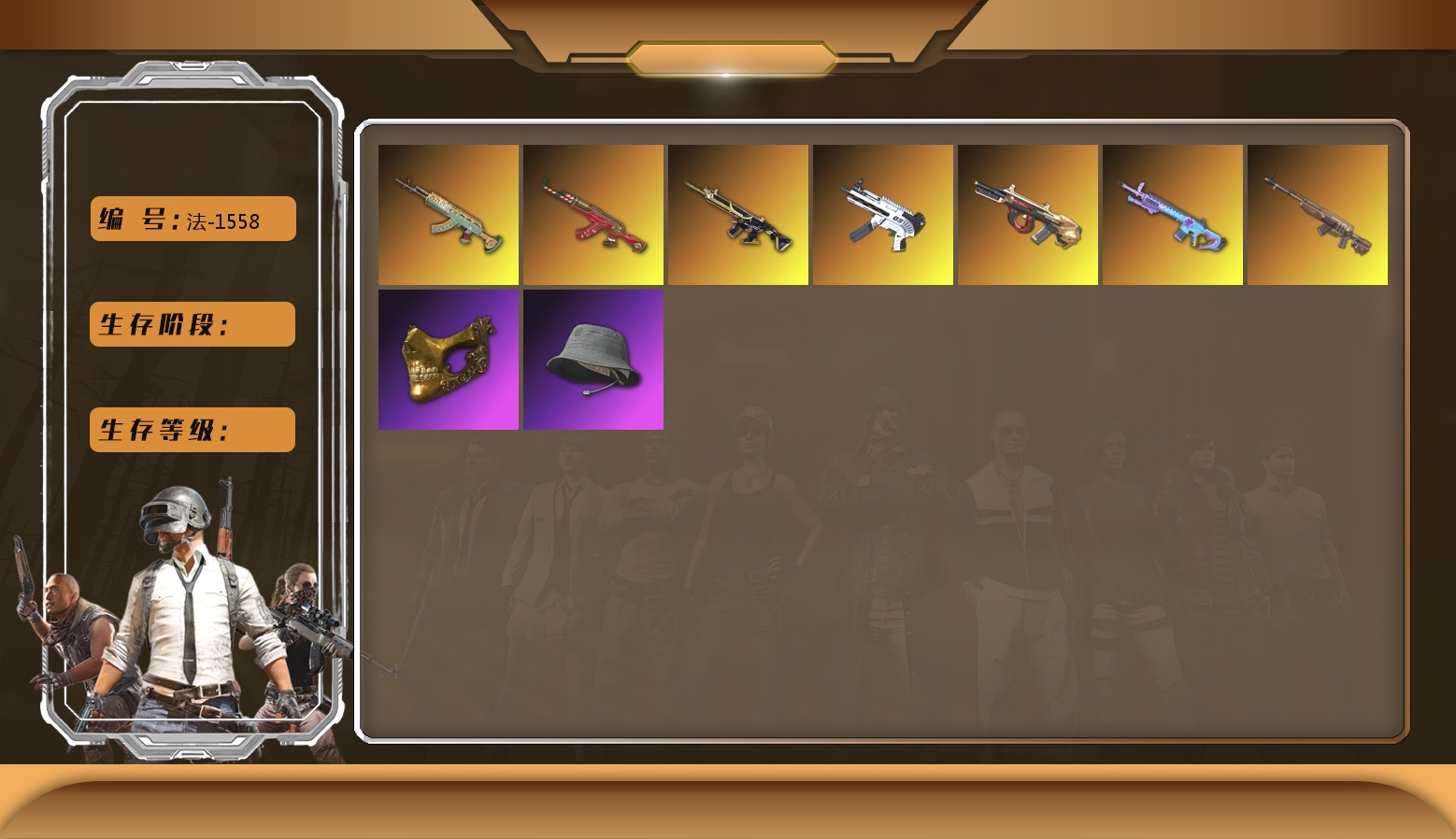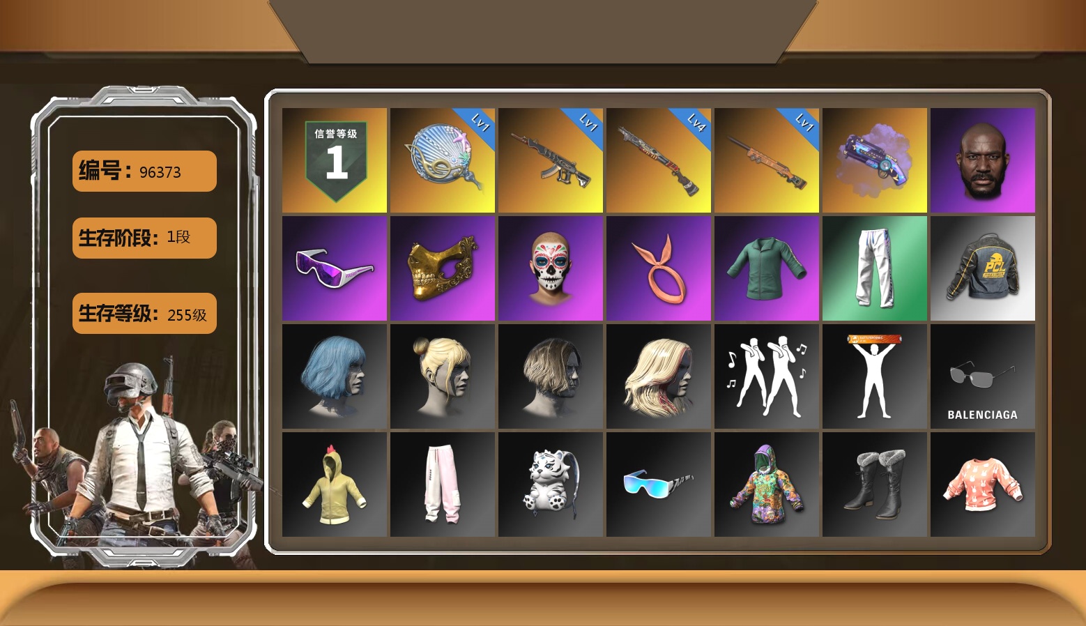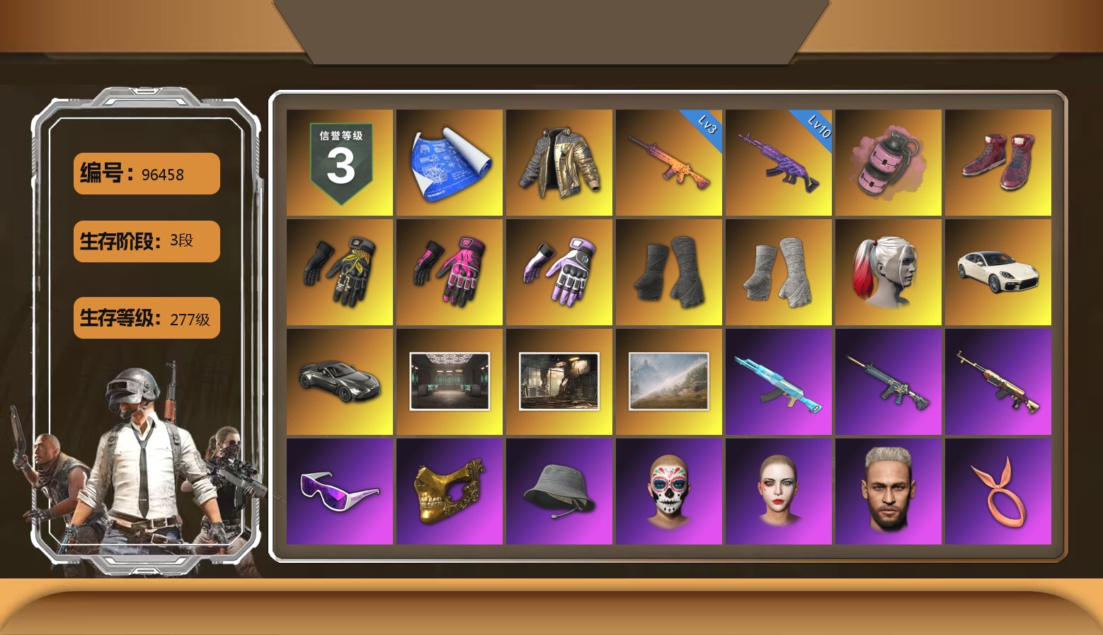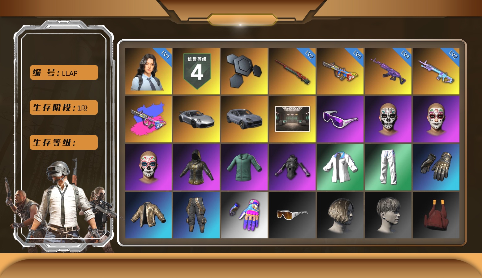 1113级 信誉等级3 圣诞ak 6级 猪八戒m4 5级 弥诺aug 5级 深渊762 2级 无重力 魔咒mk12 时光sks 2021pgc黄金面具 渔夫帽 白色滑雪镜 白战神 尼尔套 拉风龙套 悲喜战神套 北极熊套 赛博套 沙悟净套