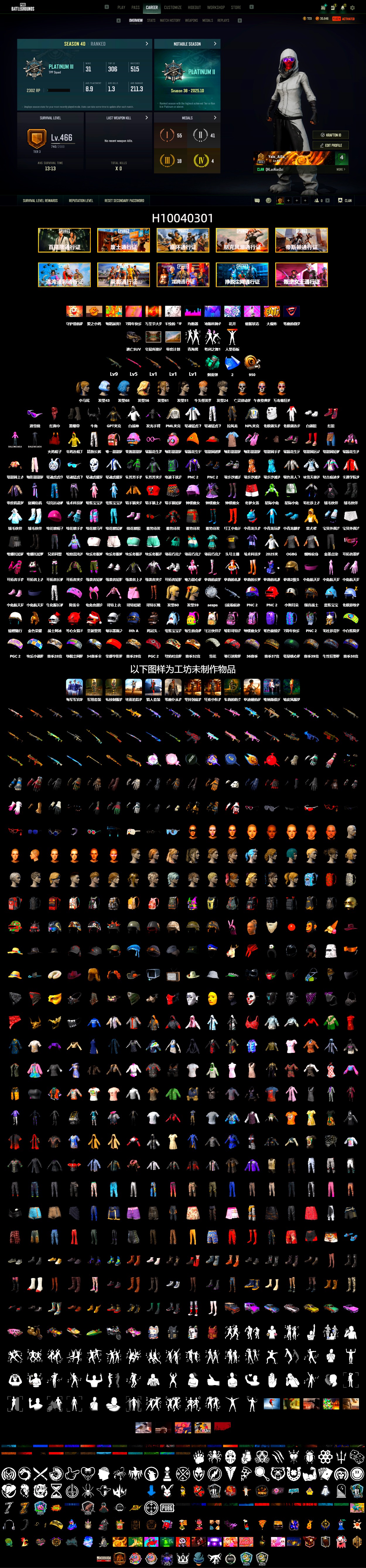 H10040301 3阶段466 9级青龙762 5级午夜惊魂98K 1级时光加农SKS 1级烈日灼烧-S1897 1级时空使者M4 青色烟雾弹 柏林鞋 黑绷带 交易所接待室 滑雪镜 牛角 红面巾 白战神 发光手臂 白熊鞋 拉风龙 小马尾 青海摇 小兔学院