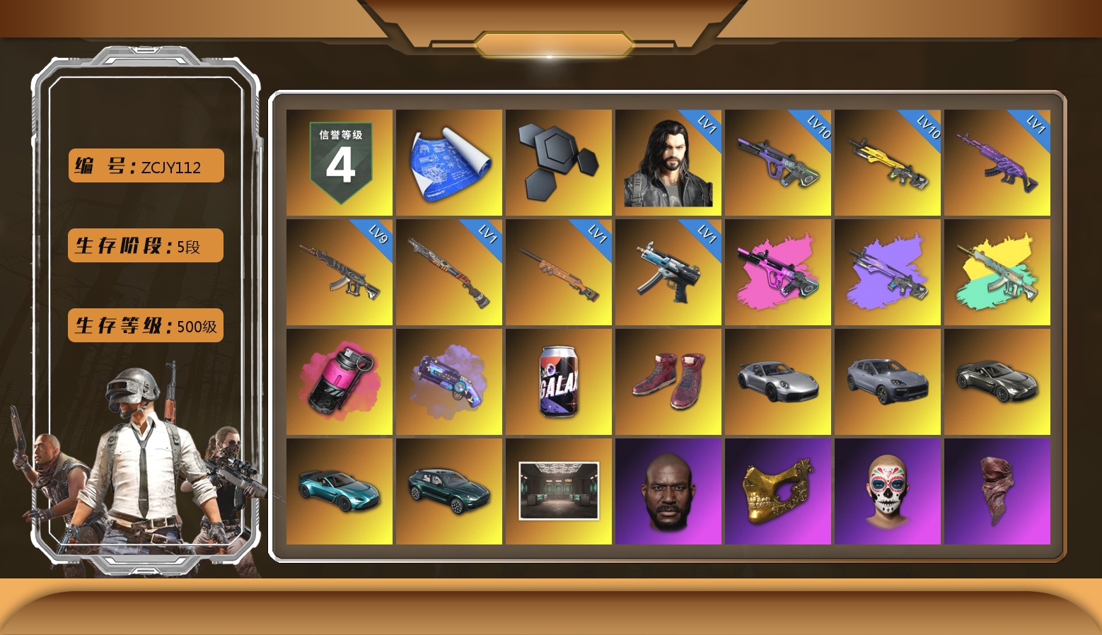 10级霓虹AUG 10级小兔MK12 9级妖魔之触ACE 1级多利安 1级美杜莎762 1级烈日灼烧-S1897 1级夜曲M24 1级寒蚀MP5K 霓虹AUG(异色) 小兔MK12(异色) 妖魔之触(异色) 品红色烟雾弹 紫色魔法迷雾-M79 柏林鞋 保时捷911 保时捷卡宴 马丁跑车 马丁敞篷跑车 马丁SUV 交易所接待室 1张图纸 7270聚合物 黑鬼 金面 红面巾 黑大衣 活动绿东 发光手臂 白熊鞋 丸子头 西游记 胜利之舞39