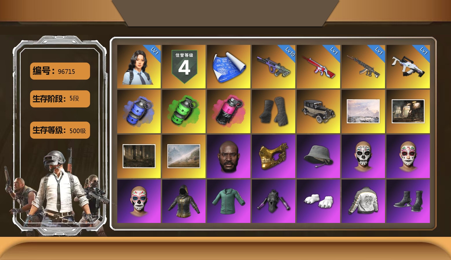 ❤找回包赔❤编号96715皮肤:信誉等级四 1级瀚娜 10级霓虹AUG 1级无信号M4 1级冰域Groza 1级妖魔之触ACE 蓝色烟雾弹 翡翠色烟雾弹 品红色烟雾弹 4张图纸 黑绷带 逃亡SUV 冬季藏匿处 荒凉仓库 艾伦格重制 零度计划 黑鬼 金面 渔夫帽 亡灵律动妆容 万寿菊狂欢妆容 午夜祭典妆容 GPT夹克 活动绿东 发光手臂 白熊鞋 PML夹克 aespa女团 宁艺卓 星魂猛虎下山运动夹克 星魂猛虎下山运动裤 飞行员夹克 北极熊连身衣 小马尾 发型21 发型56 发型61 牛头怪发型 发型24 青海摇 胜利之舞166 人型看板 巴黎世家冬季25羽绒套装 巴黎世家冬季25标准套装 巴黎世家比基尼 巴黎世家透明方形墨镜 巴黎世家背包(3级) 巴黎世家背包(2级) 巴黎世家背包(1级) 火鸡帽子 非鸡连帽卫衣 精致长裤 唯一甜甜圈背包(3级) 暴躁花生墨镜 釉彩甜甜圈面具 暴躁花生针织帽 甜甜圈遮阳帽 釉彩甜甜圈衬衫 釉彩甜甜圈手套 甜甜圈手套 釉彩甜甜圈运动鞋 暴躁花生运动鞋 甜甜圈运动鞋 甜甜圈短裤 暴躁花生连帽卫衣 暴躁花生长裤 甜甜圈上衣