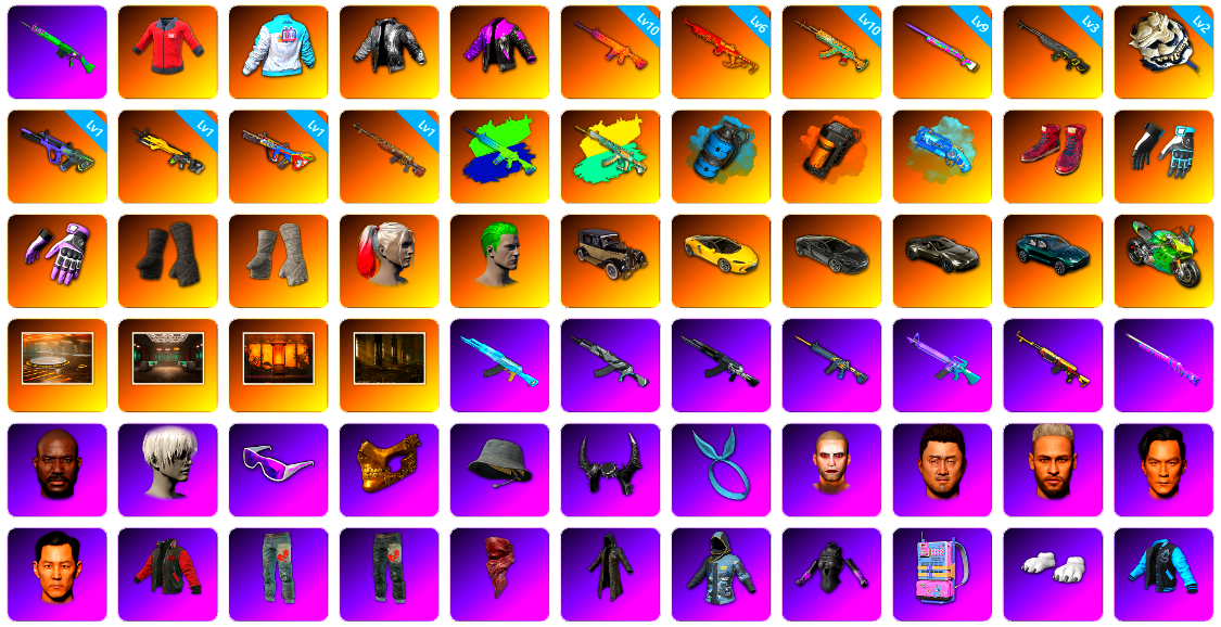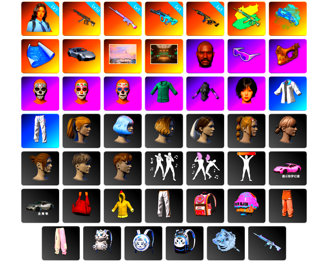 青蛙大炮 红东 B站 网鱼 小黑盒夹克 10级南瓜M4 6级圣诞mini 10级水麒麟 9级彩虹M24 3级玄武SKS 2级白虎锅 1级霓虹AUG 1级小兔MK12 1级爆裂AUG 1级时光加农SKS 南瓜M4(异色) 妖魔之触(异色) 天蓝色烟雾弹 橘色烟雾弹 蓝色魔法迷雾-M79 柏林鞋 大魔王 黑绷带 白绷带 小丑女 小丑男 跑车 迈凯伦玛瑙黑版 马丁跑车 马丁SUV 杜卡迪翡翠绿 陈列室 交易所接待室 武器神龛 玩具AK 黑鬼 9s发型 滑雪镜 金面 渔夫帽 牛角 康萨斯 丑男妆容 马东锡 内马尔 红面巾 黑大衣 小战神 发光手臂 电磁背包 白熊鞋 英特尔夹克 青蛙套 橙运动 监狱服 渐变装 粉战神 阿狸 小黄鸭 尼尔 布朗熊 拉风龙 鸡斯卡夹克 车漆 小马尾 小绿头 丸子头 西游记 脏辫 爱的主打歌 青海摇 小兔学院 悲喜 绷带AK PGC 2021套装 胜利之舞39