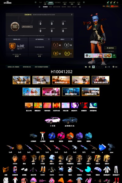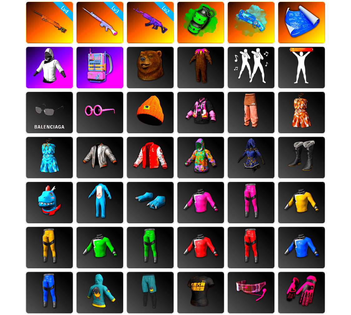 9级美杜莎762 8级猛虎98k 6级烈日灼烧-S1897 2级唐三藏平底锅 2级无重力MP5K 1级夜曲M24 1级时空使者M4 珊瑚色烟雾弹 青色烟雾弹 柏林鞋 黑绷带 小丑女 布加迪跑车 布加迪奢华版跑车 杜卡迪暮光粉 交易所接待室 6张图纸 2126聚合物 黑鬼 滑雪镜 金面 渔夫帽 牛角 康萨斯 卡崔娜 红面巾 黑大衣 活动绿东 发光手臂 电磁背包 萨芬裤 阿狸 拉风龙 丸子头 西游记 小兔学院 悲喜