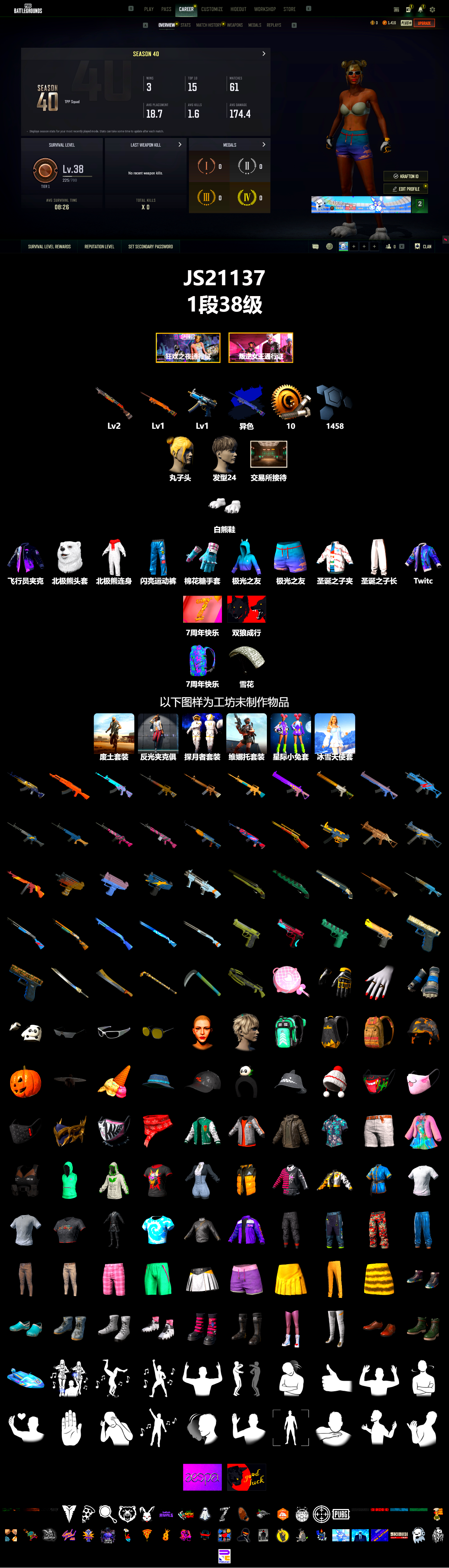❤找回包赔❤编号JS21137皮肤:免费版 蜗牛币 1458聚合物 2级烈日灼烧-S1897 1级夜曲M24 1级寒蚀MP5K 夜曲M24(异色) 交易所接待室 白熊鞋 飞行员夹克 北极熊头套 北极熊连身衣 丸子头 发型24 闪亮运动裤 棉花糖手套 极光之友 极光之友 圣诞之子夹克 圣诞之子长裤 Twitch Rivals 复古飞行员夹克 7周年快乐! 双狼成行 7周年快乐背包(3级) 雪花 废土套装 反光夹克俱乐部套装 探月者套装 维娜托套装 星际小兔套装 1 冰雪天使套装 PGC 2023 皇冠宝石 - Beryl M762 粗糙 (橙色) - AKM 分形碎片 - ACE32 锁链帮 - M16A4 游猎之旅 - M16A4 双色 - M16A4 分形碎片 - Mk47 Mutant 金色落叶 - Mk47 Mutant 淡雅之力 - Mk47 Mutant 钴蓝呼号 - G36C 钴蓝呼号 - K2 圆点猎手 - K2 水手 - K2 水手 - SLR 金色落叶 - SKS 银河武装 - SKS 镀金 - Win94 碰撞测试 - MP5K 游猎之旅 - UMP 钴蓝呼号 - UMP 淡雅之力 - 汤姆逊冲锋枪 锁链帮 - Micro UZI 淡雅之力 - Micro UZI 钴蓝呼号 - Micro UZI 灰色系 - DBS 都市猎手 - 锯短型霰弹枪 丛林潜行者 - 锯短型霰弹枪 数码沙漠迷彩 - 锯短型霰弹枪 游猎之旅 - S12K 锁链帮 - S12K 钴蓝呼号 - S1897 水手 - S1897 淡雅之力 - S1897 波涛荡漾 - S686 灰色系 - S686 都市猎手 - P92 恶战 - P92 丛林潜行者 - P92 沙漠烈阳 - 沙漠之鹰 数码沙漠迷彩 - P18C 数码丛林迷彩 - P18C 锦衣夜行佩刀 陶土质感大砍刀 PUBG信条钢管 淡雅之力 - 镰刀 都市猎手 - 十字弩 你的第一锅 - 平底锅 7周年快乐手套 维纳斯俱乐部手部装饰 小兔学院水手服手套 熊猫手套 蟒蛇之瞳墨镜 技工墨镜(白色) 老式太阳镜 维纳斯面部妆容 发型64 海泡背包(3级) 勇往直前背包(1级) 惠乔尔背包(1级) PUBG信条 - 头盔(2级) 南瓜头 锦衣夜行斗笠 7周年快乐甜筒帽 夏日渔夫帽(蓝绿色) 准备就绪鸭舌帽 熊猫发箍 露鳍鲨鱼渔夫帽 圣诞之子针织帽 恶魔的微笑口罩 可爱小猫咪口罩 准备就绪口罩 PGC 2023 帝皇的荆棘面具 朋克预备生口罩 圣诞快乐围巾 蟒蛇花园夹克 准备就绪夹克 邓肯的潜行者夹克 花衬衫(蓝绿色) 夏日短裤(灰色) 维纳斯俱乐部服饰 OCW 原型部门上衣 海泡无袖连帽卫衣 生存练习生连帽卫衣 疾驰杜宾犬T恤 铁娘子紧身衣 PUBG信条马甲 朋克预备生毛衣 7周年快乐夹克 驭龙勇士上衣 T 恤 (白色) T 恤 (灰色) 龙年大吉上衣 锦衣夜行装束 扎染T恤 PGC 2023 帝皇的皮革花边夹克 PNC 2025 夹克 准备就绪长裤 PCS6 浓墨重彩长裤 龙年大吉迷彩长裤 驭龙勇士长裤 战斗裤 (棕色) 战斗裤 (卡其色) 朋克预备生短裤 海泡短裤 7周年快乐短裙 “她的银河”短裤 拉拉队裙子 Guardian of the Groove Pants 蜂刺甜心短裙 PCS7 运动鞋 沙滩鞋(蓝绿色) 高帮运动鞋 海军军官系带靴 海泡运动鞋 朋克预备生短靴 PGC 2023 帝皇的防风靴 维纳斯俱乐部丝袜配长靴 7周年快乐长靴 Guardian of the Groove Shoes 圣诞之子短靴 “海洋幻想” 摩托艇 aespa - Dark Arts(第1部分) 胜利之舞136 胜利之舞100 #1 特殊问候 嫉妒 棒棒哒 投降 不耐烦 谢谢 停止! 抖缩 庆祝 同意 你好 大厅姿势1 你完蛋了 耸肩 过来 祝你好运 生存等级:1段