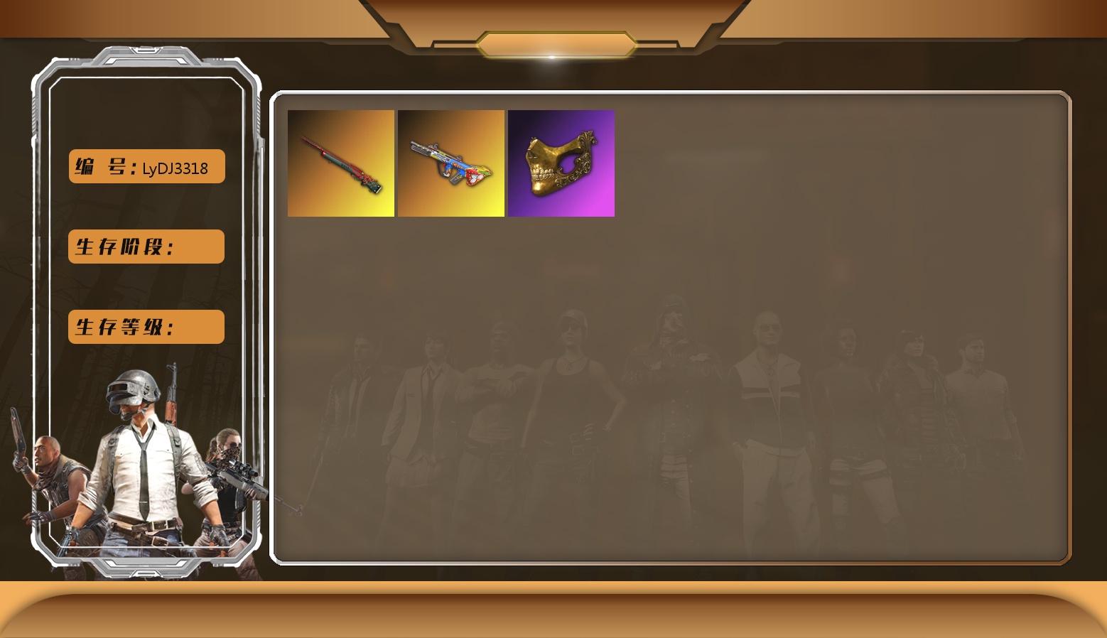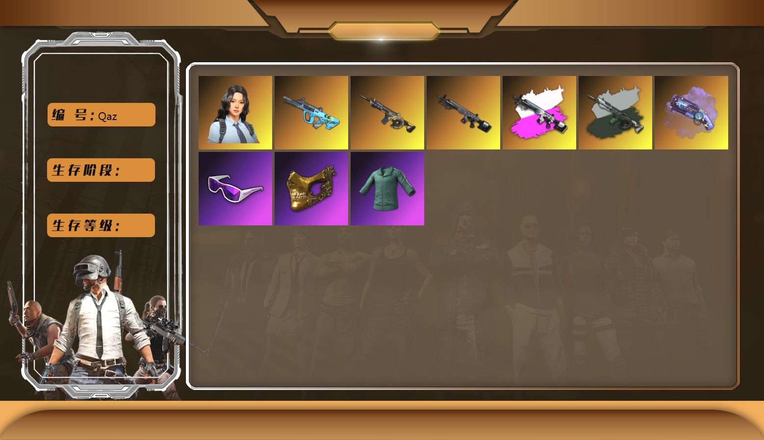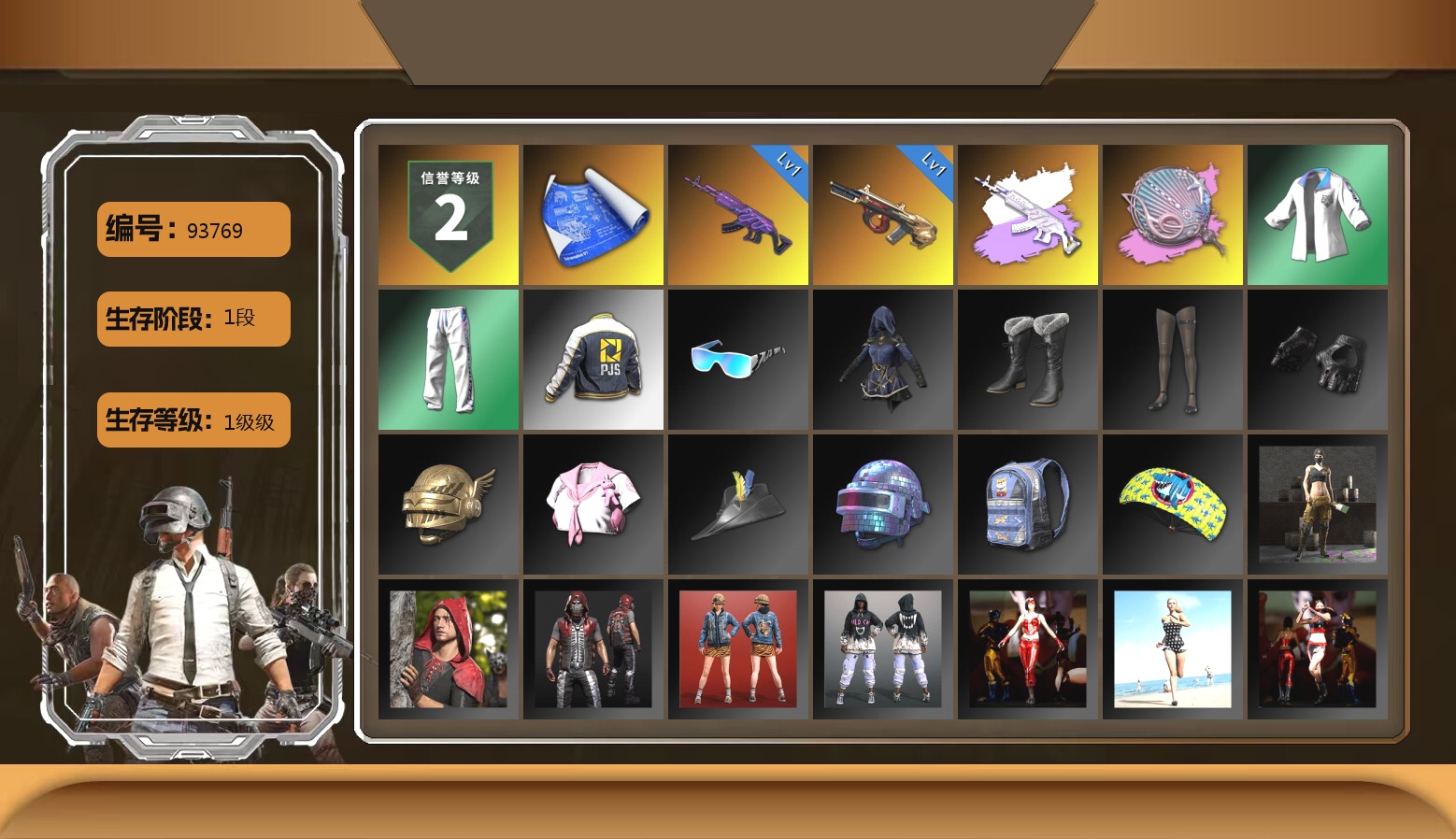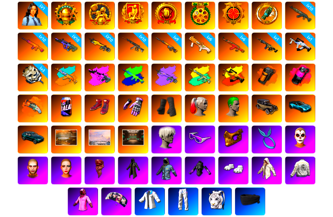 1级瀚娜 10级青龙762 10级南瓜M4 10级霓虹AUG 10级小兔MK12 10级妖魔之触ACE 9级齿轮炮 6级DBS 6级圣诞AK 1级时空使者M4 1级冰域Groza 3级白虎锅 青龙762(异色) 霓虹AUG(异色) 南瓜M4(异色) 小兔MK12(异色) 妖魔之触(异色) 冰域Groza(异色) 橘色烟雾弹 品红色烟雾弹 橙色狂怒之雾-M79 柏林鞋 小黑盒 黑绷带 小丑女 小丑男 马丁敞篷跑车 马丁SUV 陈列室 冬季藏匿处 交易所接待室 9s发型 滑雪镜 金面 康萨斯 卡崔娜 丑男妆容 红面巾 黑大衣 小战神 发光手臂 白熊鞋 粉战神 aespa女团 尼尔 车漆 小马尾 丸子头 西游记 小兔学院 悲喜 滑雪帽 胜利之舞39 枪炮洗礼